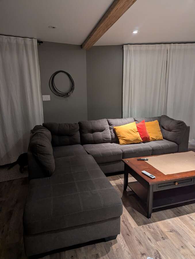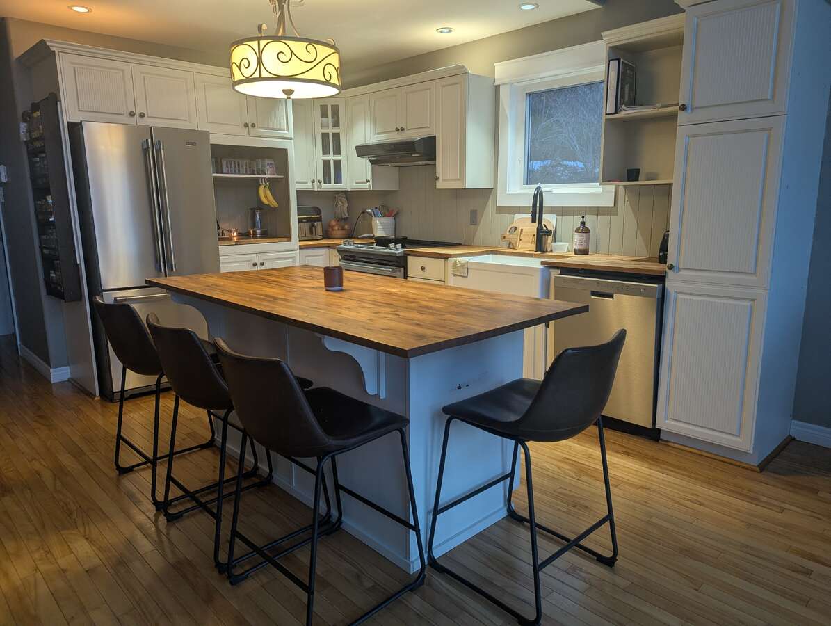 The walk-out basement has a secondary living room with a cozy wood stove as well as a cold storage room to store extra pantry staples.