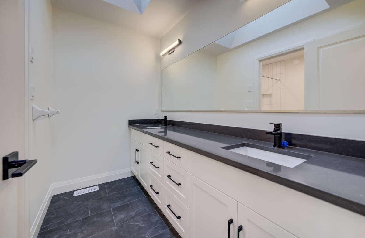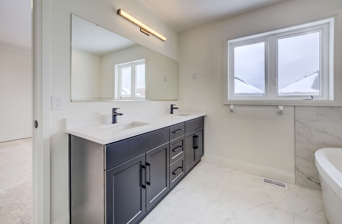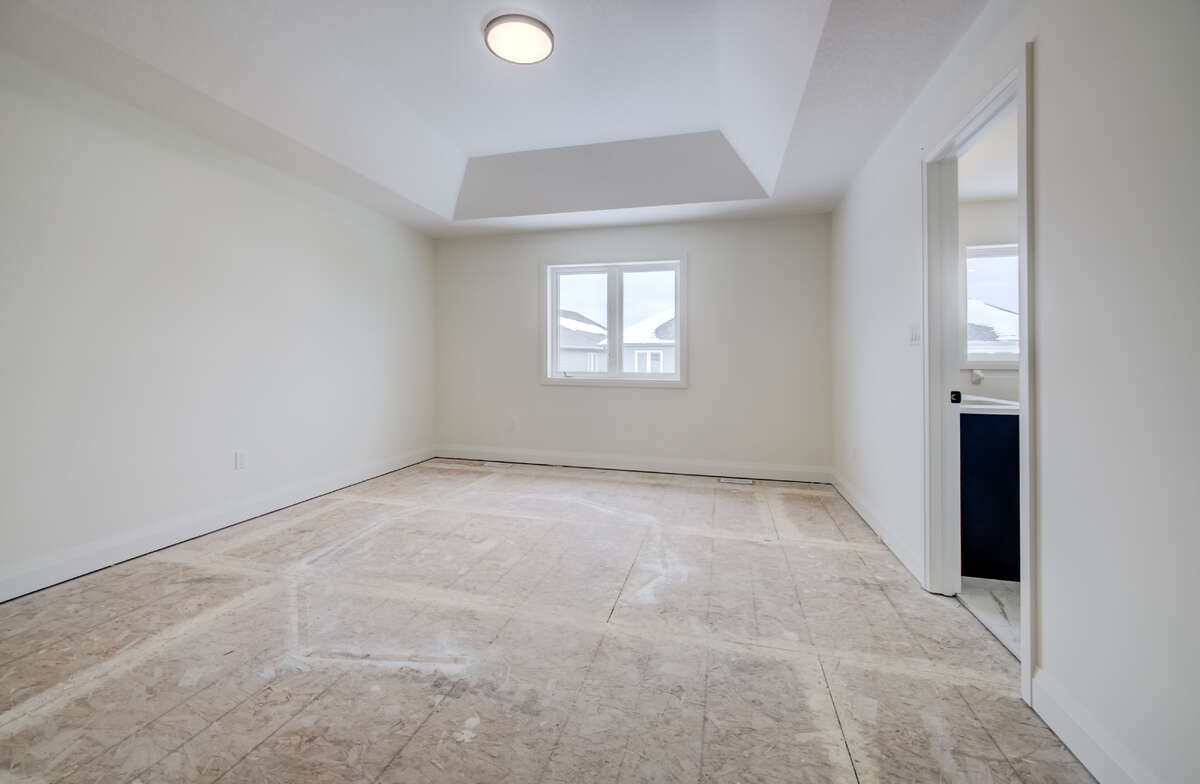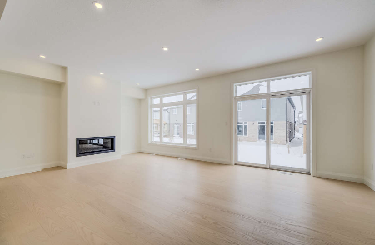 For more information on this property, please click the Brochure button. Located at 124 Grand Flats Trail in Kitchener, ON, this two-story home is 2240 finished square feet with an attached garage and a paved two vehicle-wide driveway. The upgraded stone front and entry door are a welcome introduction to the main floor open-concept design with nine-foot ceilings. The great room includes a modern linear gas fireplace, pot lights, a large window and a sliding patio door to access the rear yard. The kitchen, brightly lit with pot lights, contains upgraded white cabinetry with premium quartz countertops, a large black island with a waterfall countertop, under top cabinet lighting, a walk-in pantry and dinette area. Hardwood flooring covers the main level, except for tile flooring in the powder room. An oak staircase leads upstairs, where the second floor is brightened by a window in the landing area. This level includes four bedrooms, a main bathroom with two basins and a skylight, as well as a conveniently located laundry room. The master bedroom has a coffered ceiling, a generous walk-in closet and a luxurious ensuite with a free-standing soaker tub, a tile shower with glass door and a separate toilet room. Additional items included are air conditioning, five appliances and a chimney-style rangehood in the kitchen. This new home is move-in ready, except for second level flooring which the purchaser may select from the builder’s samples.