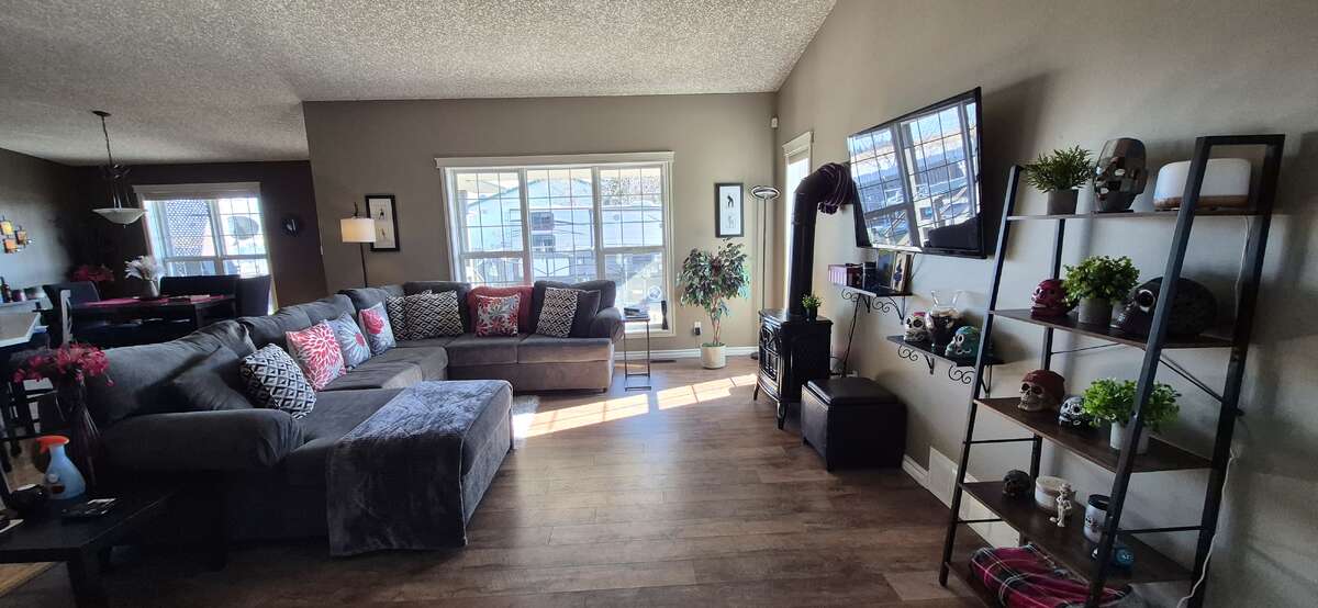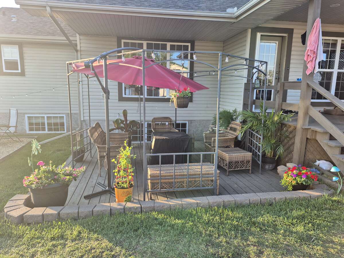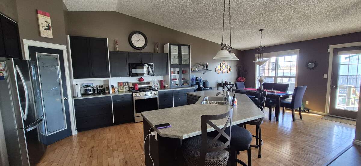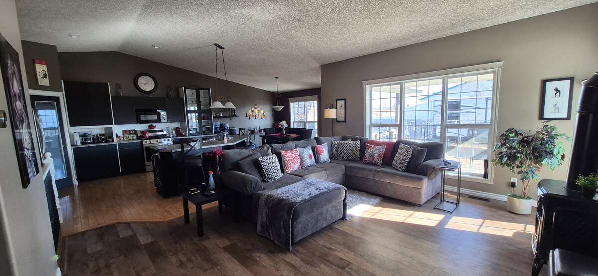 Welcome to this beautiful open concept raised bungalow. This home features vaulted ceilings, large island in the kitchen, new flooring, central vacuum, all new appliances, 2 new hot water tanks, in-floor heating in the basement and much more. There are 2 bedrooms on the main floor, open living room, huge kitchen and 2-piece bathroom. The Master bedroom has a walk-in closet and 3-piece ensuite. The fully finished basement has 3 bedrooms, large living room, 4-piece bathroom and a bathroom with a sauna. There is a flex area and a large utility / laundry room that complete the basement. The exterior boasts a covered porch on the front, covered deck in the back with a lower deck as well. The property is fully fenced and very private as it is located at the edge of town. There is a double attached garage (24x26) that has lots of storage space.
