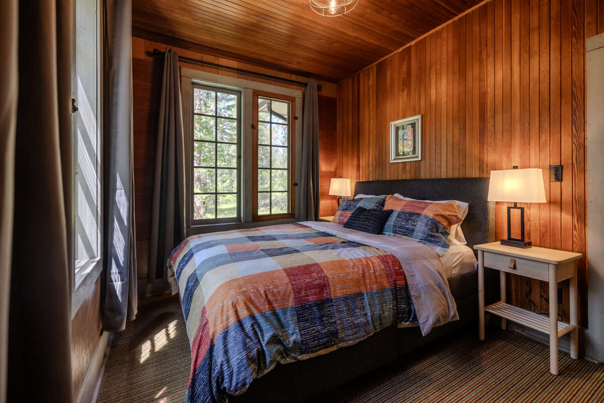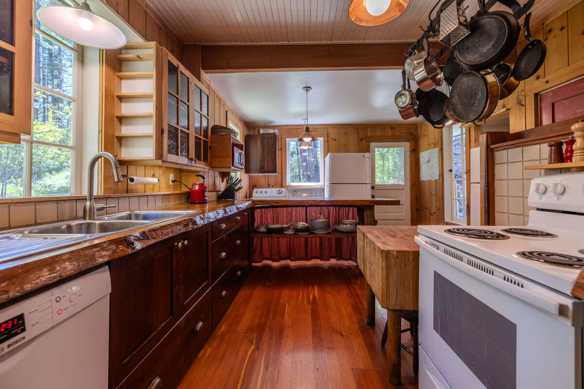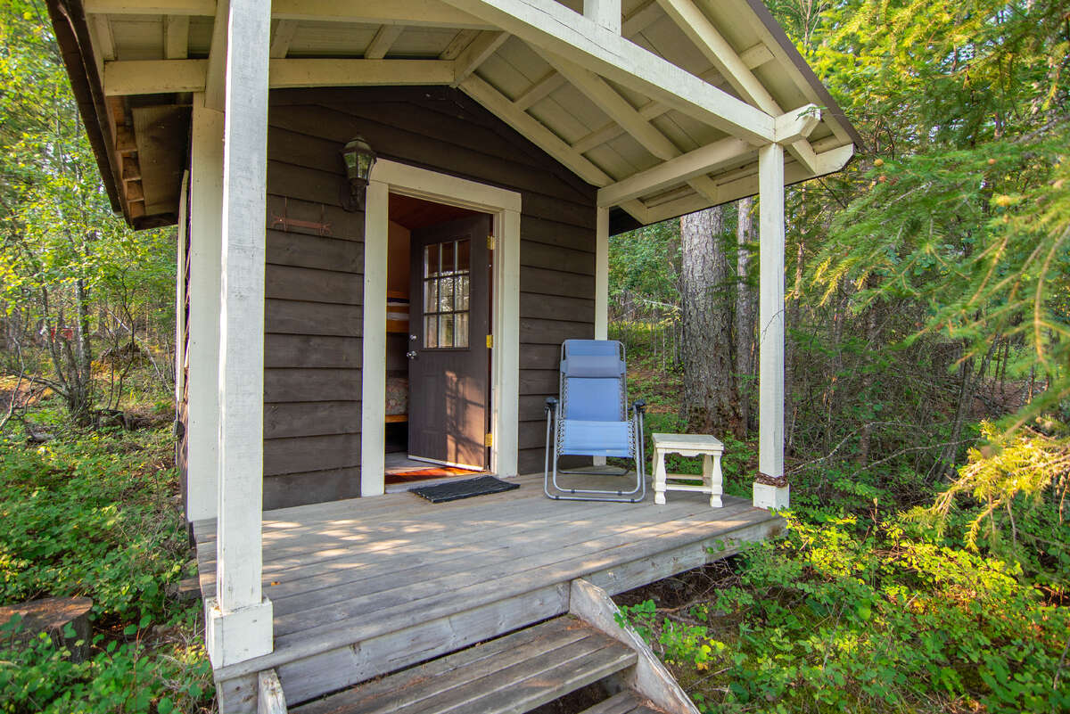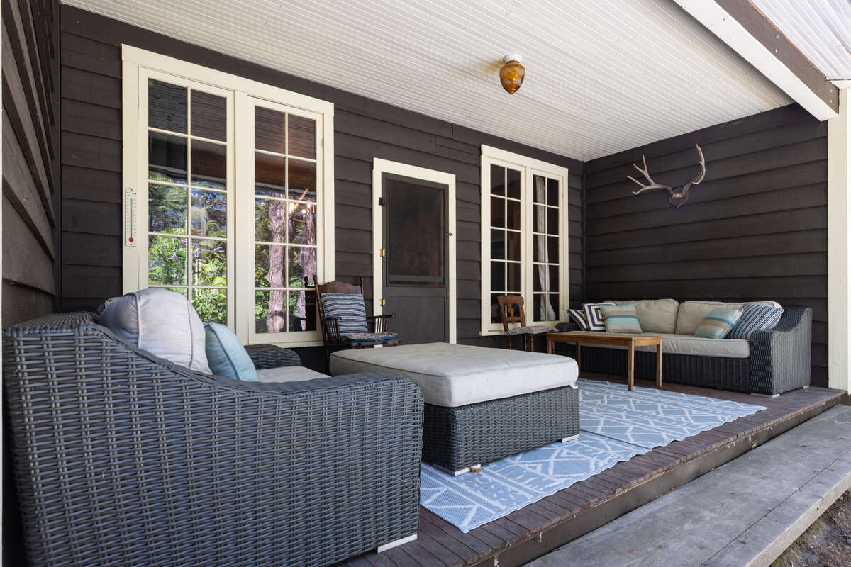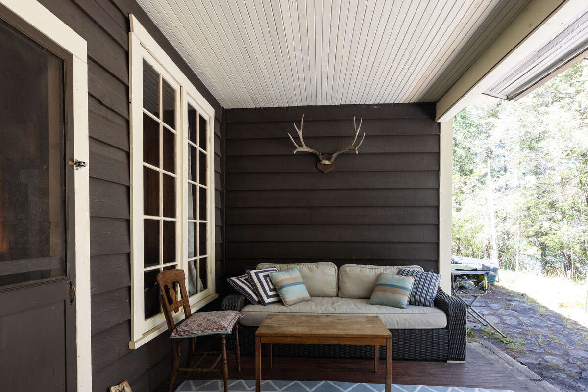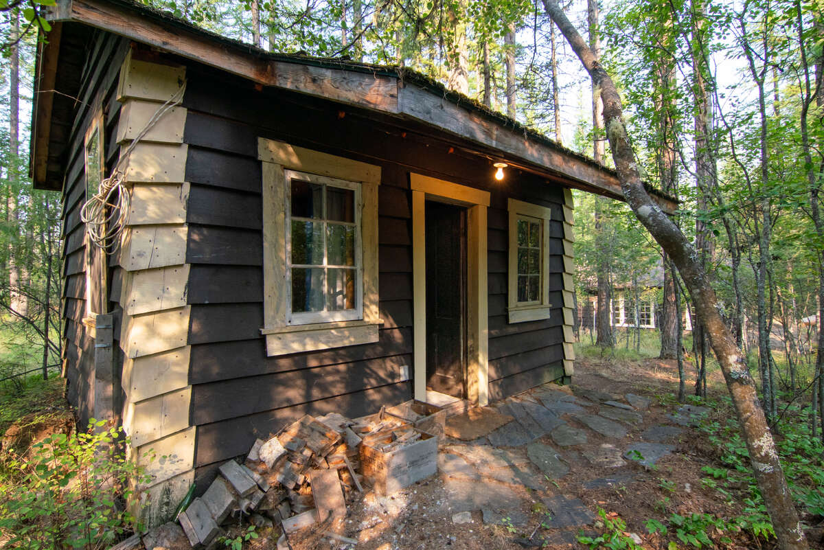 The main residence, built in 1926, is a 4-bedroom, 1-bathroom character home with spacious living and dining areas framed by lake views. A covered patio overlooks the water. Three additional sleeping cabins on the property provide flexible guest or rental accommodation, each with electricity and heat. A separate outbuilding offers storage and a half bath.