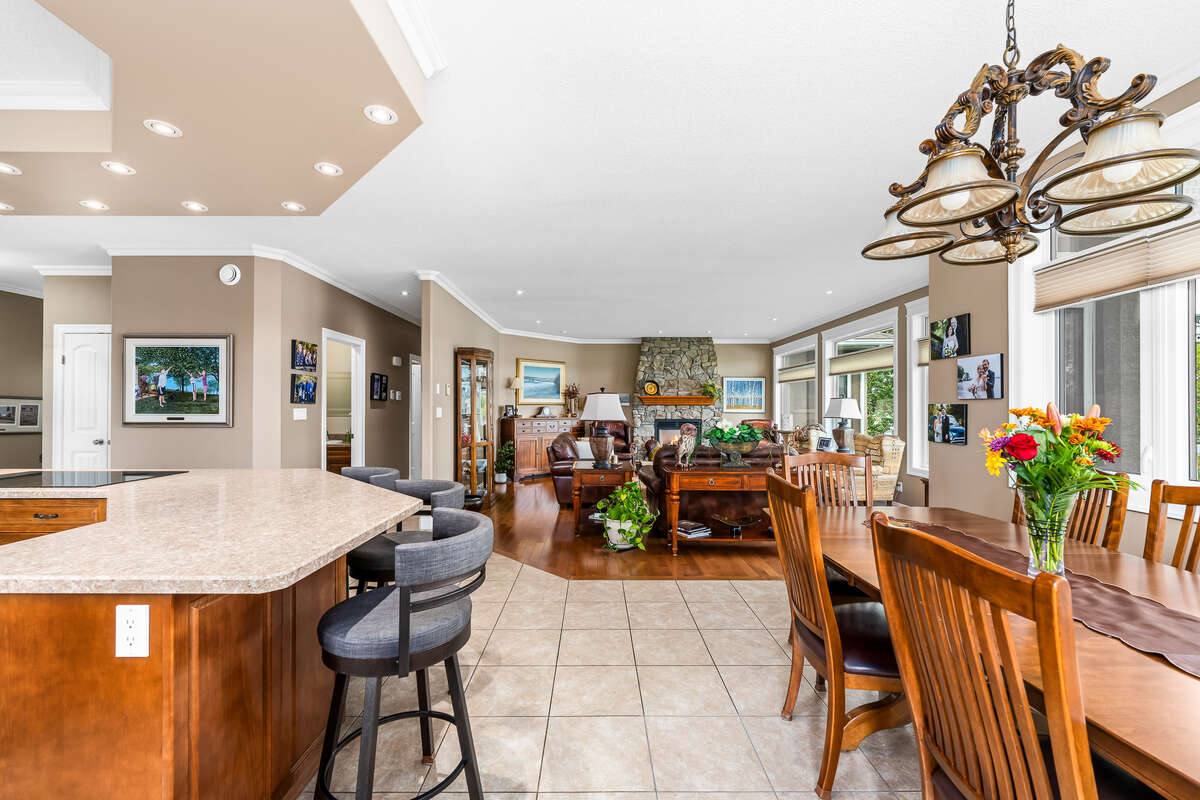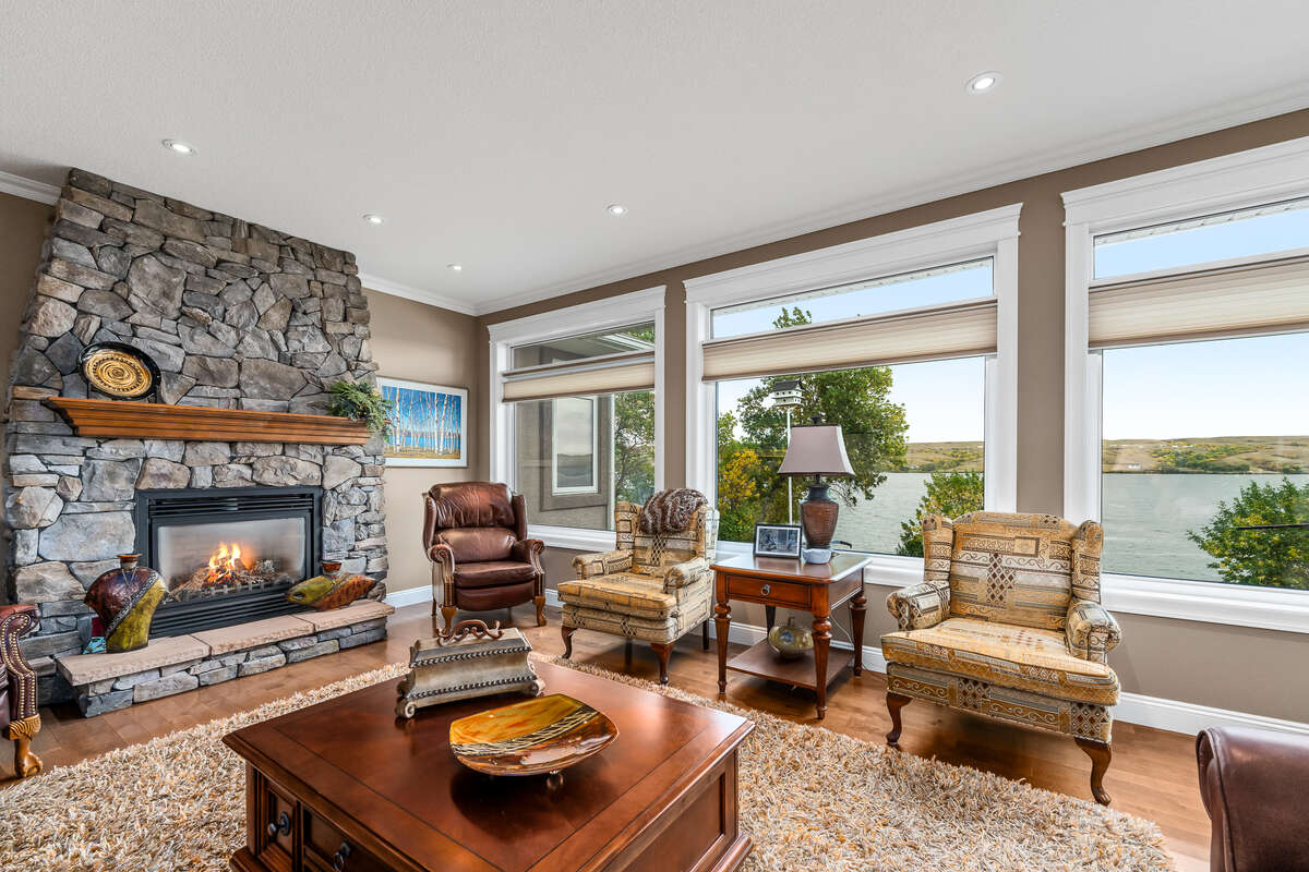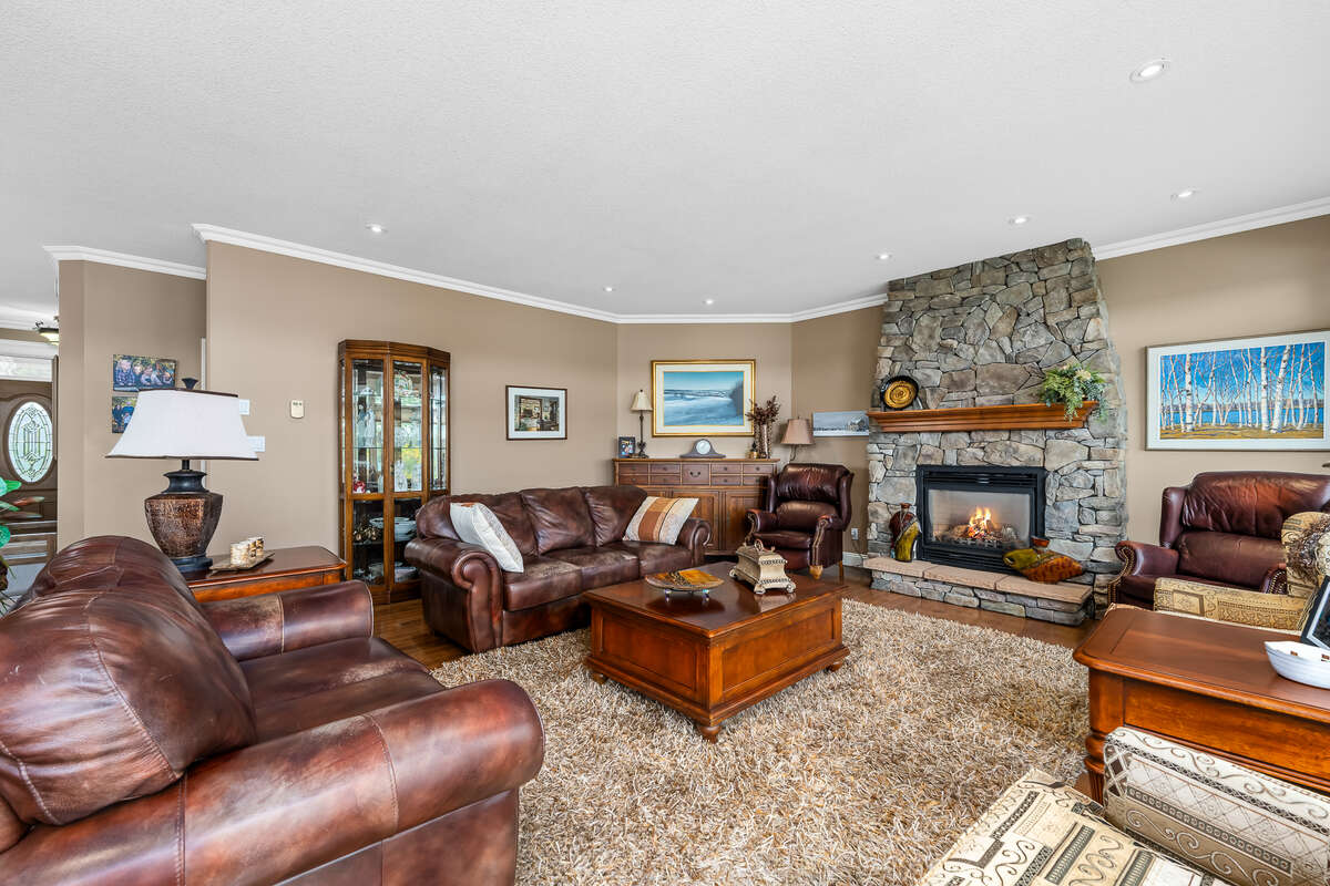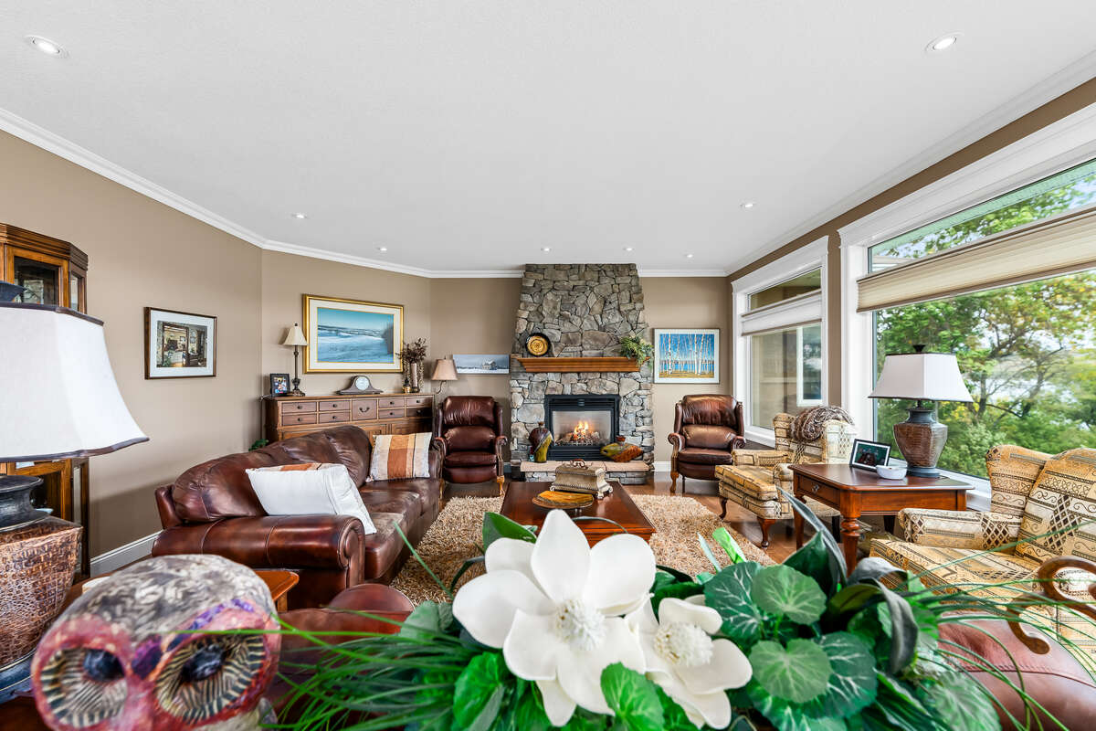 The elegant living room features a dramatic stone-accent fireplace, windows that frame the stunning landscape and premium Mirage engineered hardwood flooring throughout the main living area. Crown moulding adds sophistication to the upper level.