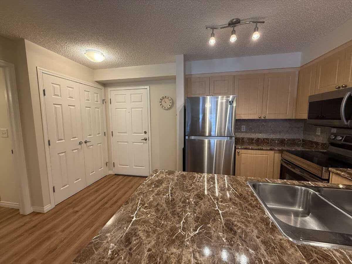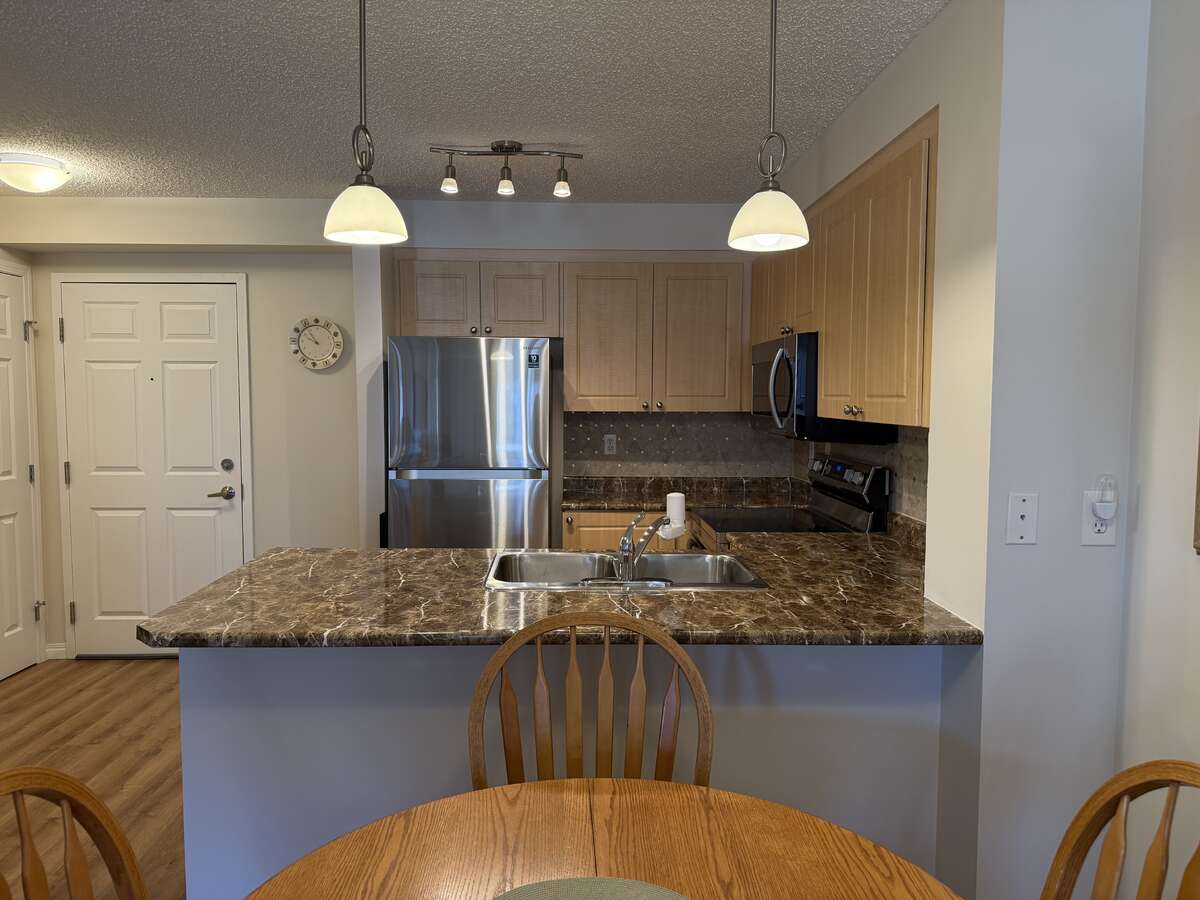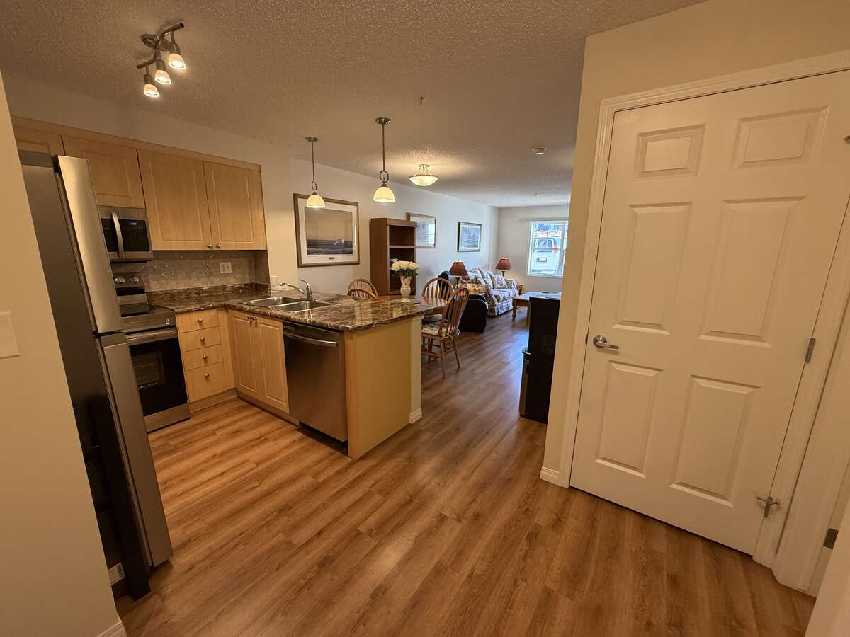 DISCOVER YOUR DREAM HOME! MOVE IN READY! Immaculate, Spacious and Inviting condo on main floor. Desirable location, only minutes to all amenities: Anthony Henday, grocery & liquor stores, banks, gas stations, dollar store, fast food stores, schools, public transportation and many more! BUILDING has recently UNDERGONE major renovations (2024) new roofs, balconies, new carpet and paint. Other features include a patio with gas hook up, HEATED UNDERGROUND assigned parking stall (conveniently located close to unit), newer Samsung stainless steel kitchen appliances, newer Whirlpool stackable washer/dryer combo, laminate flooring throughout with no transitions, & is PET FRIENDLY! MONTHLY CONDO FEES: $437 INCLUDES ALL UTILITIES! FURNITURE IS INCLUDED!