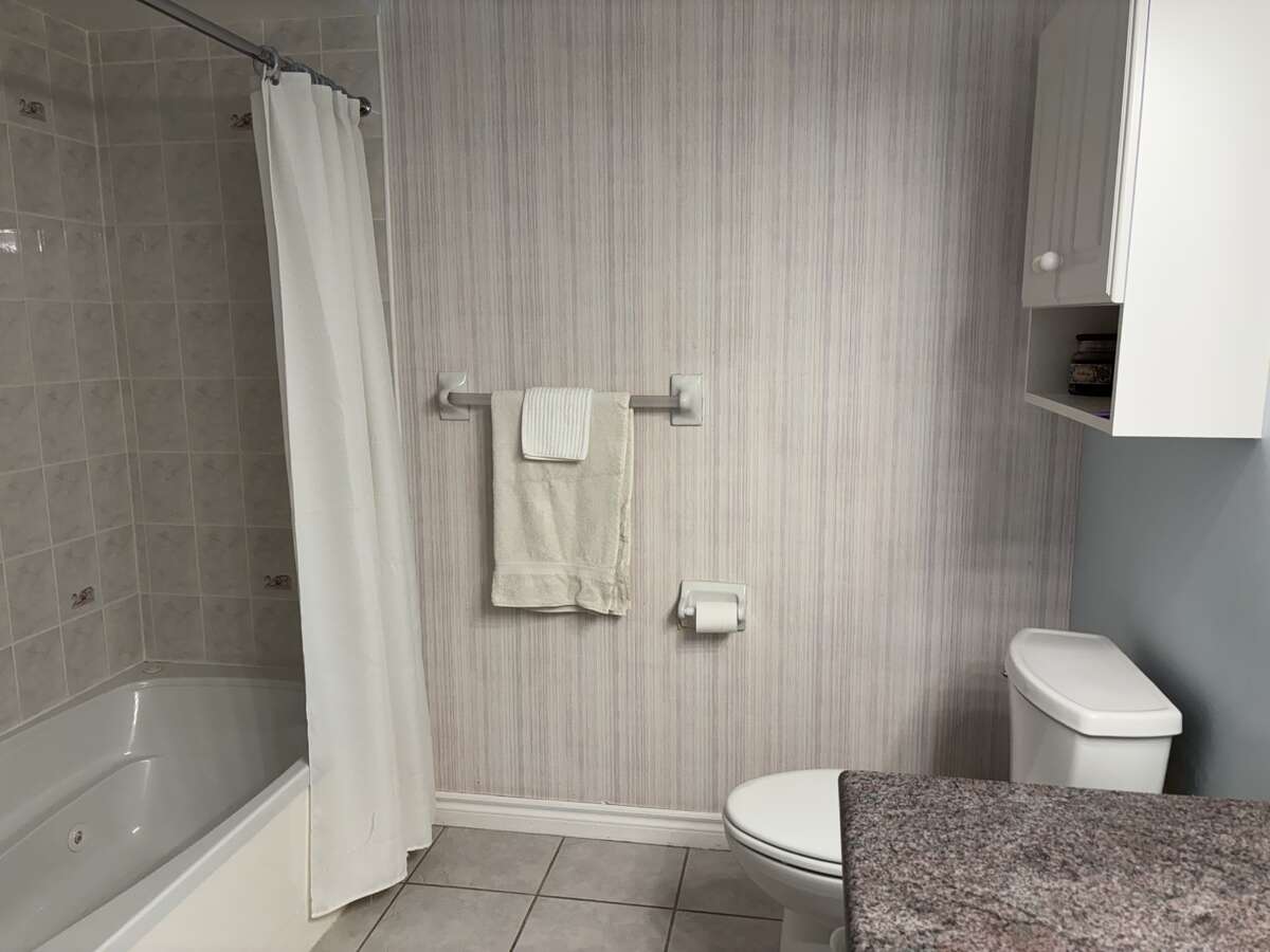 The clean, white eat-in kitchen offers updated flooring and space for a small table—perfect for morning coffee. Both bedrooms are generously sized with large closets, providing excellent storage. The unit includes two full bathrooms: one with a tub/shower combo and a second with a walk-in shower for added convenience, a laundry/utility room and extra storage.