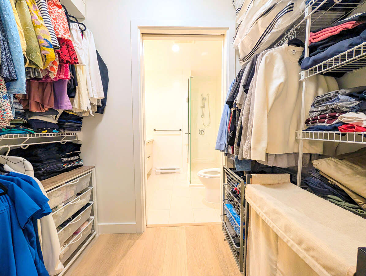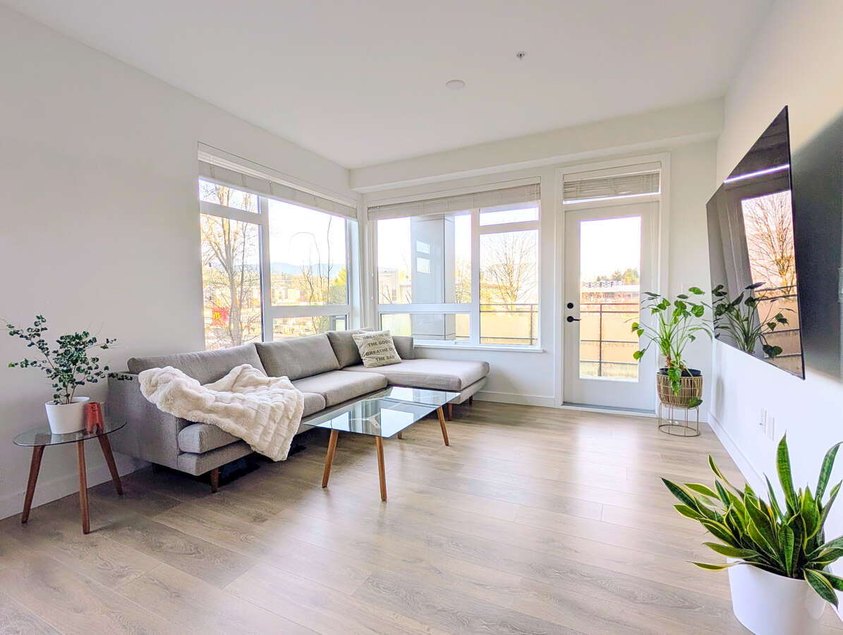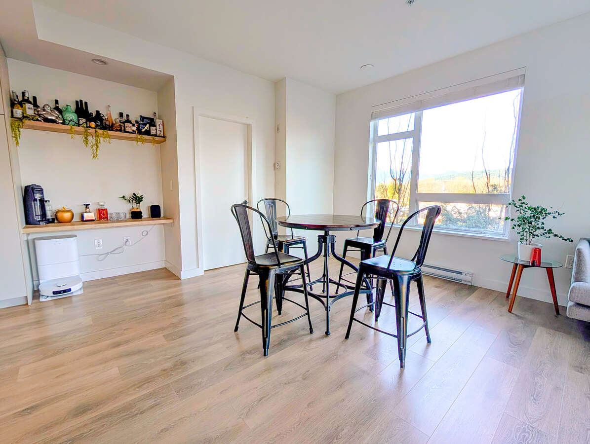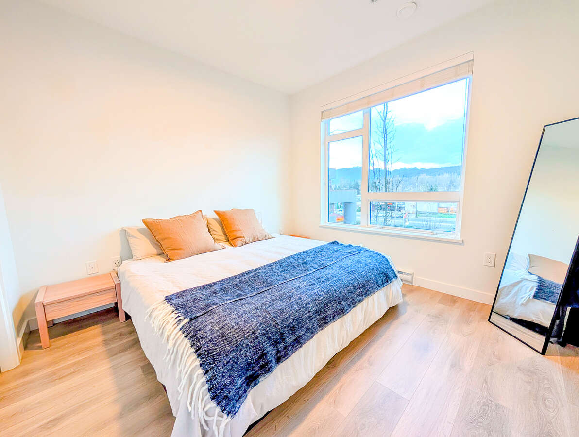 Welcome to The George by award-winning Marcon. Just a 5-minute walk to SkyTrain and West Coast Express, one of Port Moody's best transit locations. This bright corner home offers open concept living with laminate wood flooring throughout. The modern kitchen features quartz countertops, full sized S/S appliances and soft-close cabinetry flowing into a spacious living and dining area with high ceilings. The primary bedroom fits a king sized bed and ensuite with double vanities, while the second bedroom is well-separated for privacy. This home comes with 1 EV ready parking and 1 large storage locker. Amenities include a club house, dog wash, car wash, EV Level 2 charging, workshop, bike and kayak storage.