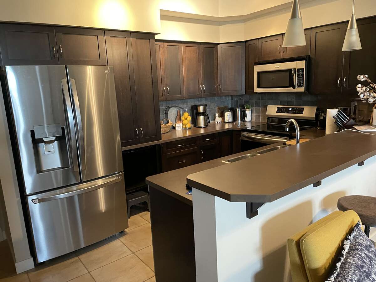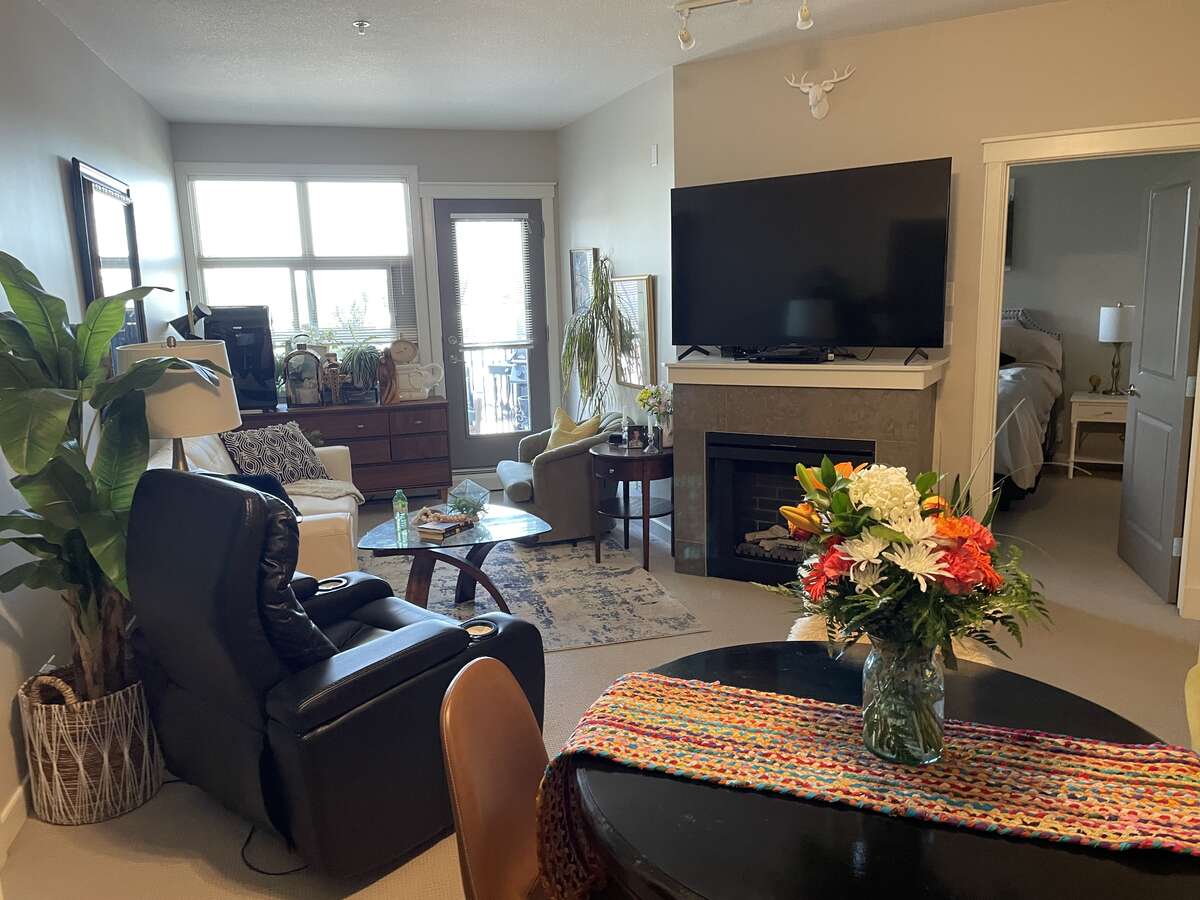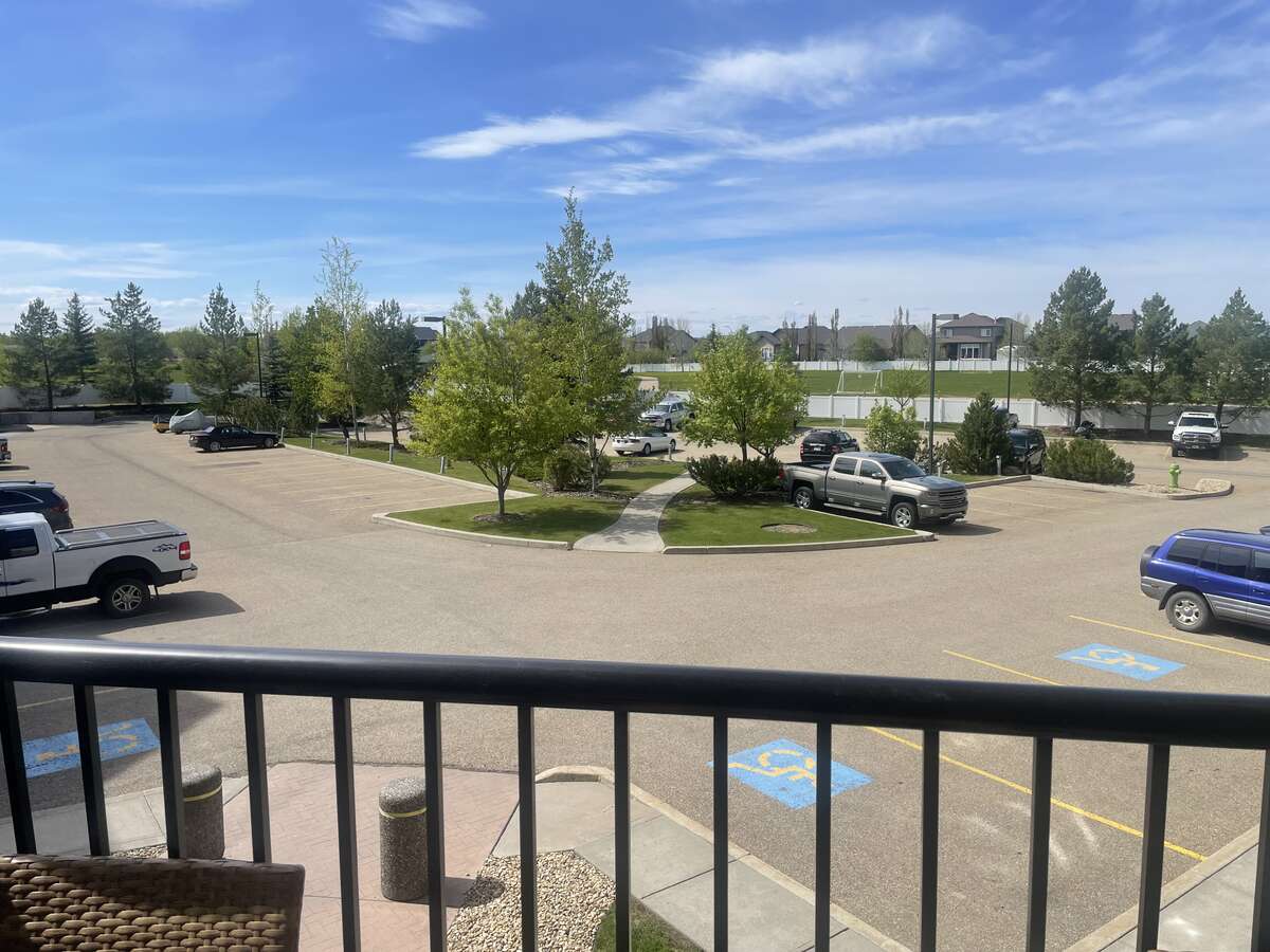 2 bedroom + den, second-floor unit close to elevators located in Sylvan Lake! Open concept with 9-foot ceilings, private deck c/w new natural gas barbecue, under-counter reverse osmosis water filter. With new light fixtures and ceiling fan. The kitchen has dark cabinets complemented by all-new high-end kitchen appliances. The Induction Range has a convection oven with air fry option. There is a 4-piece ensuite and a walk-through closet in master bed room. This condo is situated across from a gas station, daycare center, and the unit includes 1 underground heated parking stall with a private storage area, plus 1 above ground parking stall close to the front entry doors. Other features include a exercise center, high-speed elevators, and a security system within the building. Condo fee includes, on-site property manager, hot water baseboard heating, water, sewer, garbage, snow removal, and large reserve fund. One small pet is allowed with board approval. Our unit is pet-free and has never been smoked in. Showings can be arranged on short notice. Room sizes are not exact because of some of the angles and should be confirm.