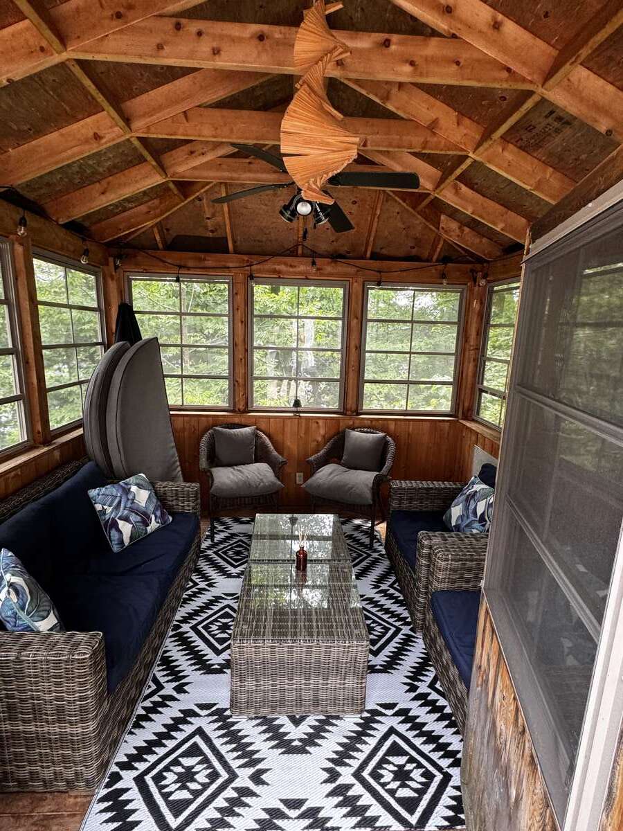 - Screened-in gazebo, large outdoor dining area, multi-level decks