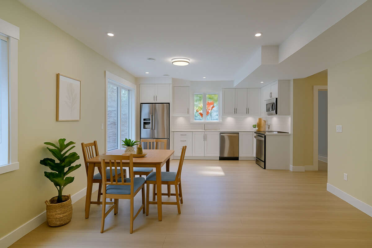 The private, forest-backed yard provides a peaceful retreat, perfect for morning coffee or evening BBQs. Durable 72-hour wet laminate flooring in high-traffic areas ensures long-lasting beauty and function.