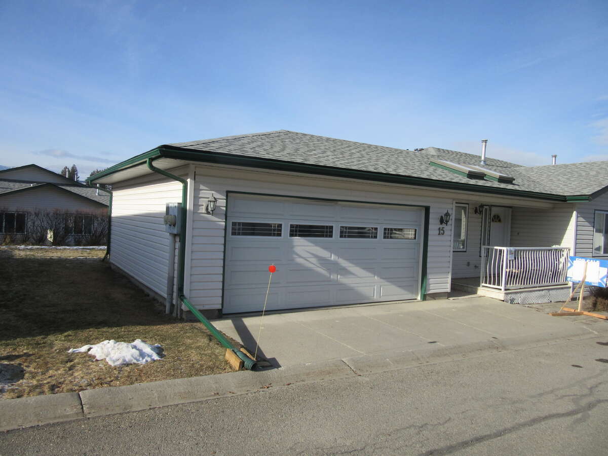 The Gated well managed Seniors Strata Property has 30 Townhomes in 15 buildings, 1 block South of the Cranbrook Regional Hospital. Cranbrook Golf Course is all along 24th avenue on the East side of the property. This bright Strata Home is located in the center of the homes, a very quiet, private and safe setting. Home #15 has a Double car Garage and sunny rear deck w/ Gas bbq hookup, extra RV and boat parking Lot, included. Very roomy 2 Bedroom Main Floor, Wheelchair accessable with 36" interior doors. A large bright Oak kitchen and breakfast area, w/butcher Block counters and new stainless appliances incl. gas gridle stove w/air fry oven. Living/Dining room 14'9" x 21'8" with Natural gas fireplace. Primary Bdrm 12' x 13'9" with walkthru Closet and 4 piece Ensuite. Second Bdrm 12' x 13'10" w/9' closet. Main Bathroom w/shower and side by side Laundry Closet. Lower Level is not completely finished and has a Den/Office 12' x 12'6". Theatre Room 12' x 14', Sewing/Hobby Room 10' x 10'9". Plumbing roughed-in, Spa Bathroom 9'8" x 12'. Hobbyshop area 14' x 15' with direct access stairs to the Garage, Huge Tool storage room 12' x 23' with recent Gas furnace and Hot Water Tank. Lots of space that can be used for storage.