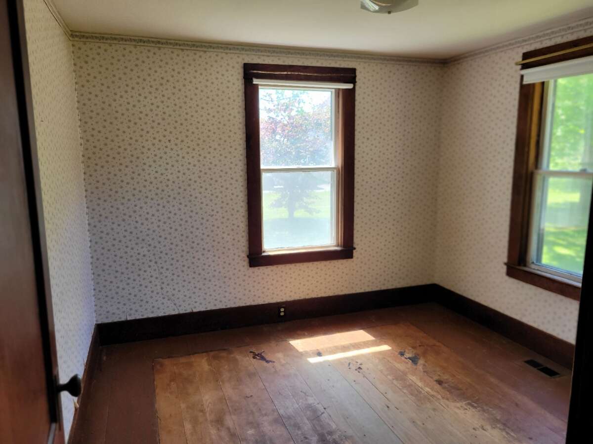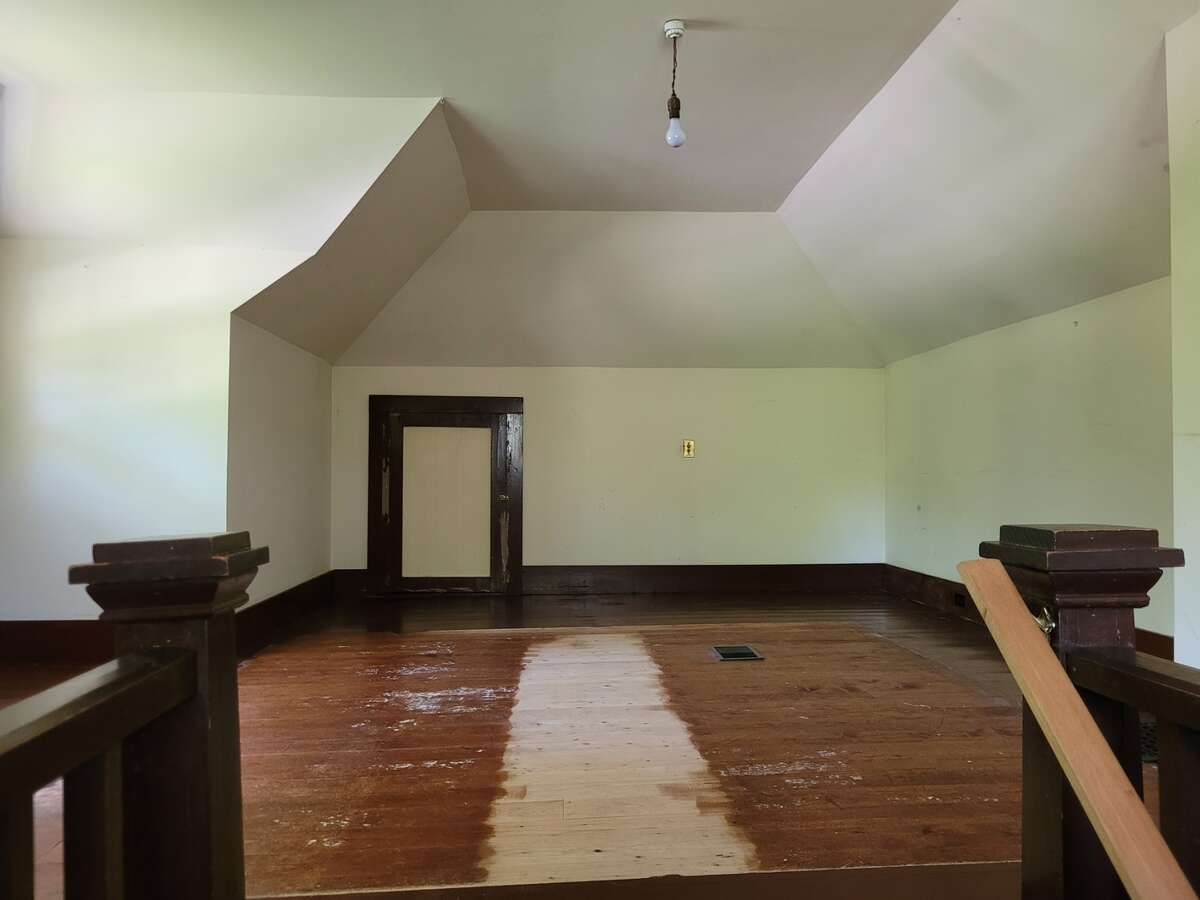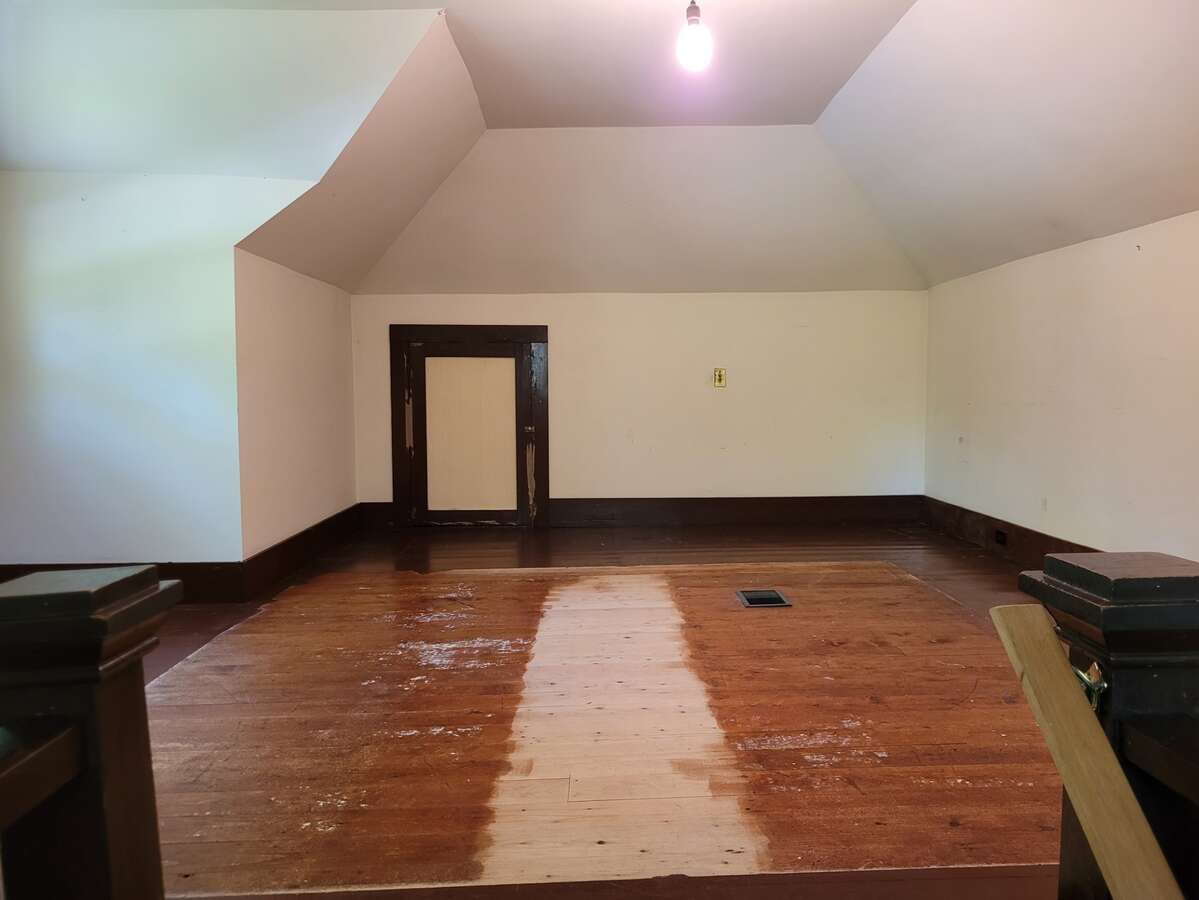 Three bedrooms – one large upper-level room with attic storage, plus two bedrooms on the main floor
