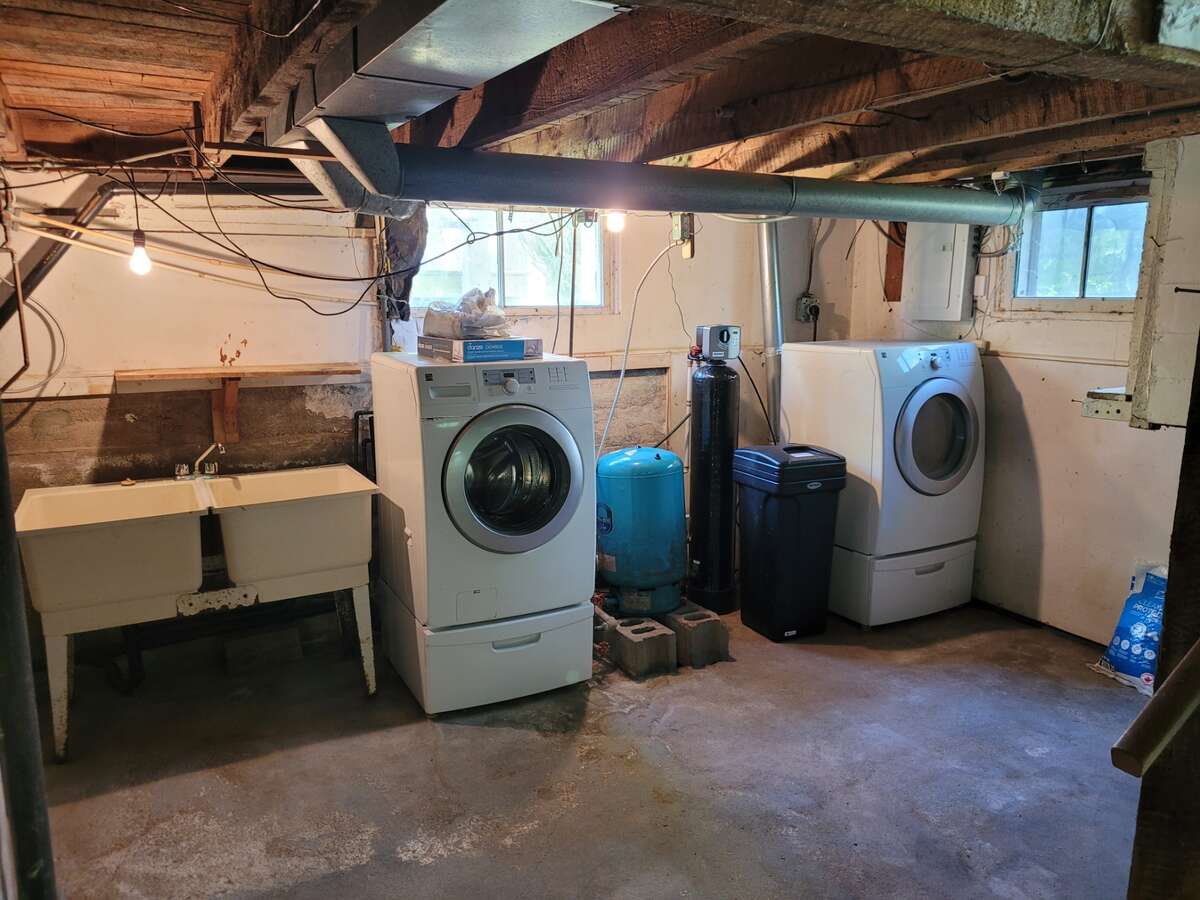 Unfinished full basement with washer, dryer, deep freeze, workshop area, and ample storage