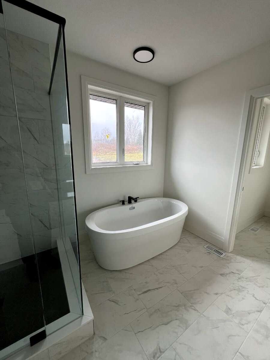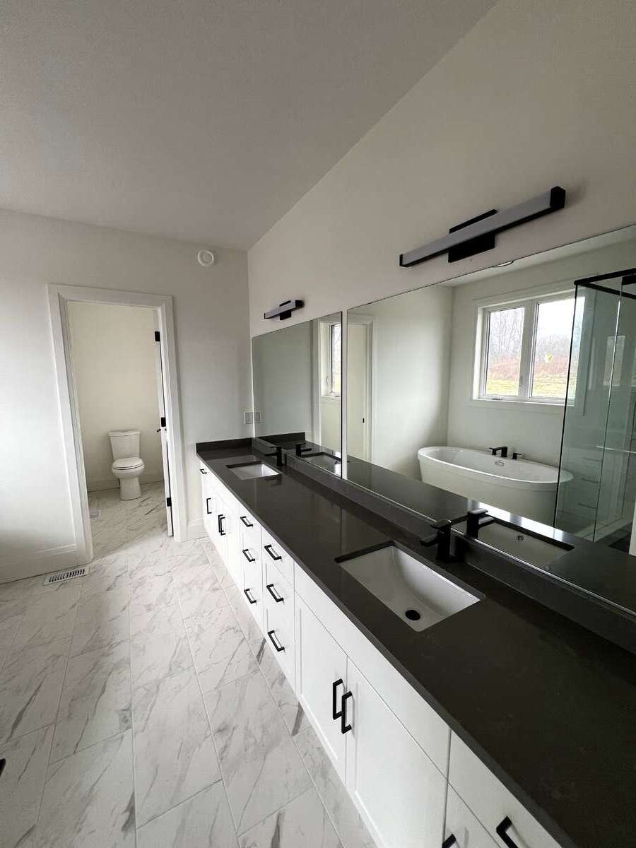 The home offers 4 bedrooms and 3.5 bathrooms, including a luxurious primary suite. The primary bedroom boasts a stunning ensuite with a freestanding tub and an expansive 19-foot walk-in closet. Additional highlights include a large mudroom, a second walk-in closet, and upgraded quartz countertops paired with sleek black Moen plumbing fixtures throughout.