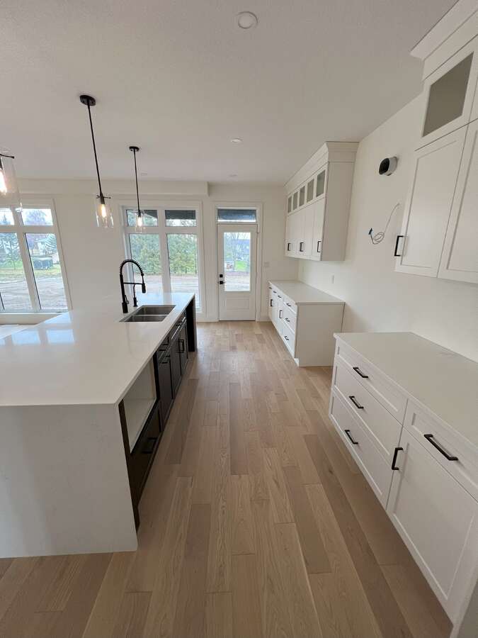 Step into the grand 2-storey foyer and experience the sense of space created by soaring 9-foot ceilings on the main floor, complemented by rich upgraded hardwood flooring and an elegant oak staircase. The heart of the home is the expansive kitchen, thoughtfully appointed with custom cabinetry, a large walk-in pantry, and a striking waterfall island – perfect for casual dining or gathering with guests.