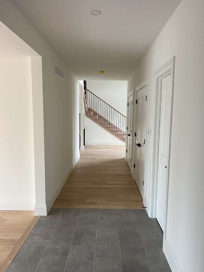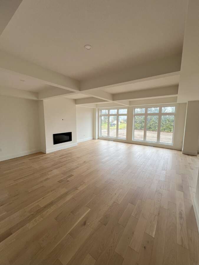 The open-concept great room boasts a sleek modern linear fireplace, creating a warm and inviting atmosphere. A versatile den on the main floor offers the perfect space for a home office or study.