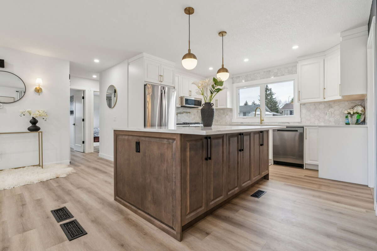 Welcome to this Custom Fully Remodelled Luxury Bungalow on a massive lot in the heart of Braeside. This stunning home boasts impeccable curb appeal with every detail finished to the highest quality. The exterior features new Hardie board siding, new Concrete landscaping with a grand entrance front deck area. As you step inside you are greeted with an abundance of natural light from the new oversized windows. The spacious and bright open concept floor plan features Premium 7" wide Luxury Vinyl Plank flooring that flows seamlessly throughout the main floor complimented with a modern wood burning Glass Fireplace. The new chef’s inspired gourmet kitchen is a true centrepiece featuring New S/S Appliances, Quartz Countertops with an Elegant Hexagon Marble backsplash and a massive Island with double functional storage on either side. Custom Solid Wood Maple Cabinetry compliments the kitchens, bathrooms, and entry way throughout the entire home. Adjacent is a generous dining area perfect for family and friend gatherings. The spacious master bedroom oasis retreat features a new oversized window. A custom 4 Piece ensuite with double sinks, an oversized Luxurious shower and walk-in-closet. Also, all bedrooms are furnished with custom closet solutions which significantly increase storage and functionality. Additionally, the main floor boasts 2 more spacious bedrooms, an elegant 4 piece main bathroom with floor to ceiling cabinetry for added storage with an upstairs laundry for convenience. The lower level has a separate entrance with an (illegal) fully finished basement suite which includes; a full kitchen with S/S appliances, 2 generous sized bedrooms, oversized new windows and a gorgeous 3-piece bathroom complimented with a secondary laundry facility. Additionally, there is a new 2 stage high-efficiency furnace and 60G high-efficiency hot water tank. There is side yard access for vehicle entry into the massive backyard featuring a patio area with a custom fire pit. Don’t miss out on this exceptional beautiful property that combines luxury and functionality in a prime location.