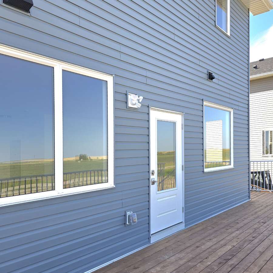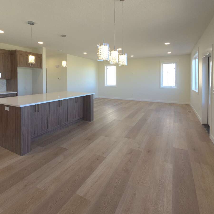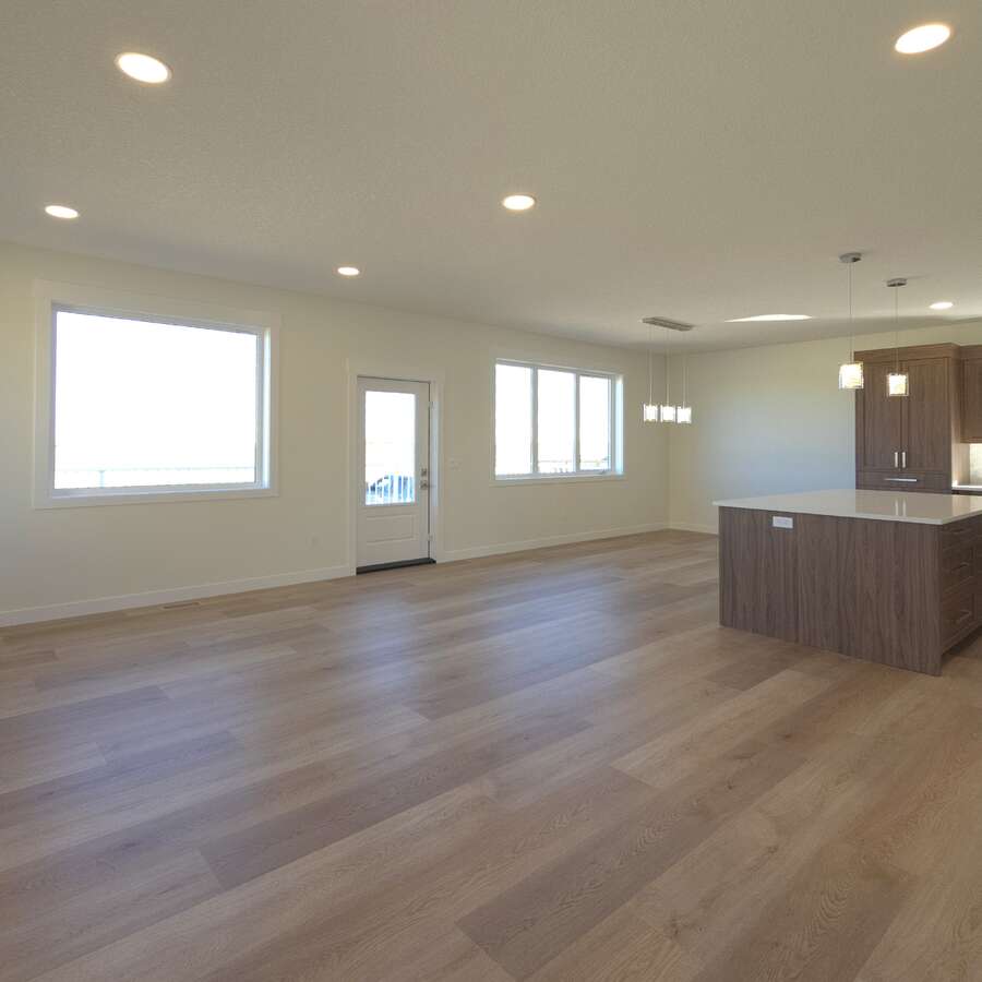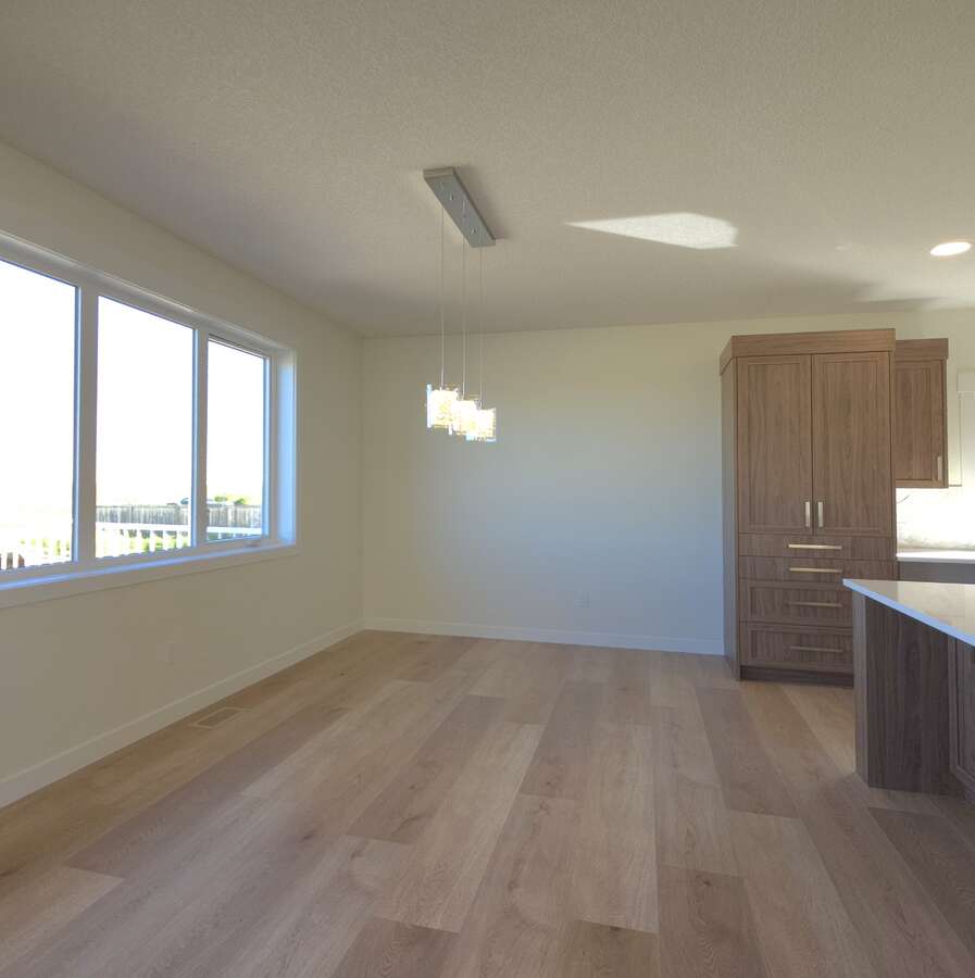 The main floor, facing north, opens into a combined kitchen, dining and living room area with nine foot ceilings. With the big, blue sky on display out the back windows the prairie offers up an undeniable feeling of wide open space.