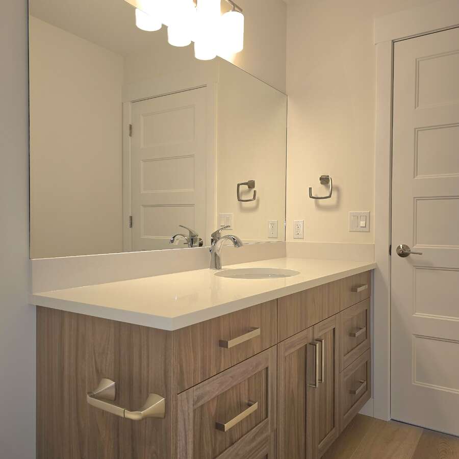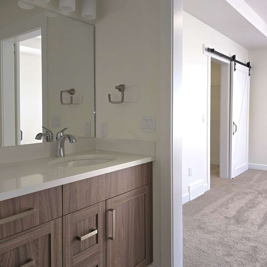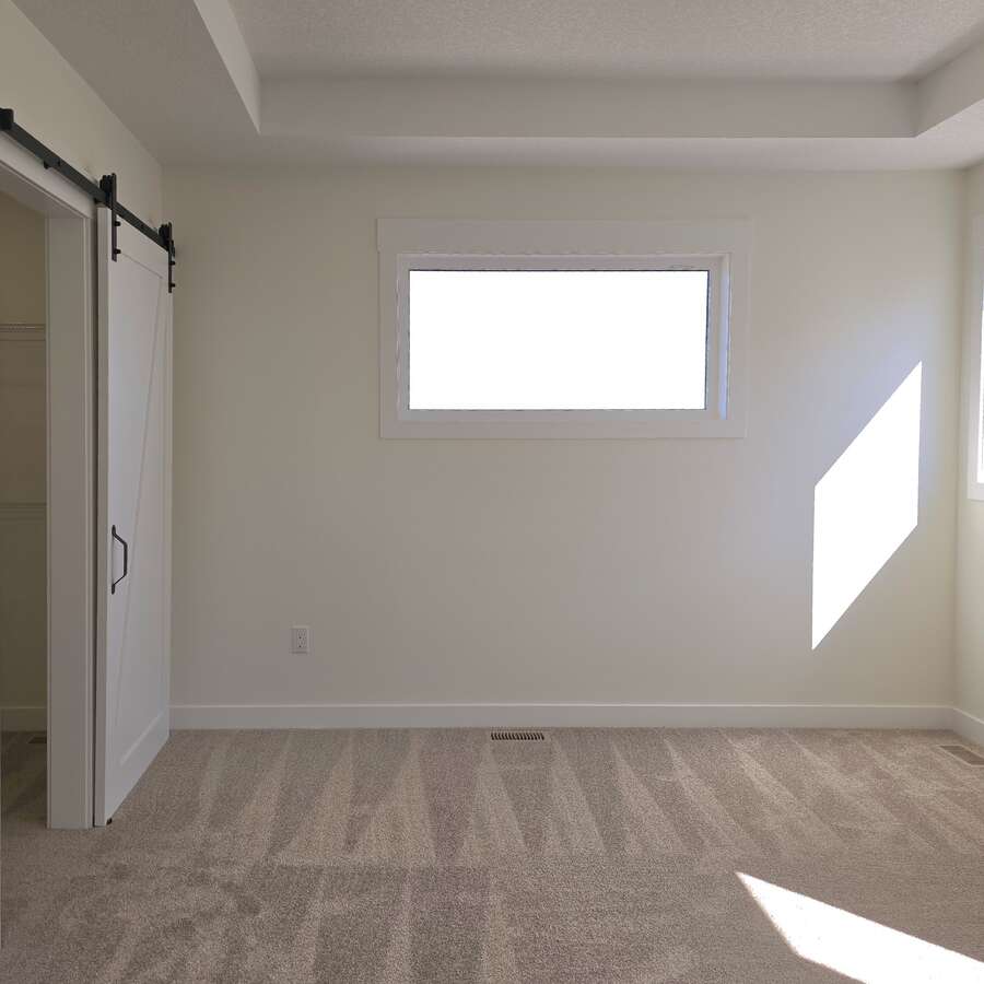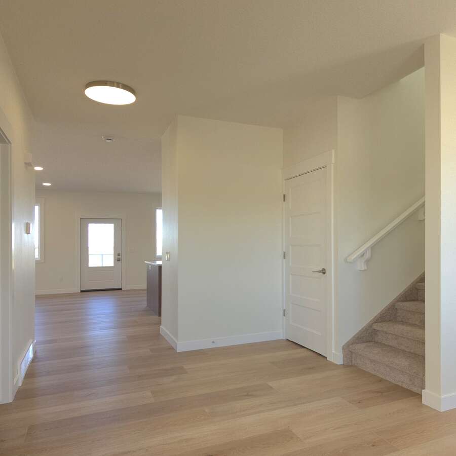 The main floor, facing north, opens into a combined kitchen, dining and living room area with nine foot ceilings. With the big, blue sky on display out the back windows the prairie offers up an undeniable feeling of wide open space.