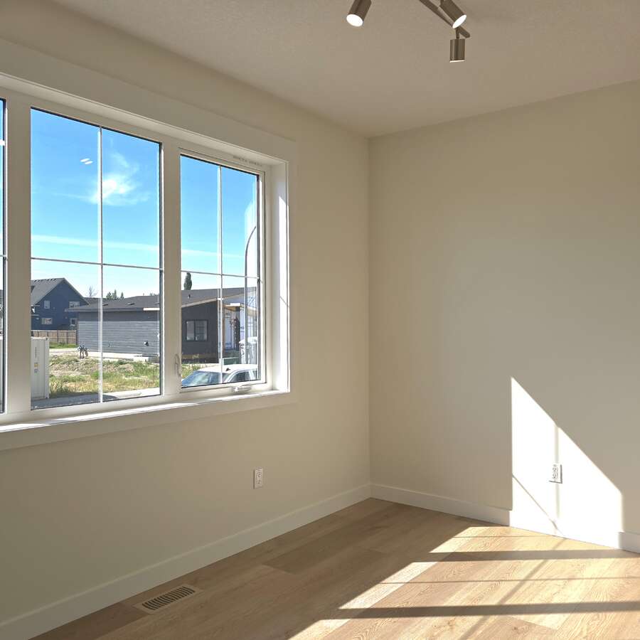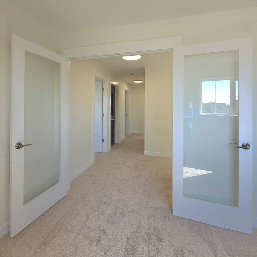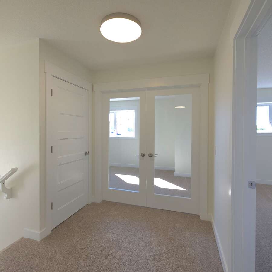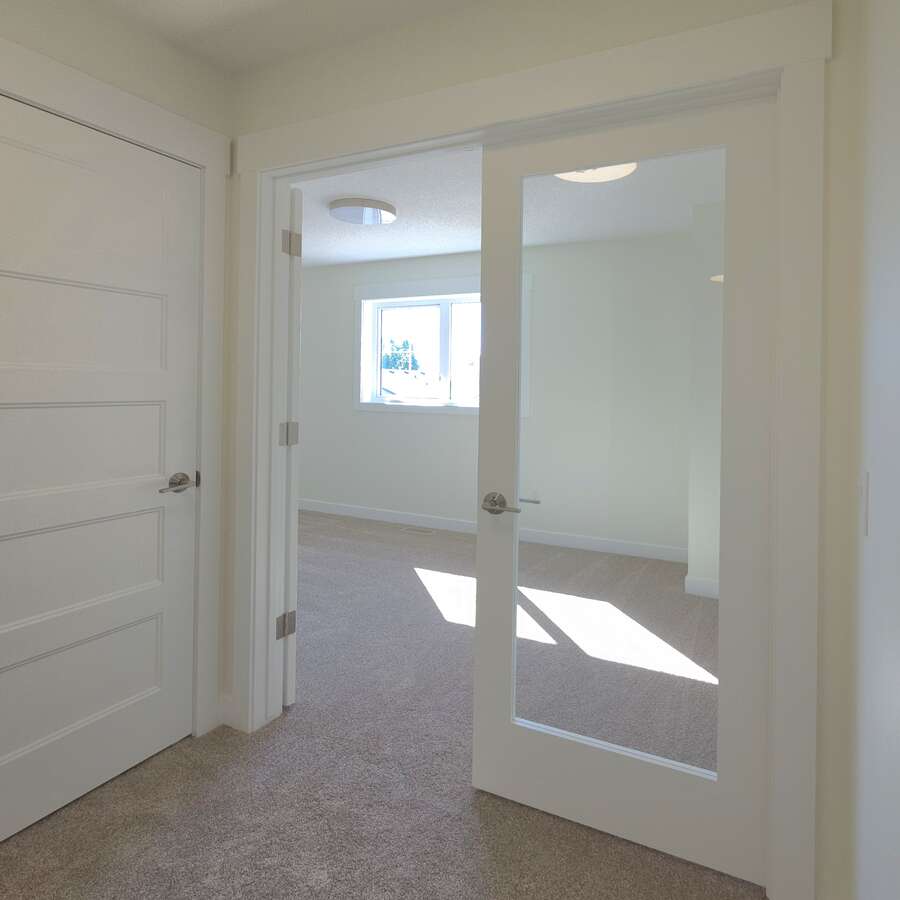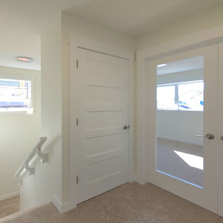 Upstairs there are four rooms, 1 primary bedroom with walk-in closet and ensuite, 2 secondary bedrooms alongside a full bathroom, and 1 south facing flex room with double glass doors, that once again allow sunlight directly into the upstairs.