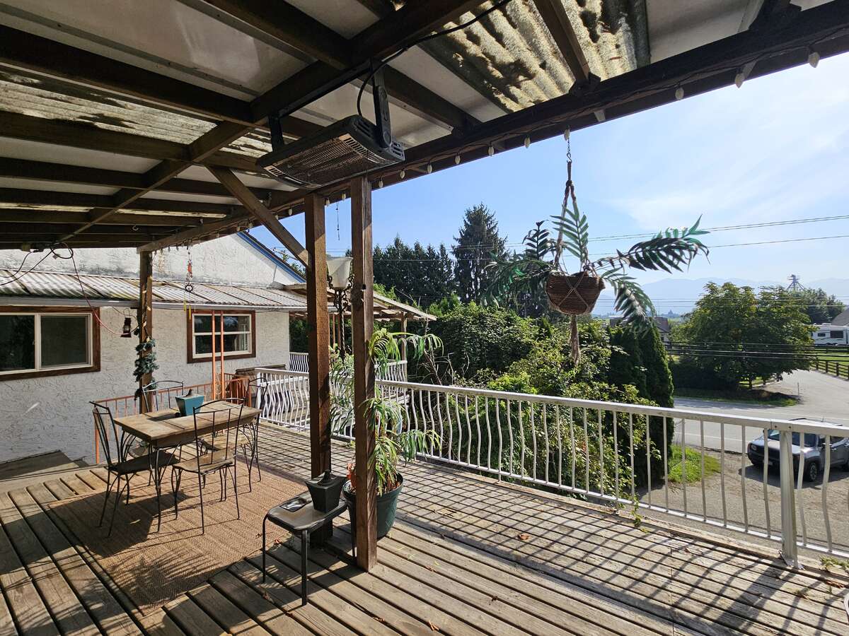 Freehold detached home, no strata, minutes from downtown amenities. This 2 bedroom + den, 1.5 bath, 1483 sqft detached home is just under half an acre and backs onto the base of desirable Little Mountain. This home has sweeping south facing views of Chilliwack valley towards Promontory. This gated driveway has a 1.5 car detached garage and driveway space for 8 vehicles. The second level patio space sprawls over 600 square feet. This home has no neighbours directly behind or to the east. Built in 1936, this home requires some TLC but at its pricepoint could easily be flipped, fresh water plumbing has already been upgraded to PEX. With huge hedges to dampen sound from the roadway this home boasts a brand new rubber shake roof with 50 year warranty, 4 year old shingles on the detached garage, 4 year old water heater, and new electrical outlets throughout the home. With separate side entrance, above ground basement has secondary suite potential. The upper portion of the property links up to and is accessible from Latimer Road.