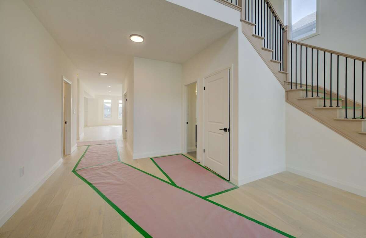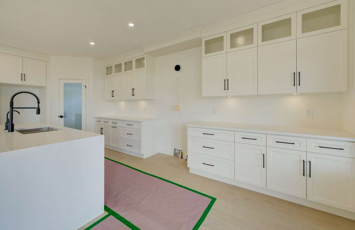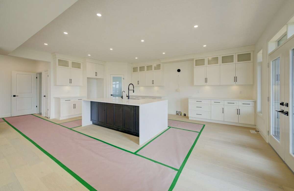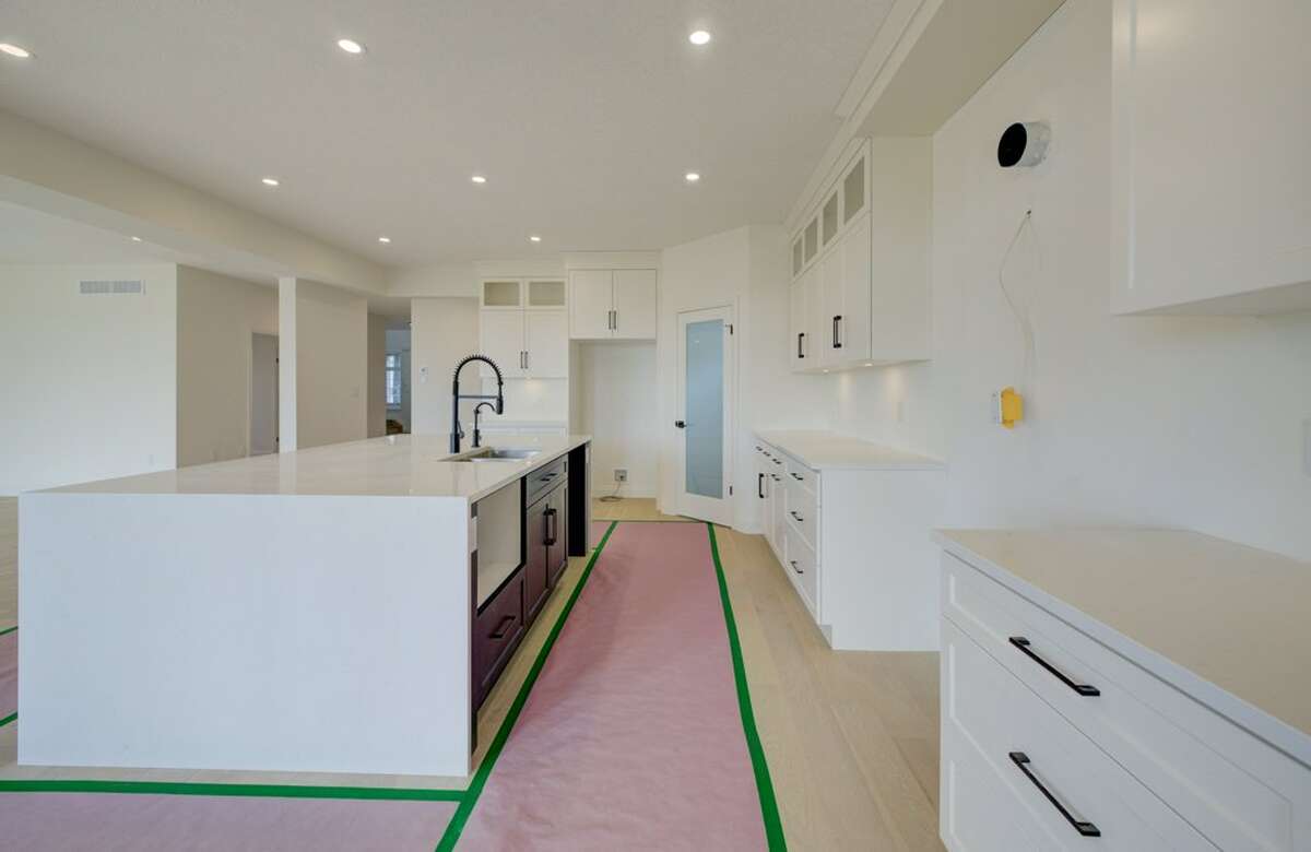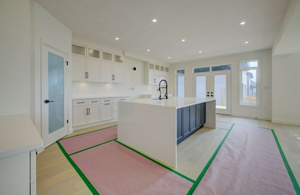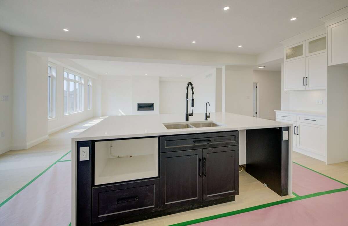 Step through the impressive two-storey foyer and into the expansive main floor featuring 9-foot ceilings and upgraded hardwood flooring throughout. The heart of the home is the chef-inspired kitchen, showcasing custom cabinetry, a massive island with a dramatic waterfall quartz countertop, and ample storage – ideal for entertaining or everyday living.