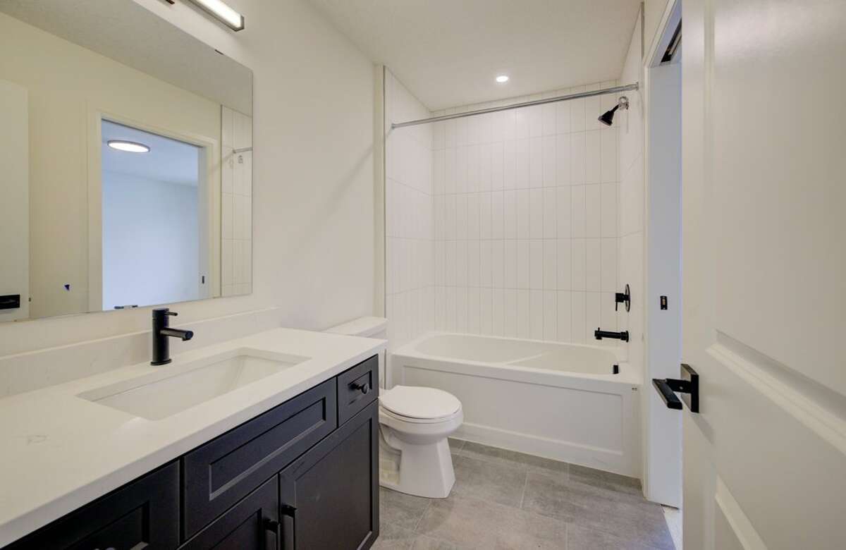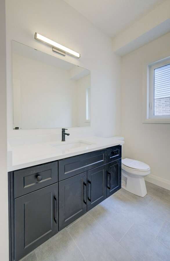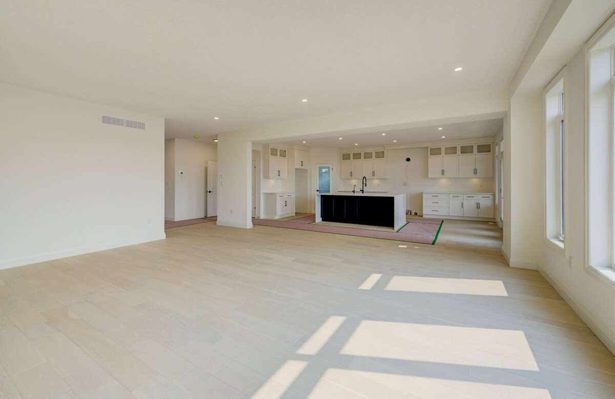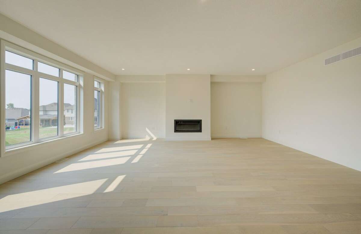 The open-concept layout flows seamlessly into the grand great room, where a sleek, modern linear fireplace creates a warm and inviting atmosphere. A versatile den on the main floor offers the perfect space for a home office or library.