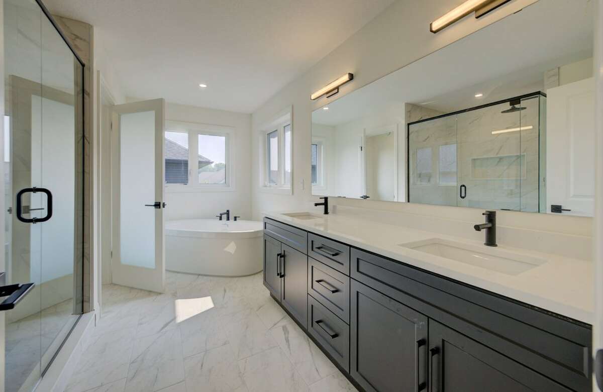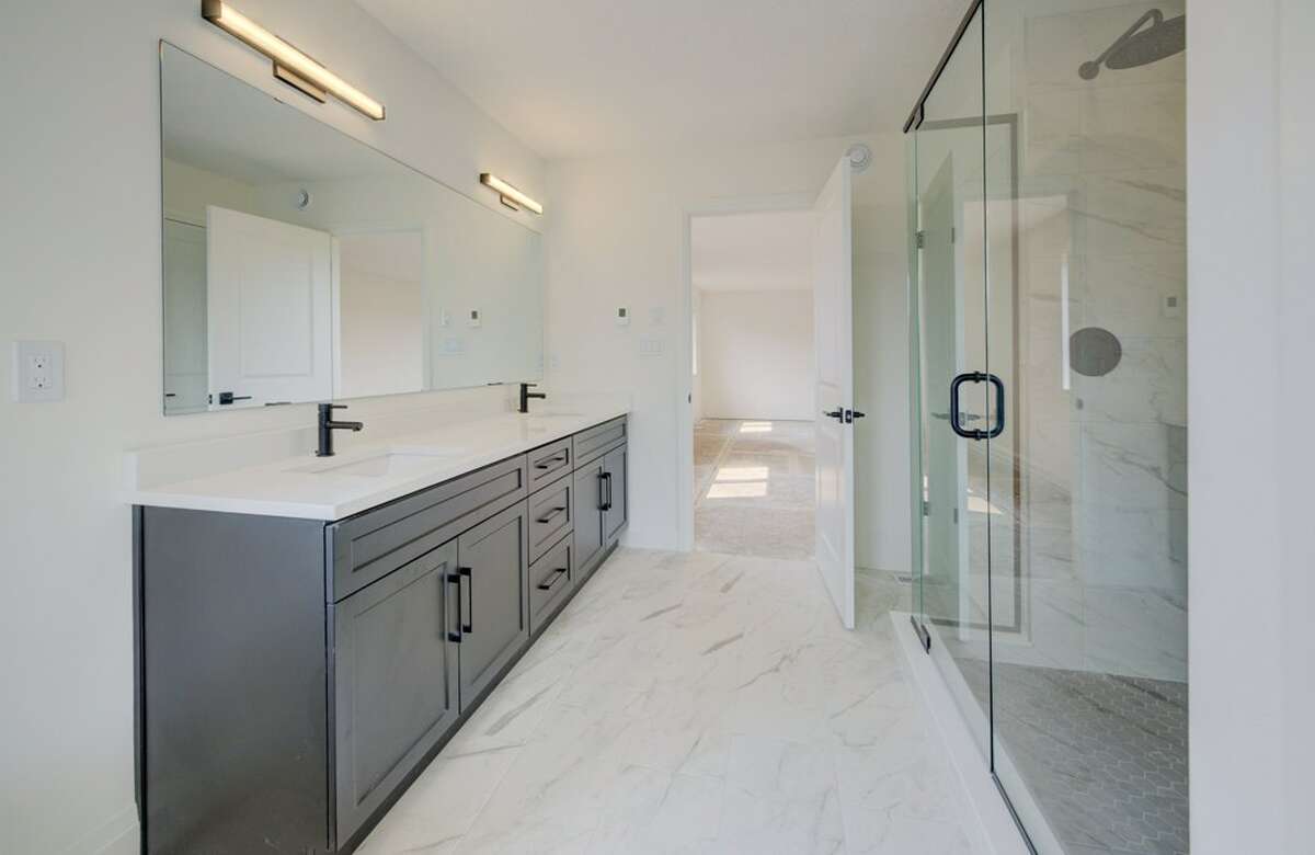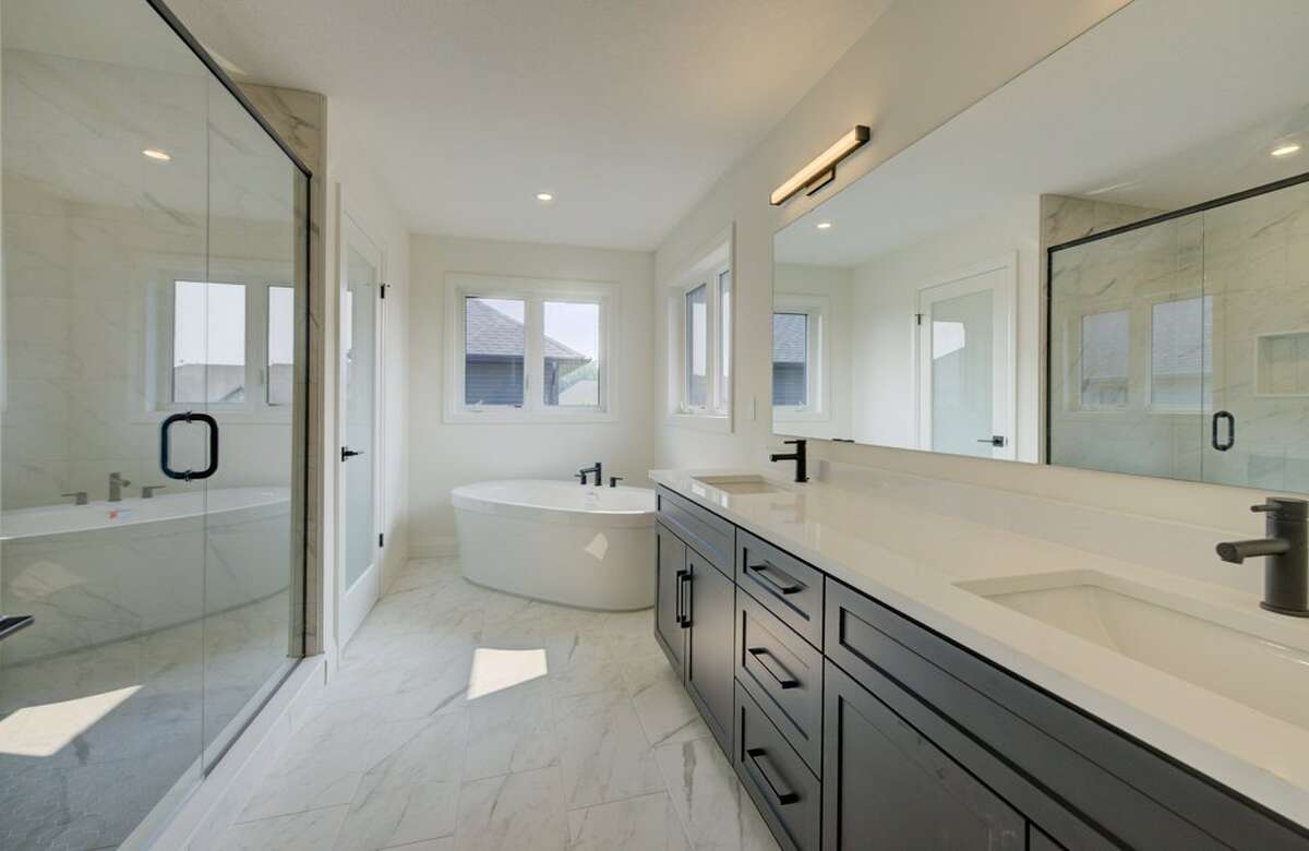 Upstairs, discover a spacious loft and four generous bedrooms, including a luxurious primary suite complete with a massive walk-in closet and a spa-like ensuite featuring a freestanding soaker tub, dual vanities, and a glass-enclosed shower.