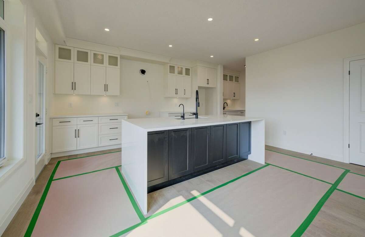Step through the impressive two-storey foyer and into the expansive main floor featuring soaring 9-foot ceilings and upgraded hardwood flooring throughout. The heart of the home is the chef-inspired kitchen, showcasing custom cabinetry, a massive island with a dramatic waterfall quartz countertop, and ample storage, as well as a butlers pantry that flows into a large dinning and living room - ideal for entertaining or everyday living