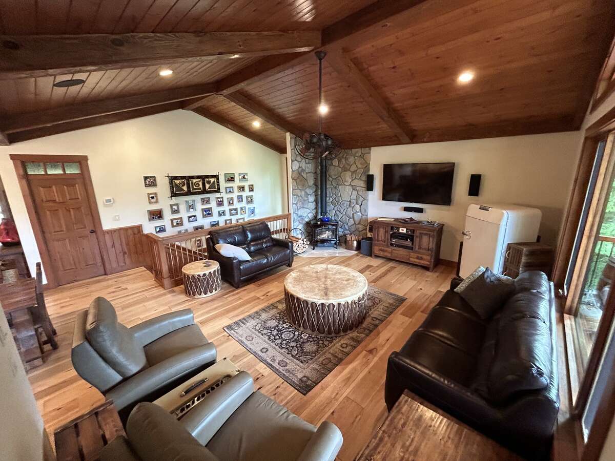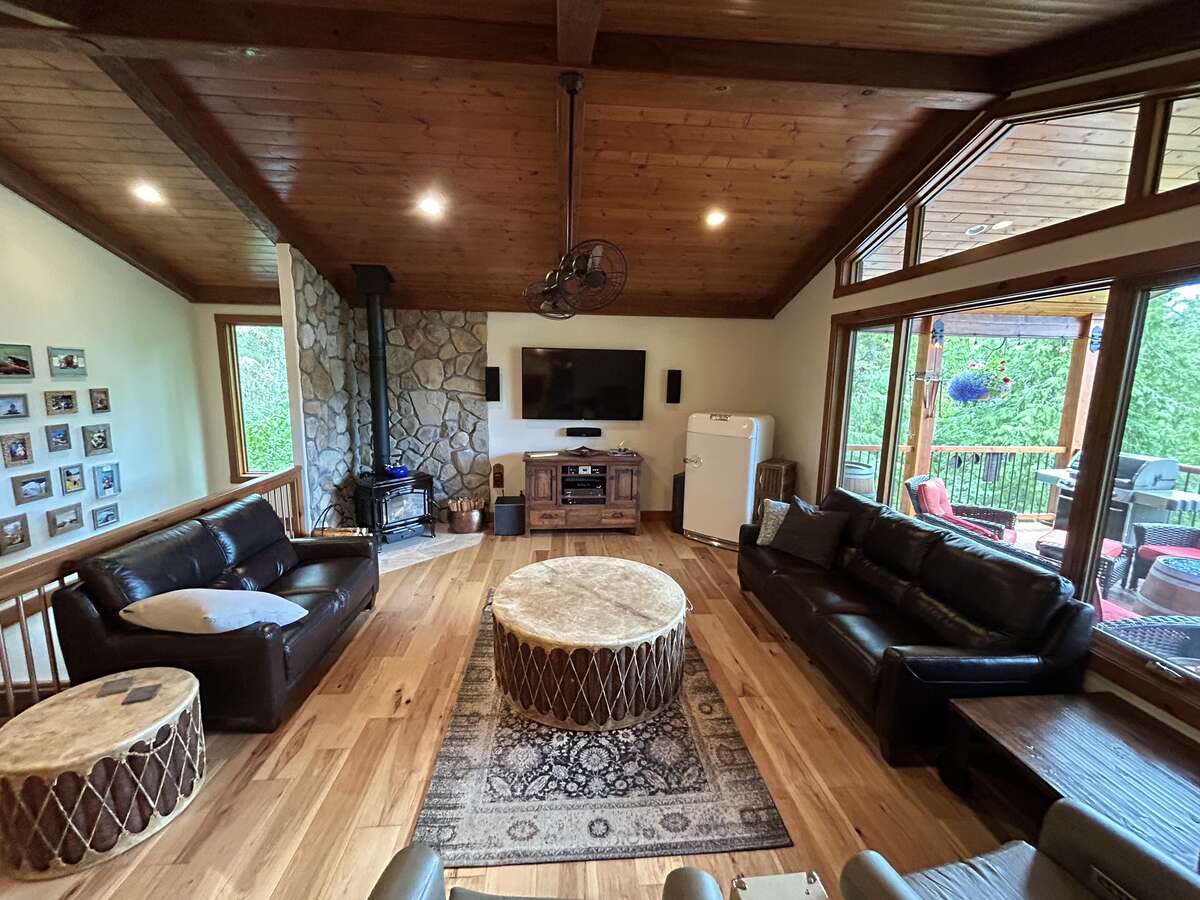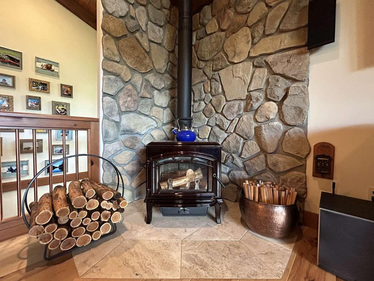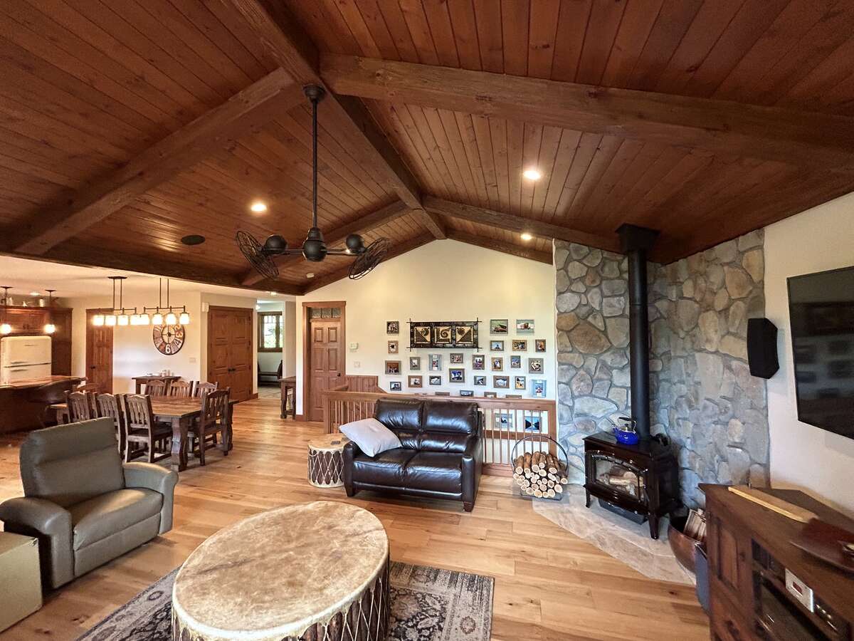 The custom-built kitchen is a entertainer’s dream, showcasing Northstar appliances, custom cabinetry, granite countertops, and a stunning solid wood resin island. Wide plank hickory flooring flows throughout the home, while every bathroom and shower is adorned with lavish travertine tiles. Comfort and efficiency are paramount, with radiant heating, forced air, and air conditioning ensuring year-round comfort, complemented by a cozy Quadra Fire Explorer 2 wood-burning stove. The living room and master bedroom feature vaulted ceilings, with the living room further enhanced by beautiful exposed wood beams, creating a rustic yet luxurious ambiance.