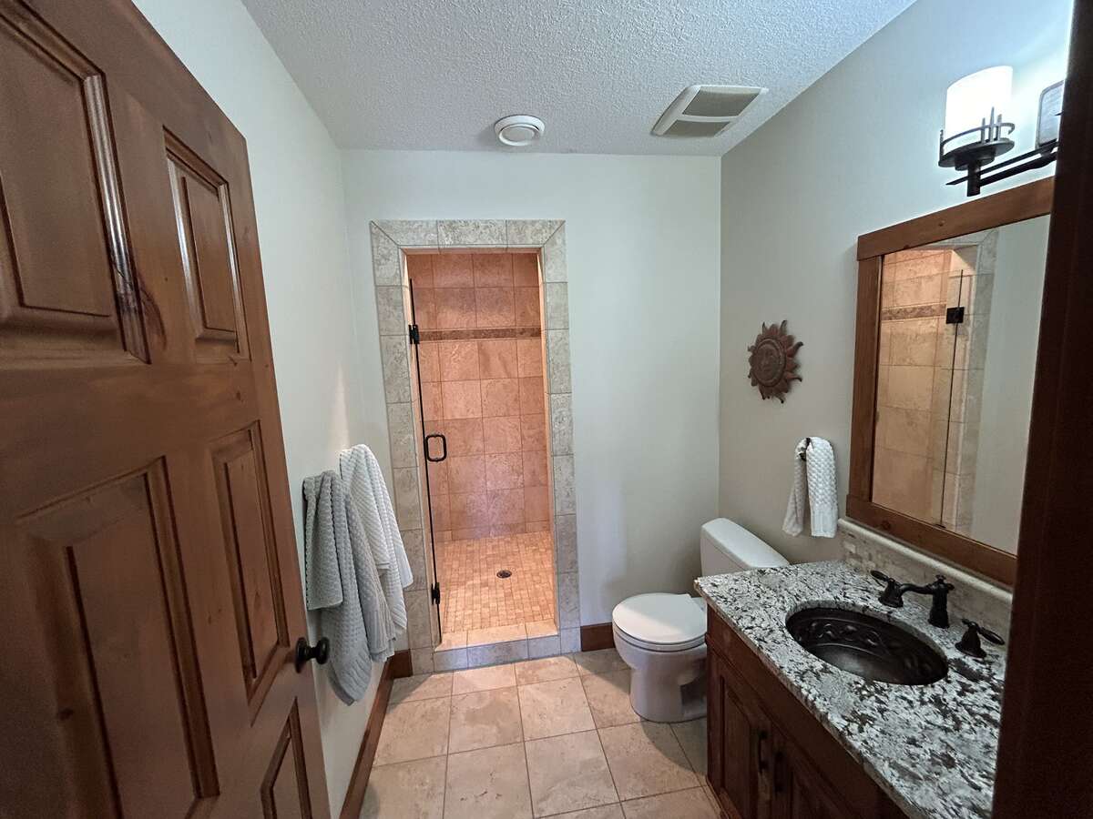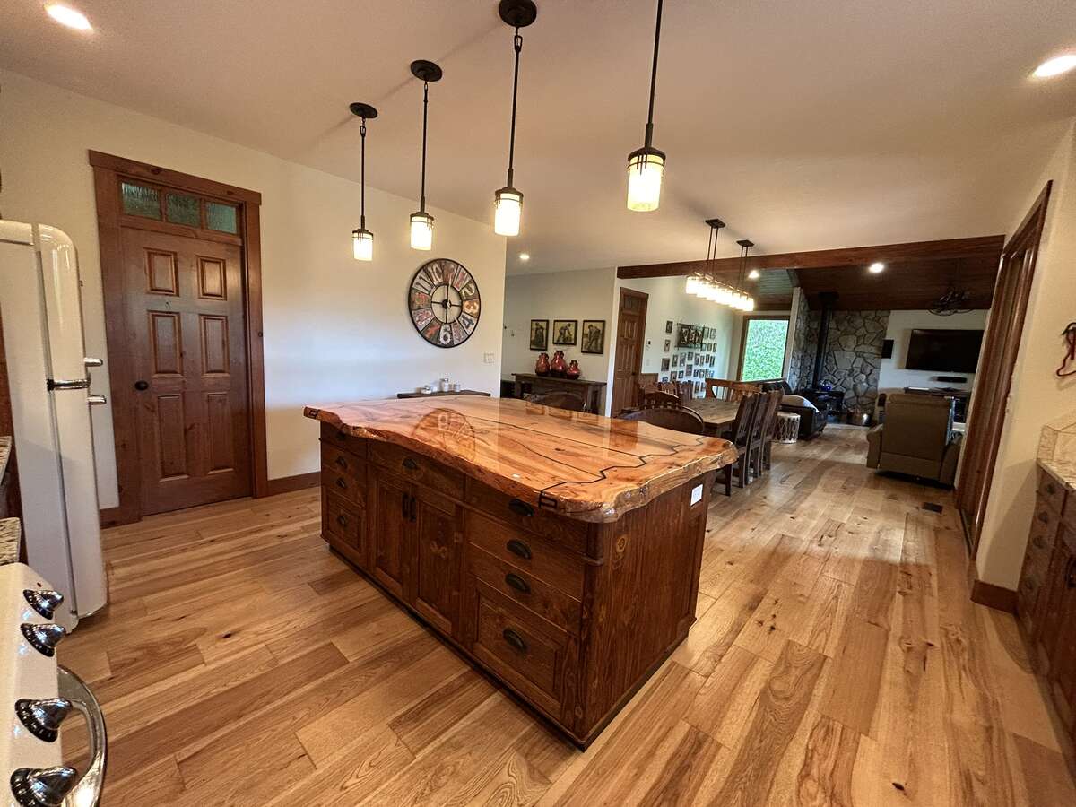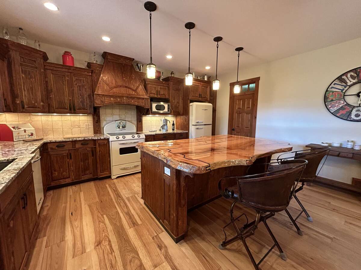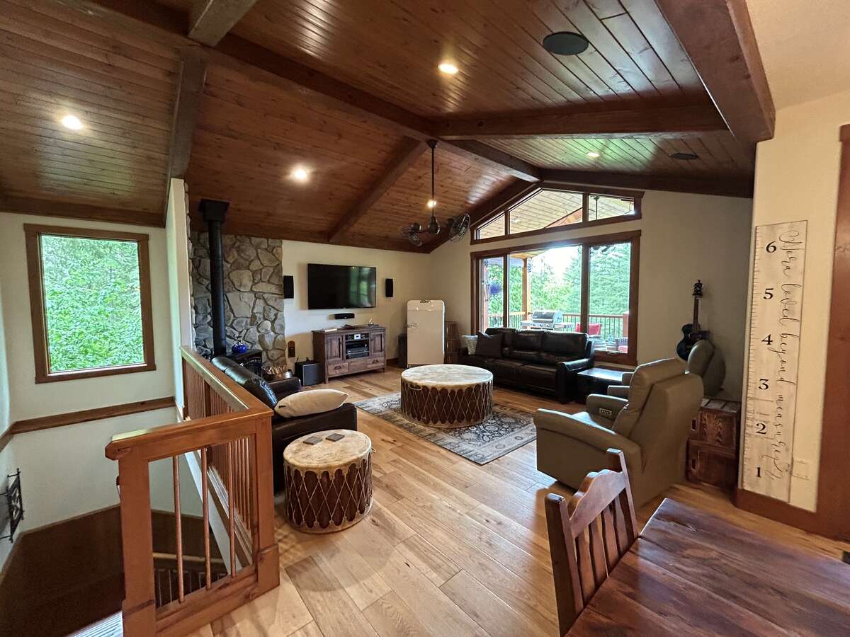 The custom-built kitchen is a entertainer’s dream, showcasing Northstar appliances, custom cabinetry, granite countertops, and a stunning solid wood resin island. Wide plank hickory flooring flows throughout the home, while every bathroom and shower is adorned with lavish travertine tiles. Comfort and efficiency are paramount, with radiant heating, forced air, and air conditioning ensuring year-round comfort, complemented by a cozy Quadra Fire Explorer 2 wood-burning stove. The living room and master bedroom feature vaulted ceilings, with the living room further enhanced by beautiful exposed wood beams, creating a rustic yet luxurious ambiance.