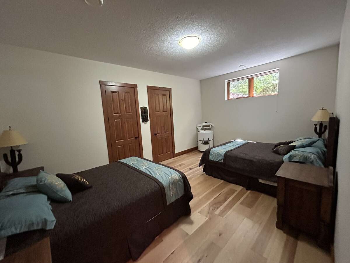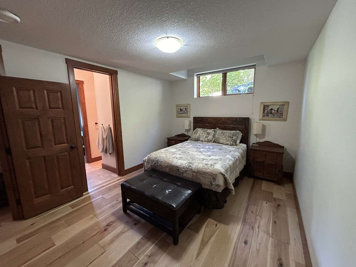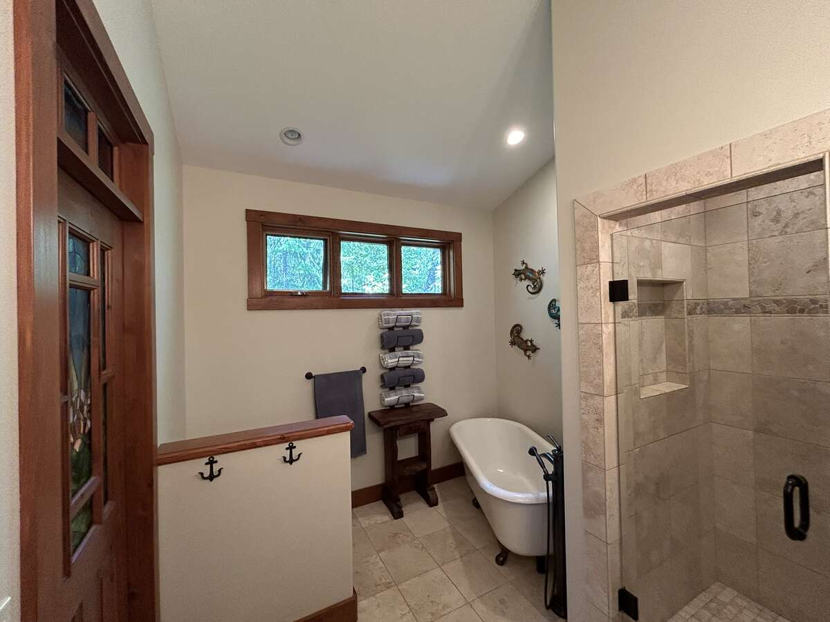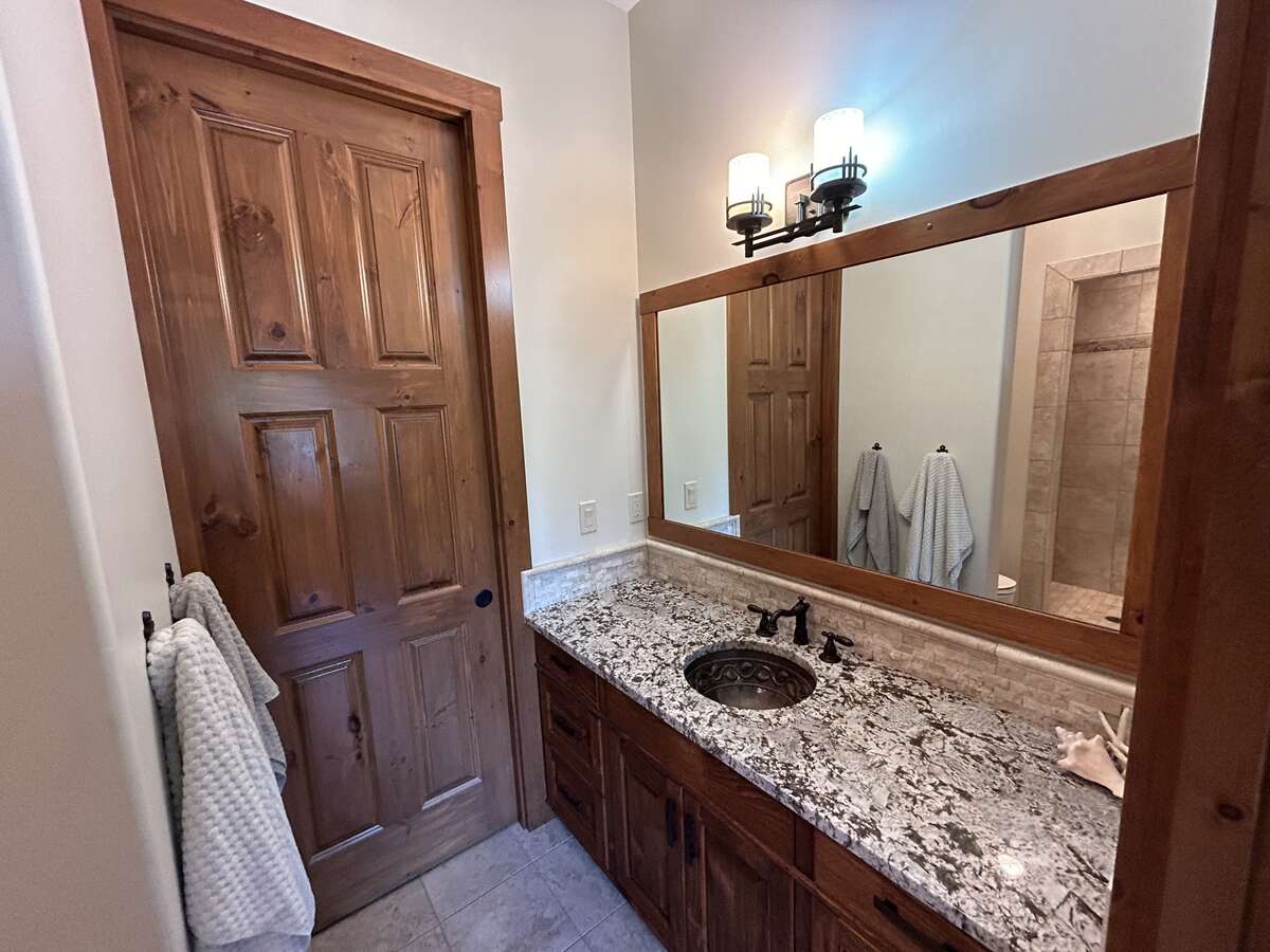 The custom-built kitchen is a entertainer’s dream, showcasing Northstar appliances, custom cabinetry, granite countertops, and a stunning solid wood resin island. Wide plank hickory flooring flows throughout the home, while every bathroom and shower is adorned with lavish travertine tiles. Comfort and efficiency are paramount, with radiant heating, forced air, and air conditioning ensuring year-round comfort, complemented by a cozy Quadra Fire Explorer 2 wood-burning stove. The living room and master bedroom feature vaulted ceilings, with the living room further enhanced by beautiful exposed wood beams, creating a rustic yet luxurious ambiance.