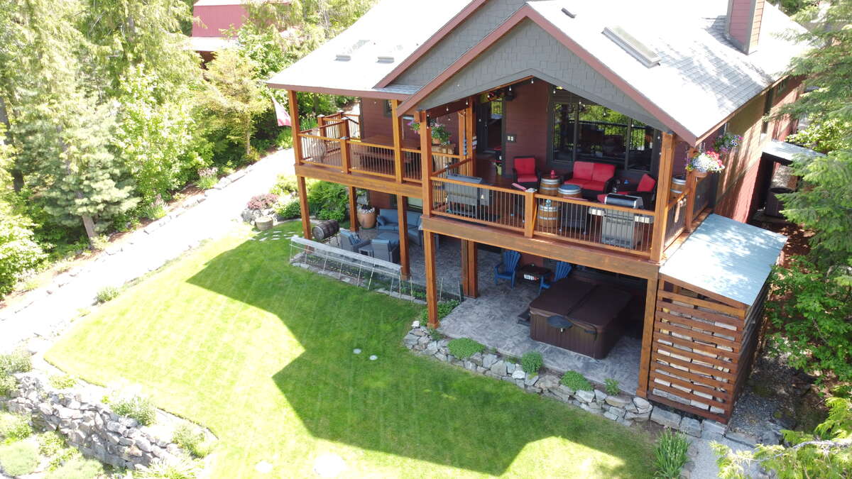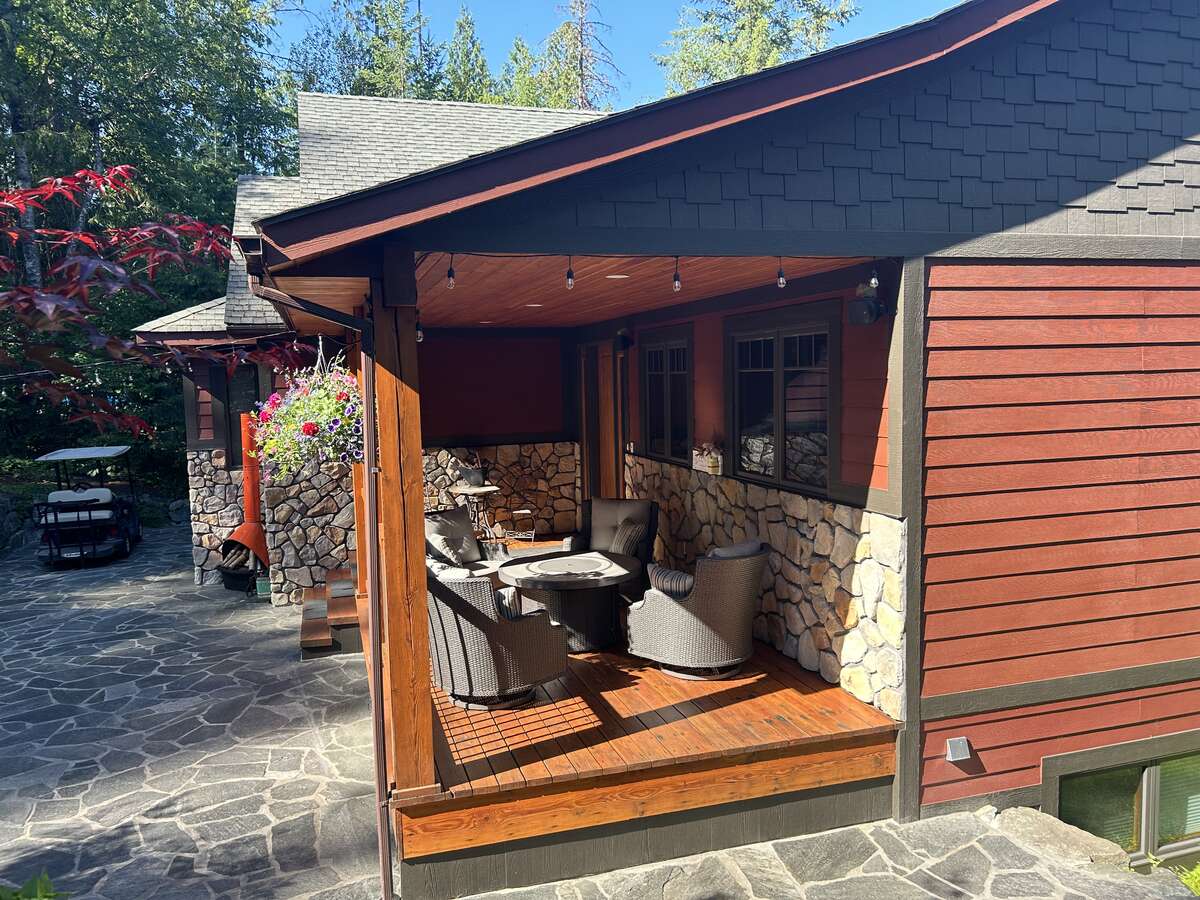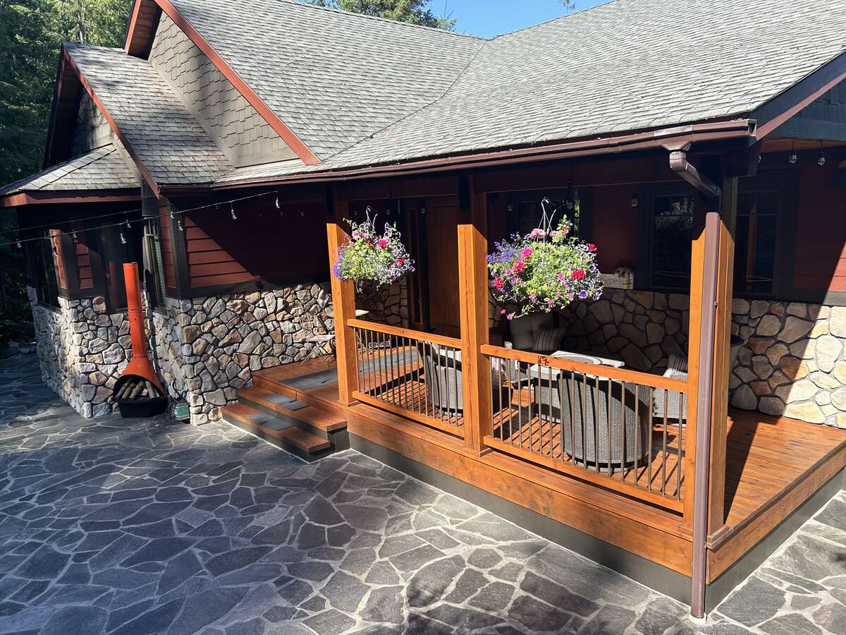 Designed for ultimate outdoor enjoyment, the home features a west-facing 600 sq. ft. covered back deck with vaulted ceilings, timber beams, and copper railings—perfect for soaking up the afternoon sun. The 235 sq. ft. front porch echoes the same exquisite finish. The property is tiered with meticulously crafted rock walls and lush landscaping, complete with an irrigation system for all beds and hanging baskets. At the front of the house, there is a courtyard with a beautiful flagstone patio, providing an inviting space for outdoor gatherings.