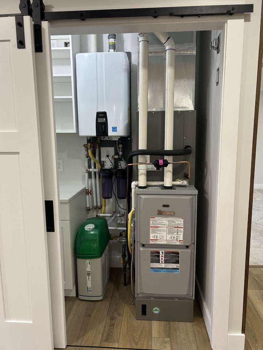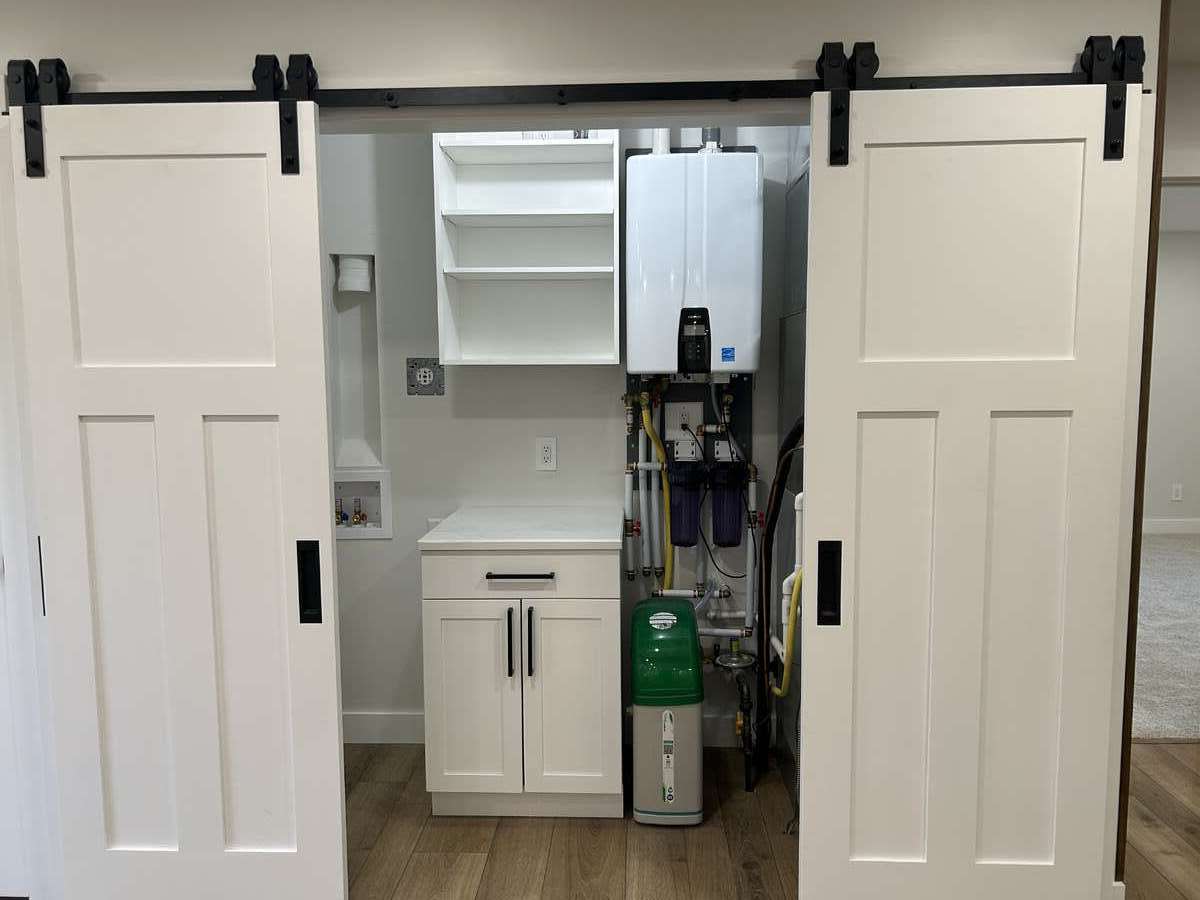 A compact, streamlined mechanical room houses: