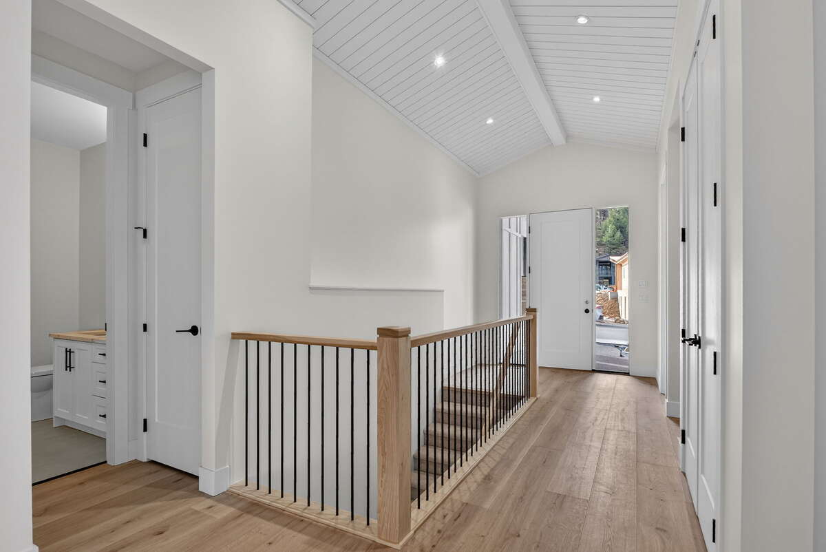 The main floor is designed to impress, featuring soaring vaulted ceilings with exposed wooden beams that create warmth and architectural interest. Expansive windows flood the home with natural light, while seamless indoor-outdoor flow leads to a covered deck—perfect for taking in the surrounding valley and mountain views.