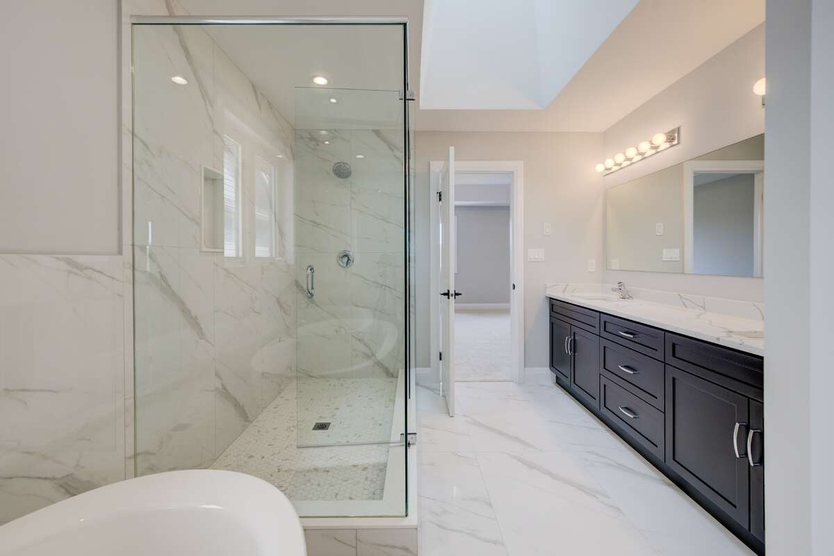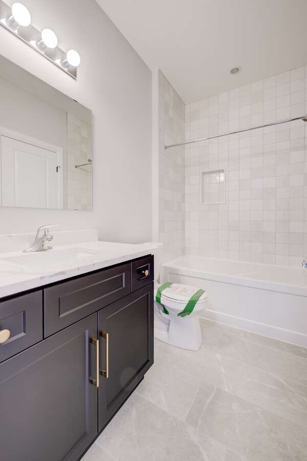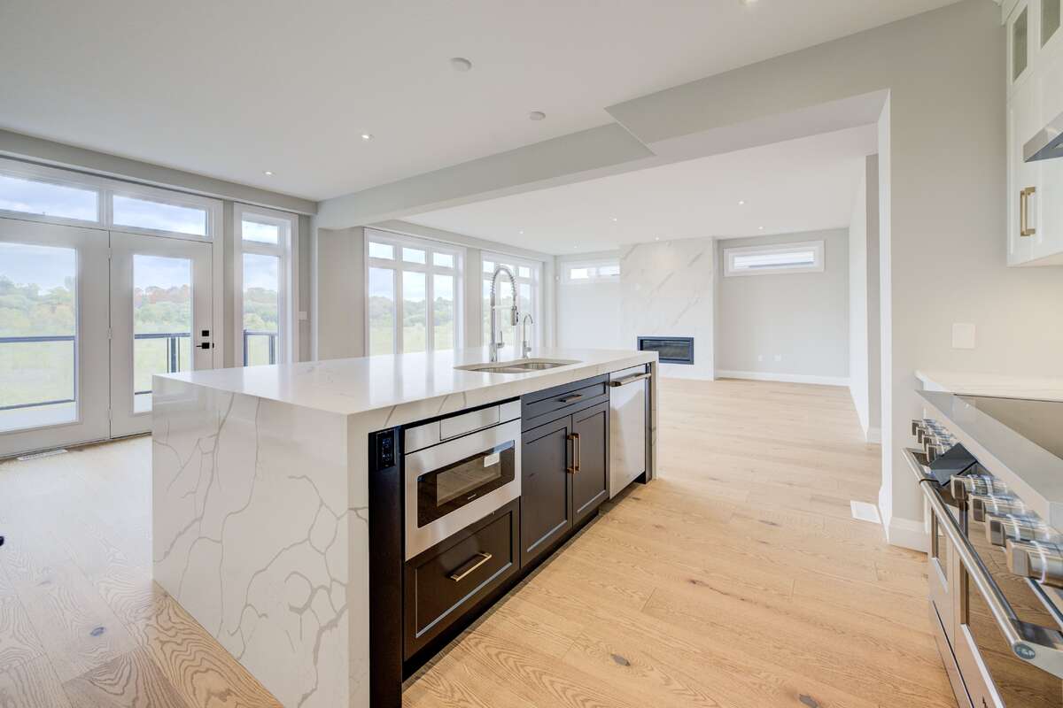 The chef’s kitchen—also bathed in natural light—showcases upgraded white, ceiling-height cabinetry with upper glass doors, premium quartz countertops, six professional appliances, and a walk-in pantry. An expansive black island with breakfast bar doubles as a workspace and gathering hub, topped with marbled quartz that cascades in a dramatic waterfall edge. The generous dinette accommodates a large table, with sizeable windows and a glass terrace door that opens to the rear deck. Durable hardwood spans the main level (tile in the bathroom), and an oak staircase is illuminated by a landing window.