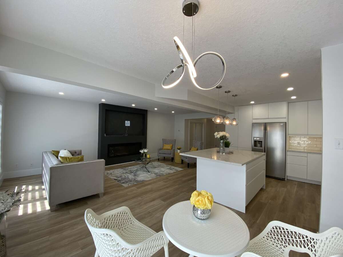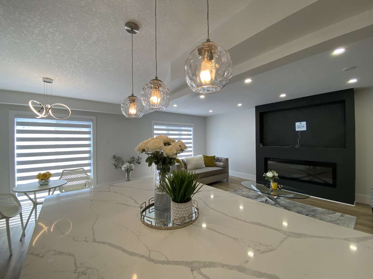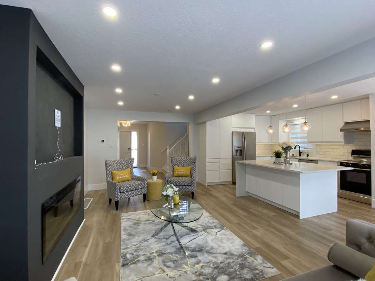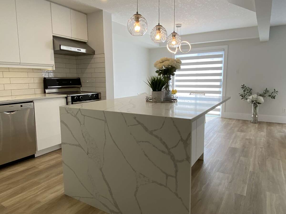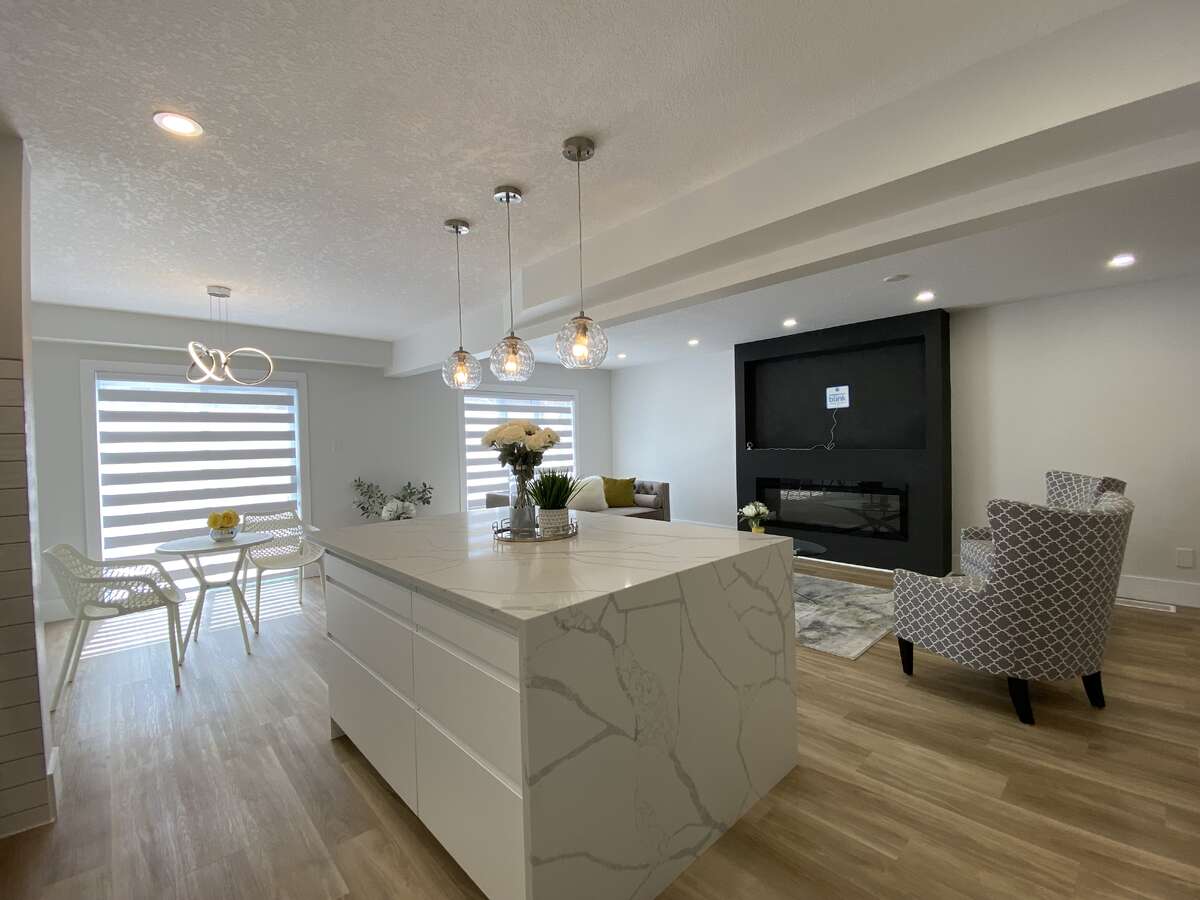 The main floor features an open-concept living area with natural light and a built-in fireplace. The open concept NEW KITCHEN features white cabinetry, quartz countertops, a waterfall island, tiled backsplash, a built-in refrigerator and stainless steel Bosh appliances.