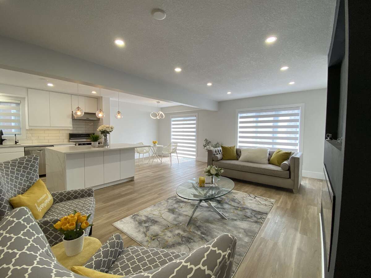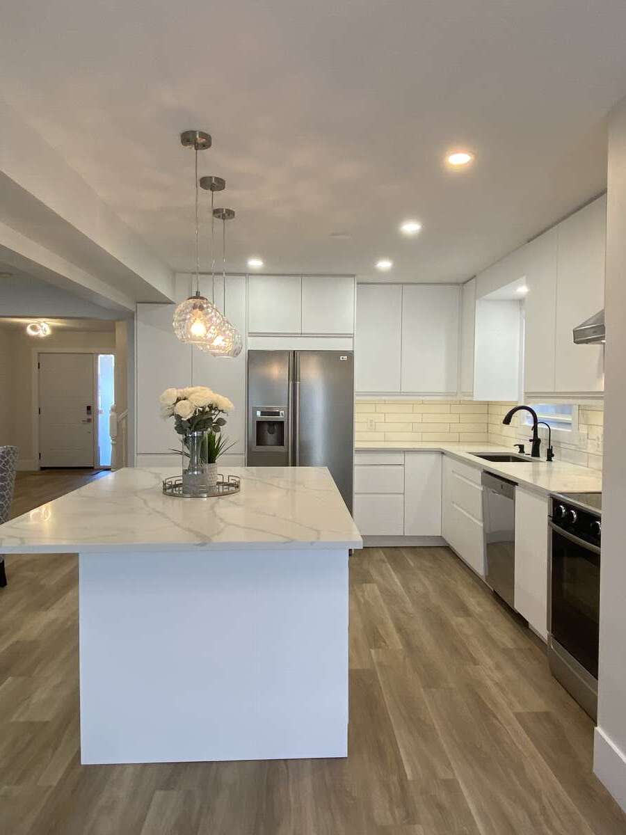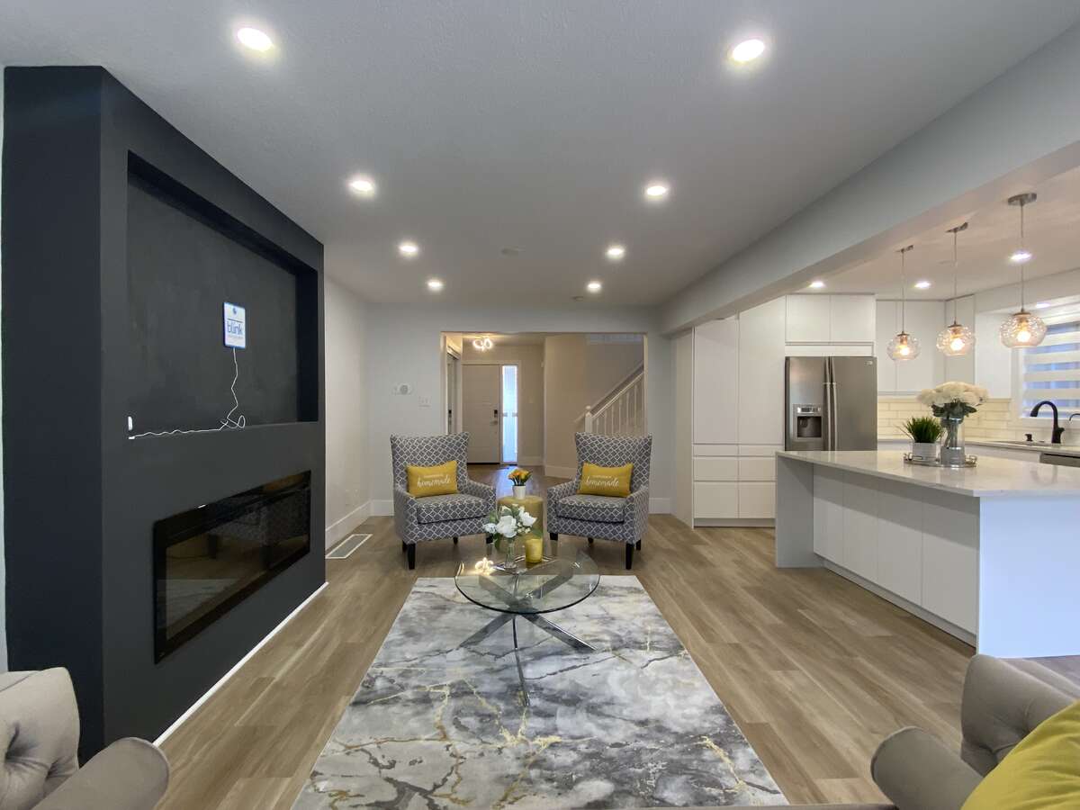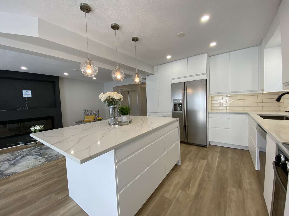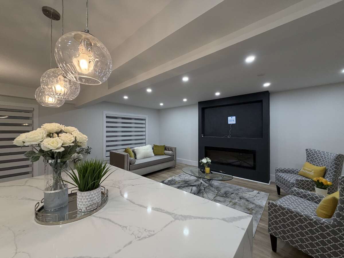 The main floor features an open-concept living area with natural light and a built-in fireplace. The open concept NEW KITCHEN features white cabinetry, quartz countertops, a waterfall island, tiled backsplash, a built-in refrigerator and stainless steel Bosh appliances.