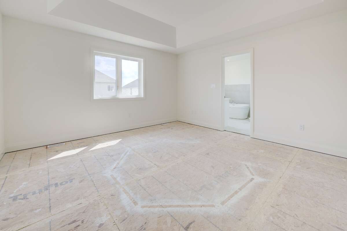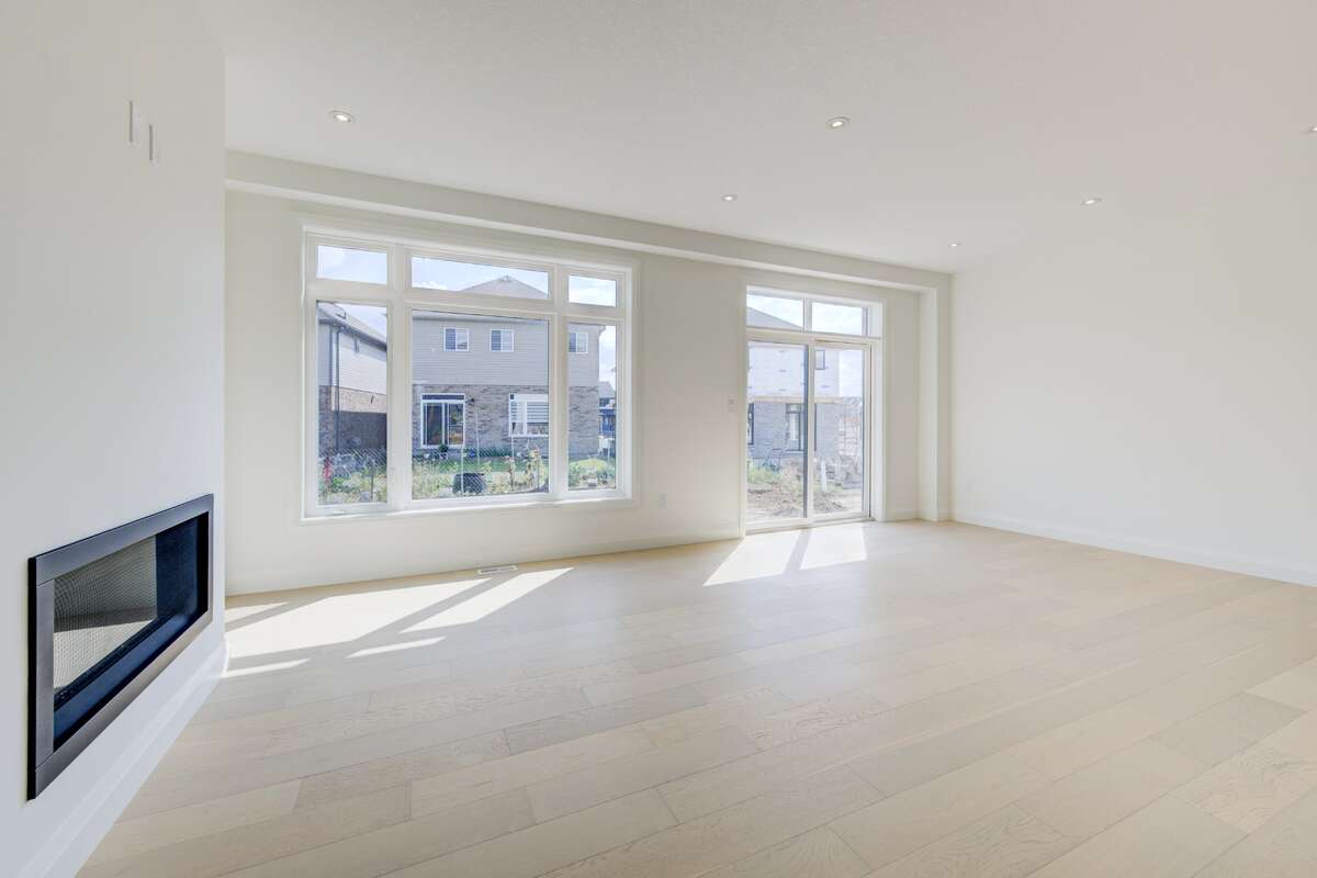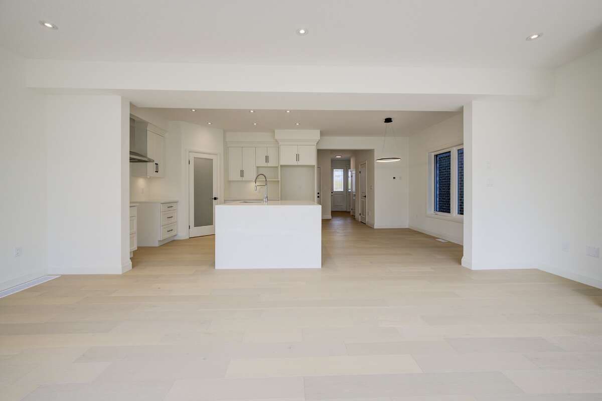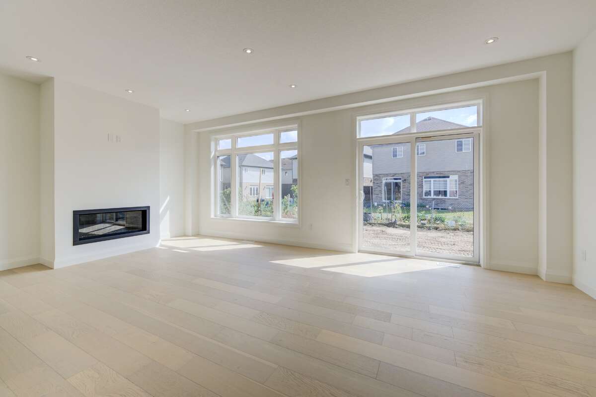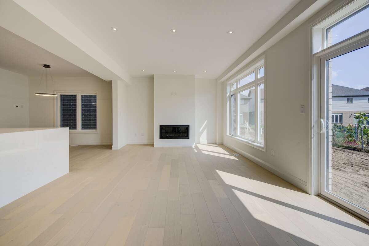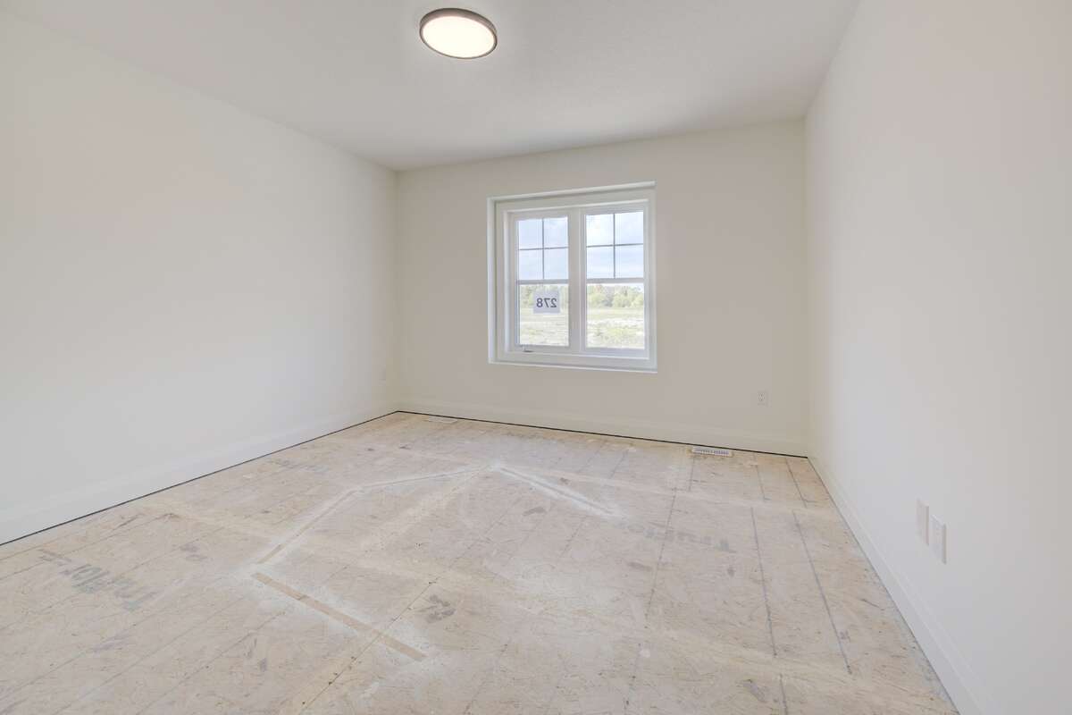 Located at 278 Rivertrail Ave in Kitchener, ON, this two-story home is 2176 finished square feet with an attached garage and a paved two vehicle-wide driveway. The upgraded stone front and entry door are a welcome introduction to the main floor open-concept design with nine-foot ceilings. The great room includes a modern linear gas fireplace, pot lights, a large window and a sliding patio door to access the rear yard. The kitchen, brightly lit with pot lights, contains upgraded white cabinetry with premium quartz countertops, a large island with a waterfall countertop, under top cabinet lighting, a walk-in pantry and dinette area. Hardwood flooring covers the main level, except for tile flooring in the powder room. An oak staircase leads upstairs, where the second floor is brightened by a skylight in the vaulted ceiling. This level includes four bedrooms, a main bathroom with two vanities and a skylight, as well as a conveniently located laundry room. The master bedroom has a coffered ceiling, a generous walk-in closet and a luxurious ensuite with a skylight, a free-standing soaker tub, a tile shower with glass door and a separate toilet room. Additional items included are air conditioning, five appliances and a chimney-style rangehood in the kitchen. This new home is move-in ready, except for second level flooring which the purchaser may select from the builder’s samples. Please visit our Model Home located at 88 Grand Flats Trail in Kitchener to arrange a viewing of this home. The Model Home is open each Tuesday and Thursday from 2pm-6pm and every Saturday from 12pm-4pm.