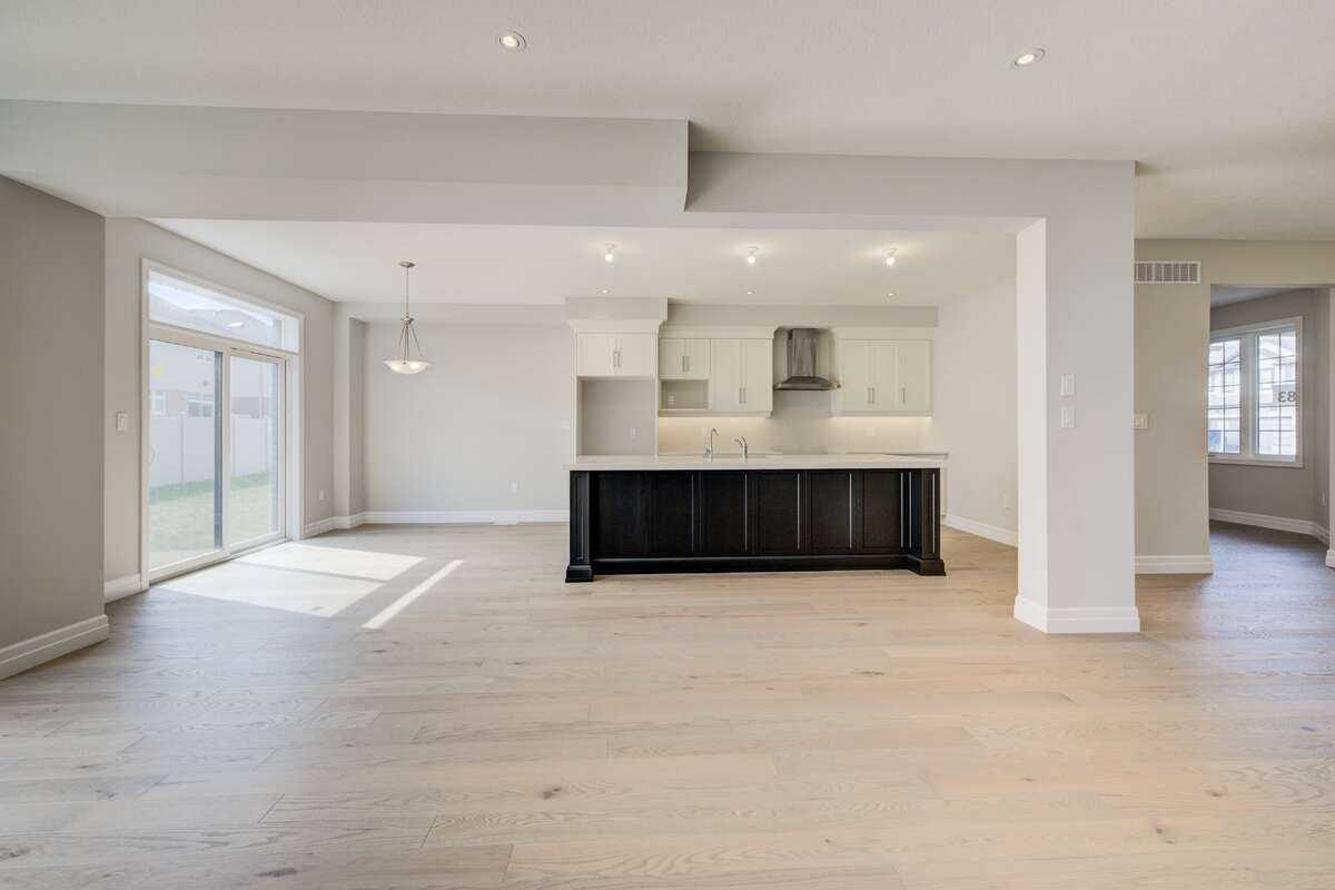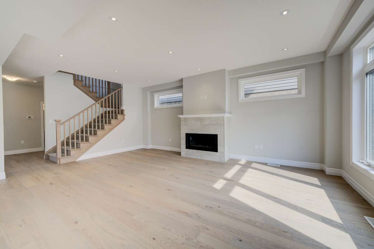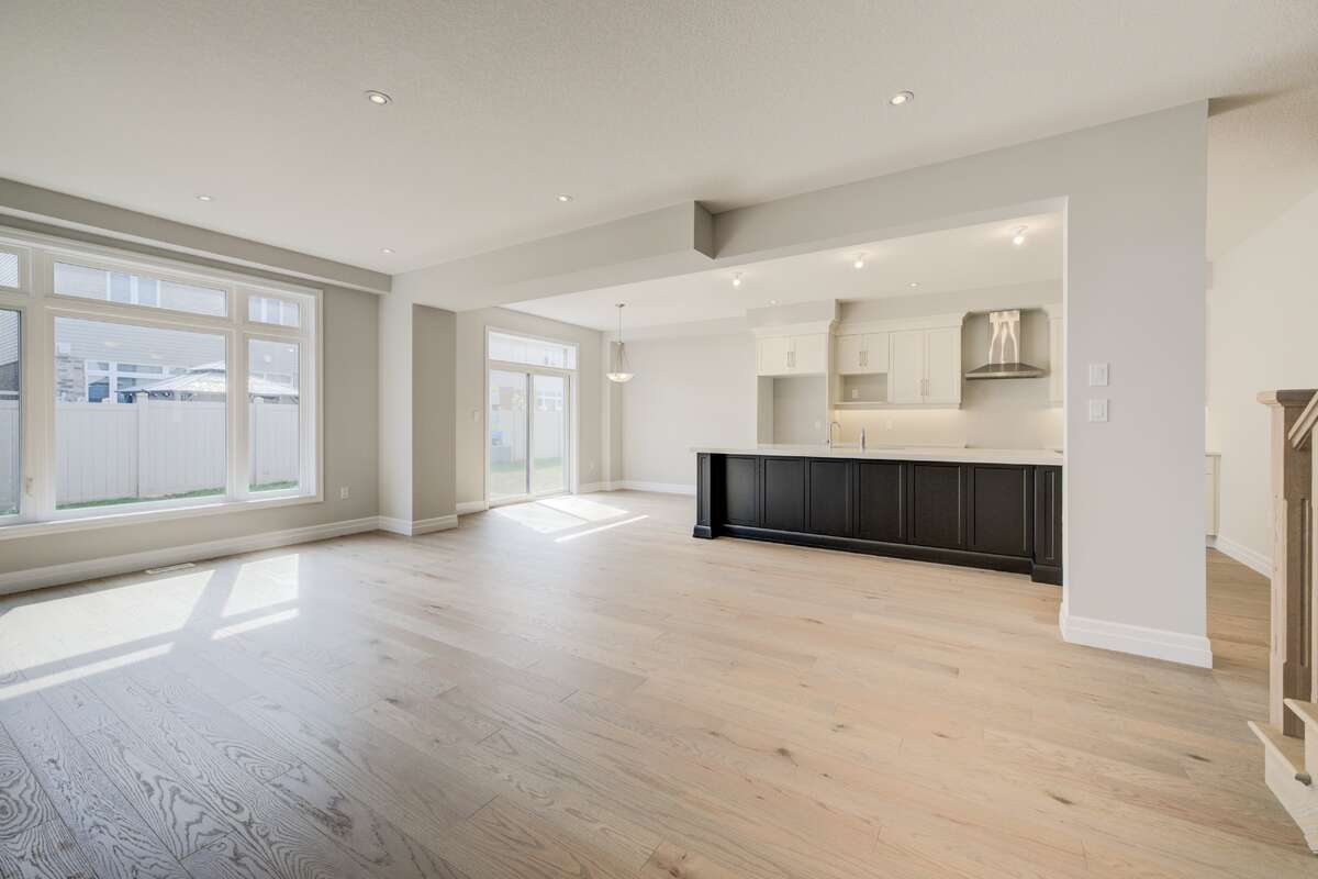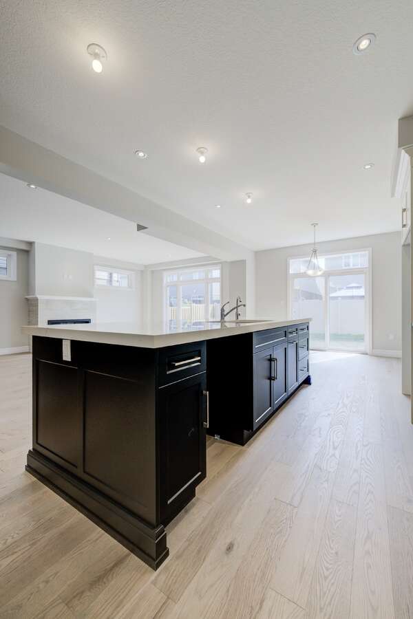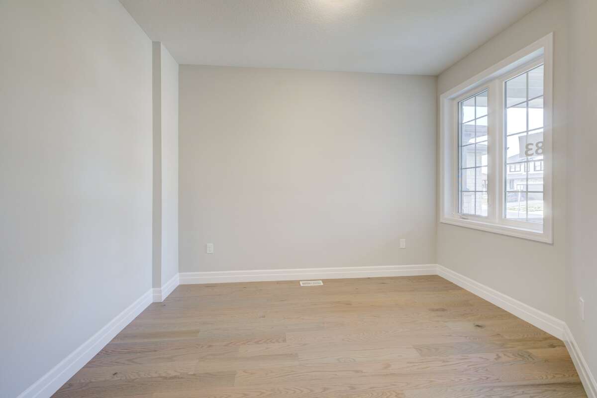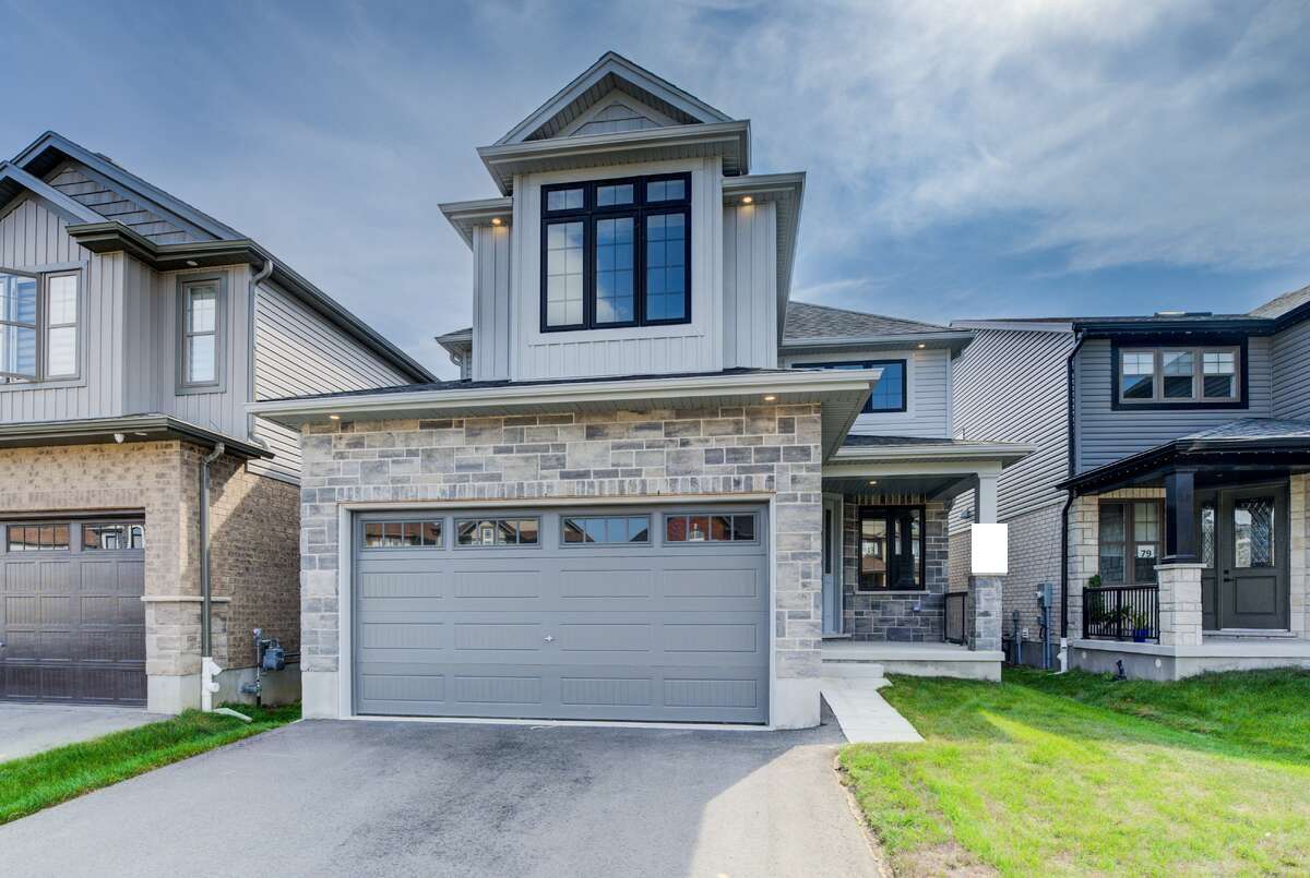 Located at 83 Crosswinds Drive in Kitchener, ON, this open-concept two-story home is 2485 finished square feet with an attached double garage and a paved driveway, withing walking distance of a neighborhood park. The main floor, with a 9-foot-high ceiling, consists of a great room, kitchen, dinette, den with a large front-facing window and a powder room. The great room includes a modern linear gas fireplace, pot lights and a large window with a view of the backyard. The kitchen, brightly lit by pot lights, contains upgraded white cabinetry with upper under-cabinet lighting, premium quartz countertops and a generous black island that includes a breakfast bar. The dinette features a pendant light fixture and a sliding patio door with access to the rear yard. Hardwood flooring covers the main level, except for tile flooring in the powder room and entrance from the garage. An oak staircase to the second floor is brightened by a window in the landing area. The upper level includes four bedrooms, a main bathroom with two vanities and a skylight, as well as a conveniently located laundry room. The master bedroom has a coffered ceiling, a generous walk-in closet and a luxurious ensuite with a free-standing soaker tub, tile shower with glass surround and door and a separate toilet room. Additional items included are air conditioning, five appliances and a chimney-style rangehood in the kitchen. This new home is finished and move-in ready! Please visit our Model Home located at 88 Grand Flats Trail in Kitchener to arrange a viewing of this home. The Model Home is open each Tuesday and Thursday from 2pm-6pm and every Saturday from 12pm-4pm.
