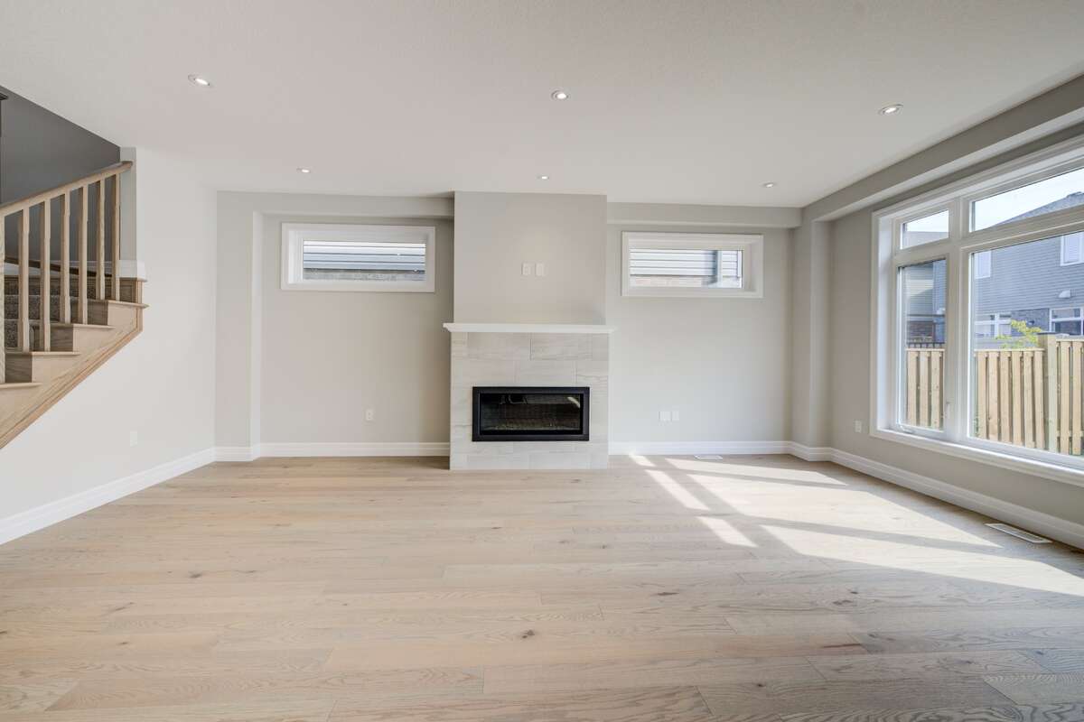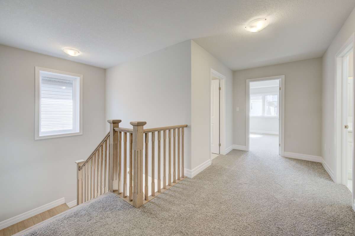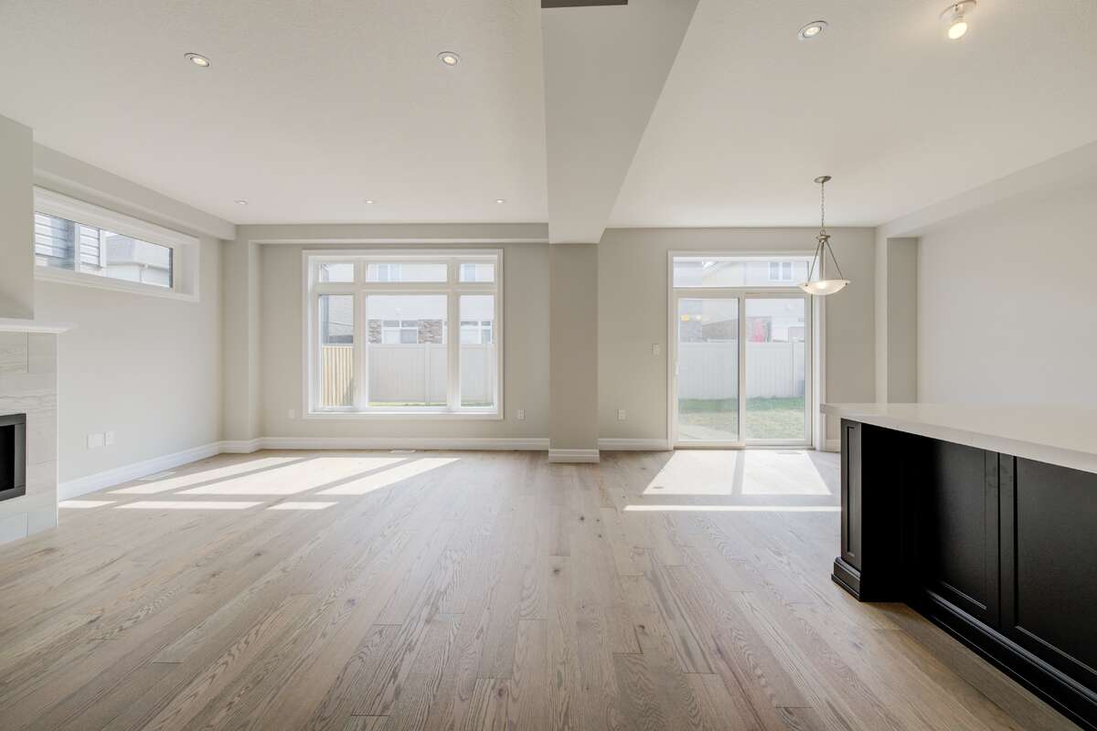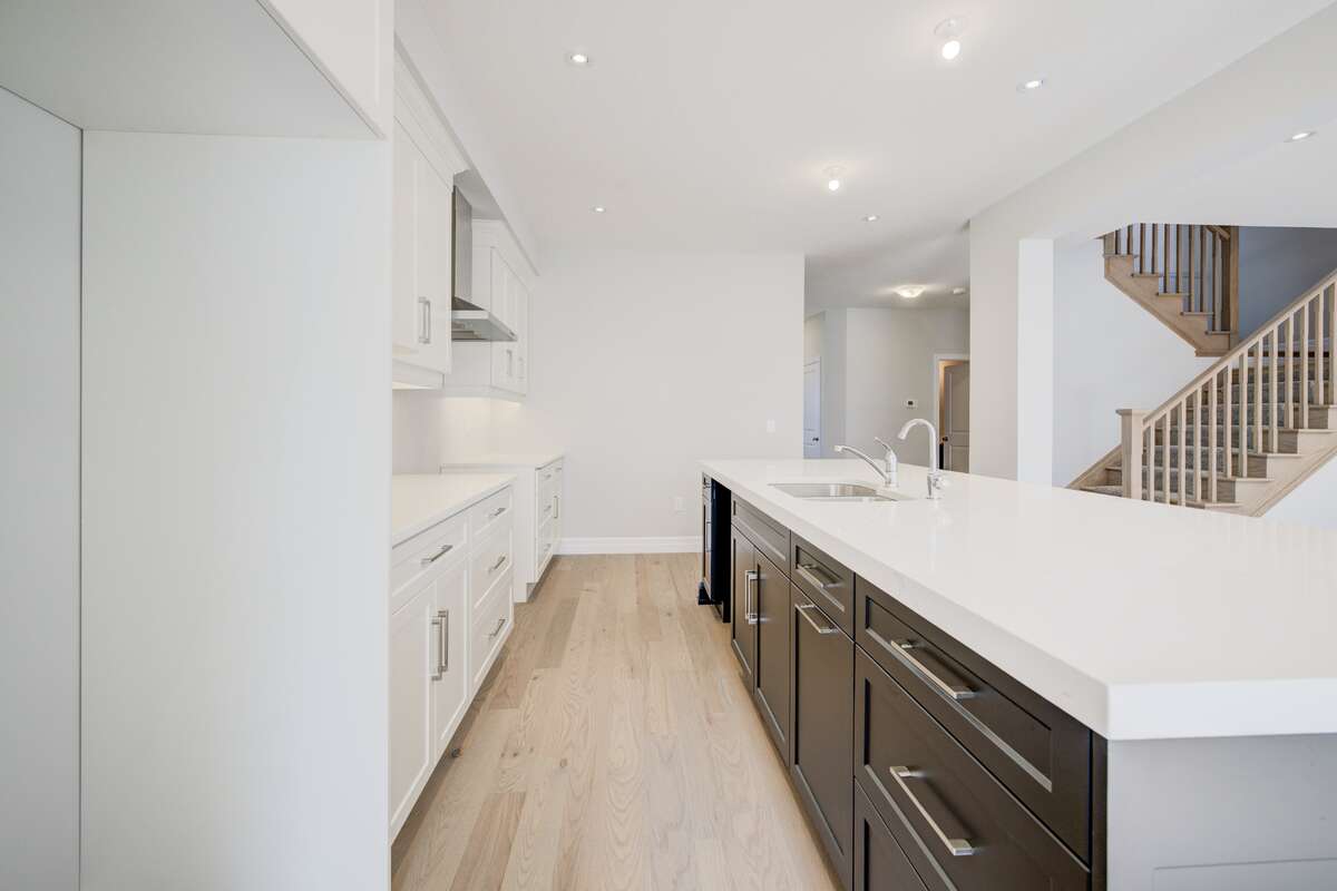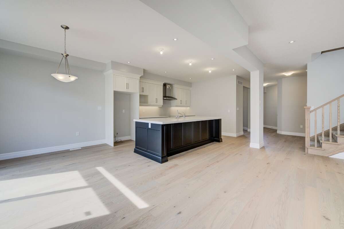 Located at 83 Crosswinds Drive in Kitchener, ON, this open-concept two-story home is 2485 finished square feet with an attached double garage and a paved driveway, withing walking distance of a neighborhood park. The main floor, with a 9-foot-high ceiling, consists of a great room, kitchen, dinette, den with a large front-facing window and a powder room. The great room includes a modern linear gas fireplace, pot lights and a large window with a view of the backyard. The kitchen, brightly lit by pot lights, contains upgraded white cabinetry with upper under-cabinet lighting, premium quartz countertops and a generous black island that includes a breakfast bar. The dinette features a pendant light fixture and a sliding patio door with access to the rear yard. Hardwood flooring covers the main level, except for tile flooring in the powder room and entrance from the garage. An oak staircase to the second floor is brightened by a window in the landing area. The upper level includes four bedrooms, a main bathroom with two vanities and a skylight, as well as a conveniently located laundry room. The master bedroom has a coffered ceiling, a generous walk-in closet and a luxurious ensuite with a free-standing soaker tub, tile shower with glass surround and door and a separate toilet room. Additional items included are air conditioning, five appliances and a chimney-style rangehood in the kitchen. This new home is finished and move-in ready! Please visit our Model Home located at 88 Grand Flats Trail in Kitchener to arrange a viewing of this home. The Model Home is open each Tuesday and Thursday from 2pm-6pm and every Saturday from 12pm-4pm.