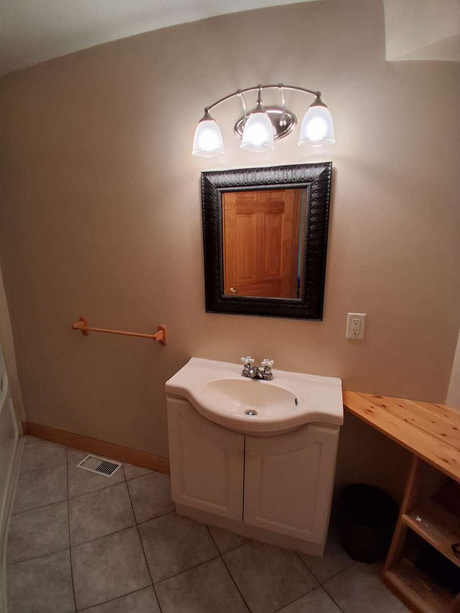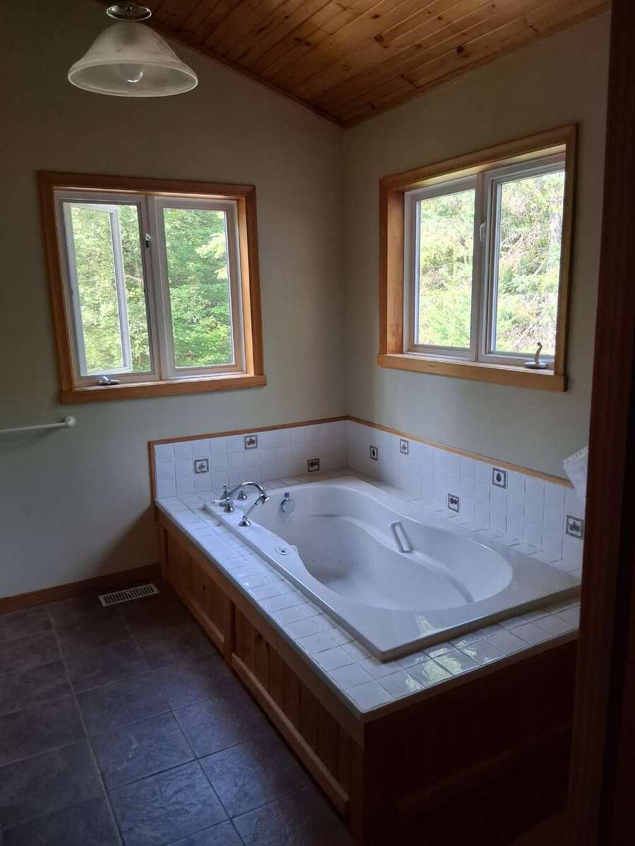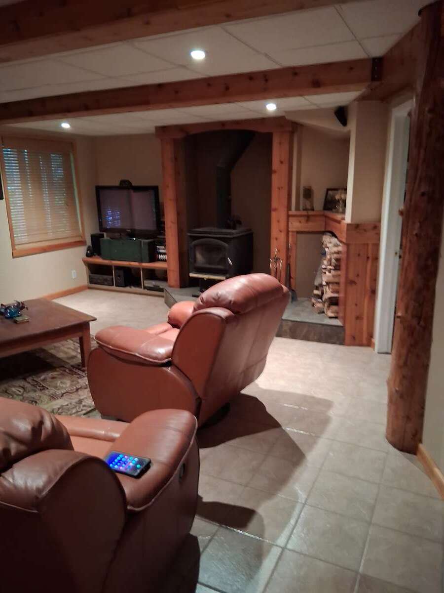 Inside, the primary suite features a luxurious ensuite with an Ultra Thermo-Masseur massage bath for the ultimate in relaxation. The lower level offers a spacious recreation room complete with a large plasma TV and a cozy wood stove, perfect for family gatherings or movie nights. A convenient kitchenette with a sink, small fridge, and microwave makes this level a great candidate for a guest suite, especially with its separate entrance.