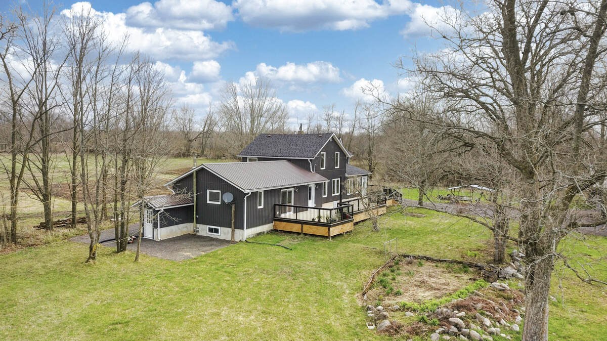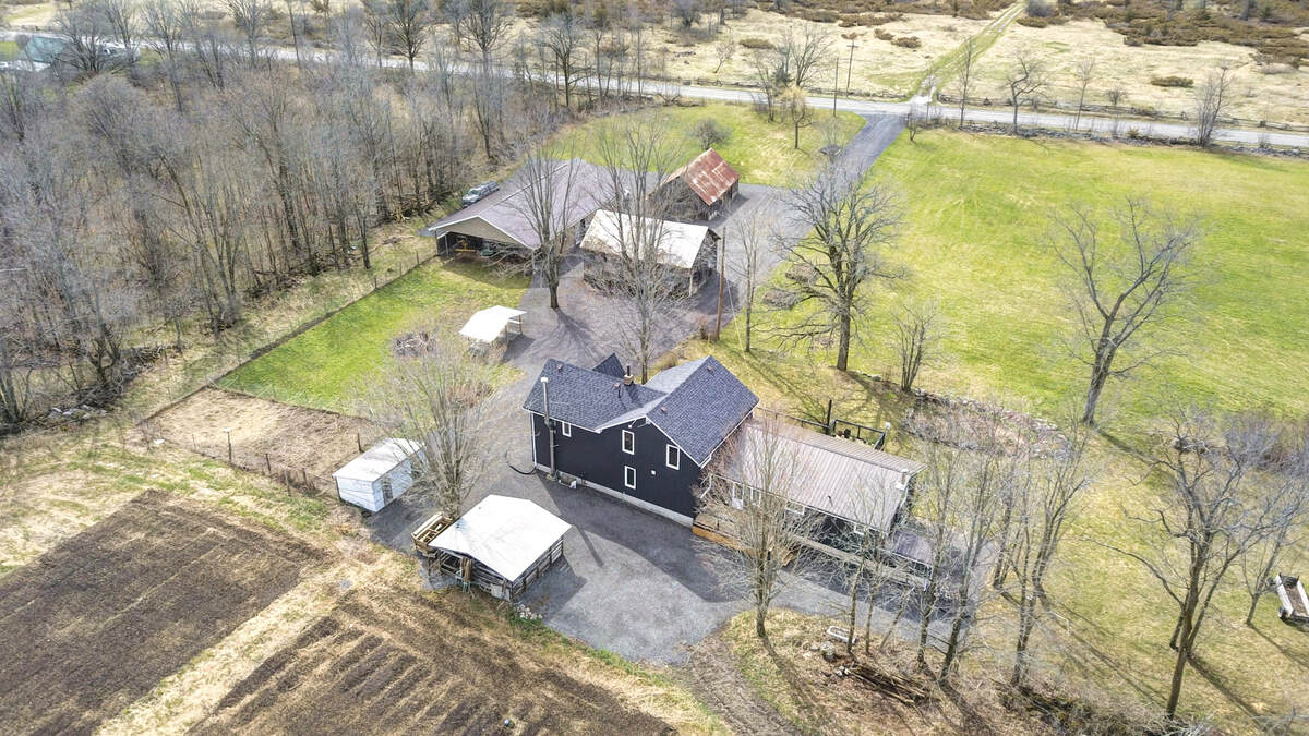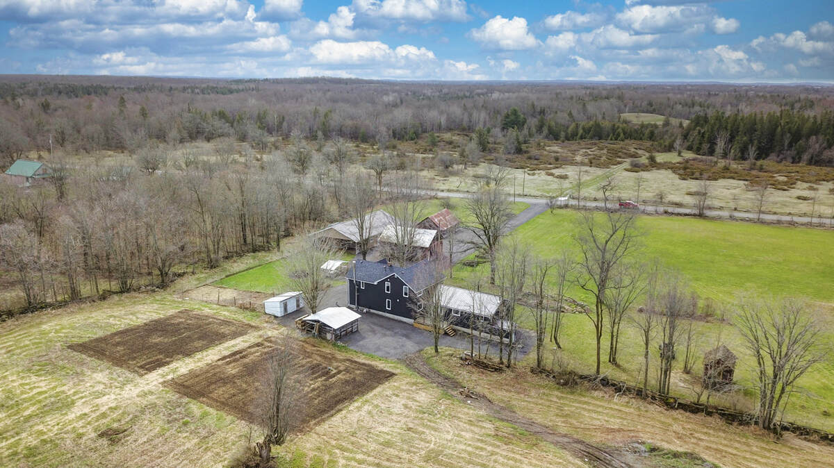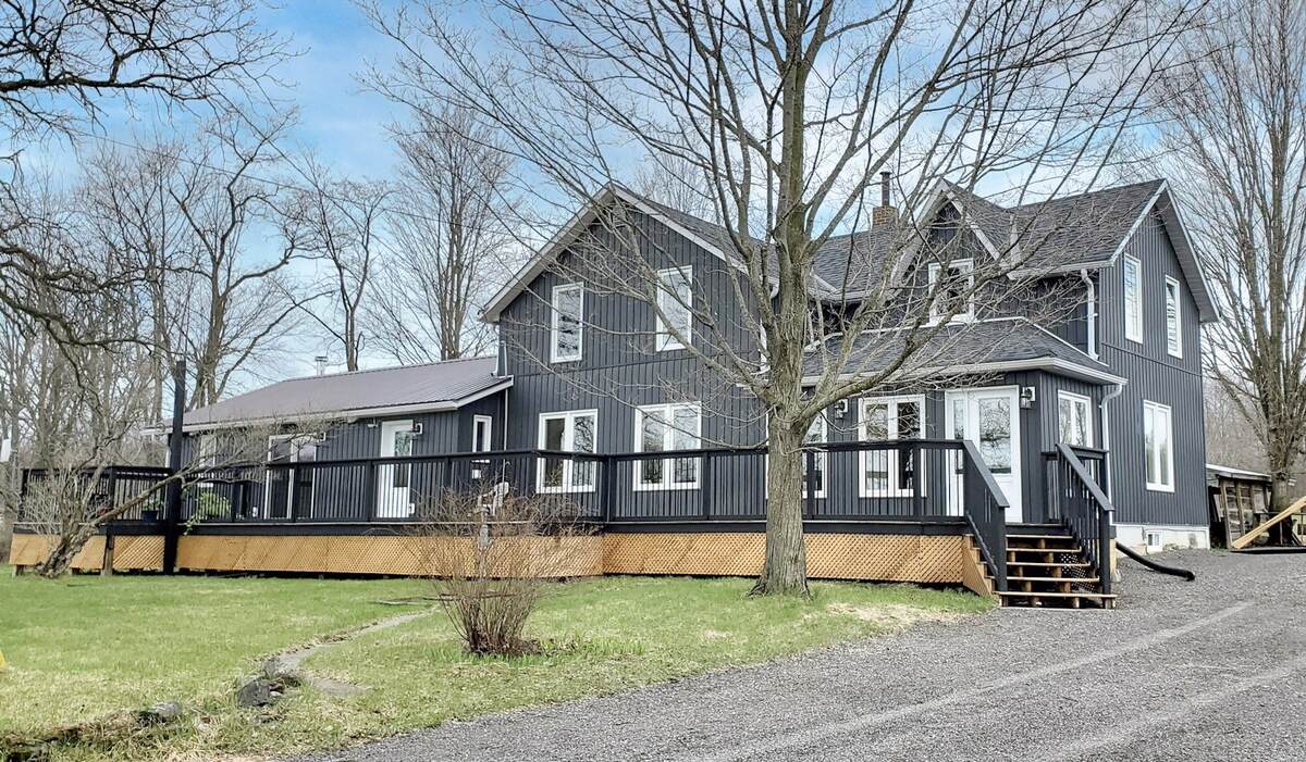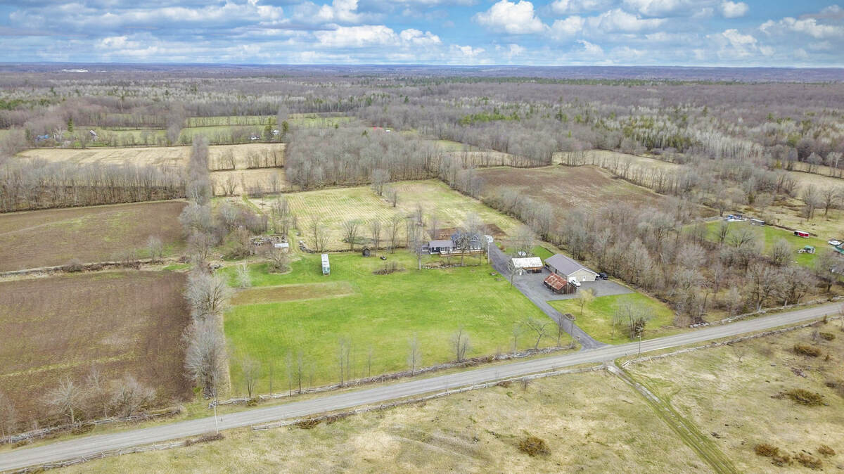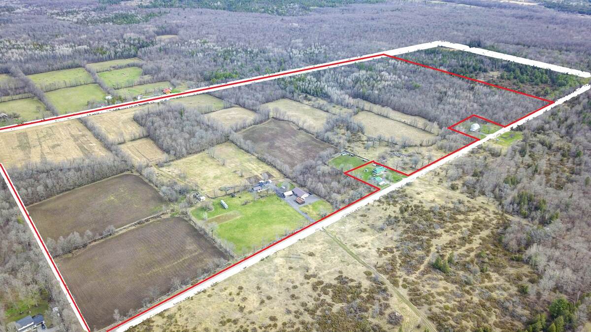 65 acres of agricultural land and aprox. 45 acres bushes with mature trees. Open concept kitchen & dining area encompasses modern cabinetry, huge quartz countertop island with farm sink, white backsplash and all brand new appliances. Entrance has wifi heated floors. Recessed lighting throughout the house. In-law suit capability. Walk-out basement with cozy wood stove. High efficiency brand new windows and doors, forced air dual oil-wood stove on Google Smart thermostat. Hardwood engineered floors. 800 sq ft deck. STARLINK internet (included). New build (2007) insulated barn (2000sqft) with hydro and water includes 5 horse stalls. Two other century barns in good condition. Insulated chicken coop, large stand of maples for making your own syrup. Video surveillance of the territory. Great hunting area. This is an absolute MUST see.