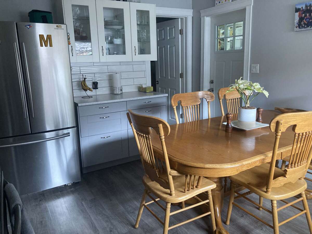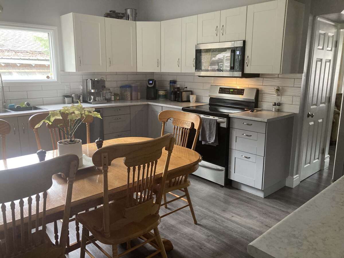 A white wavy glossy subway tile backsplash compliments the kitchen cupboards along with a few feature glass door cabinets to display your dishes. The stainless steel kitchen appliances are 6 years old and give the kitchen a modern country look.