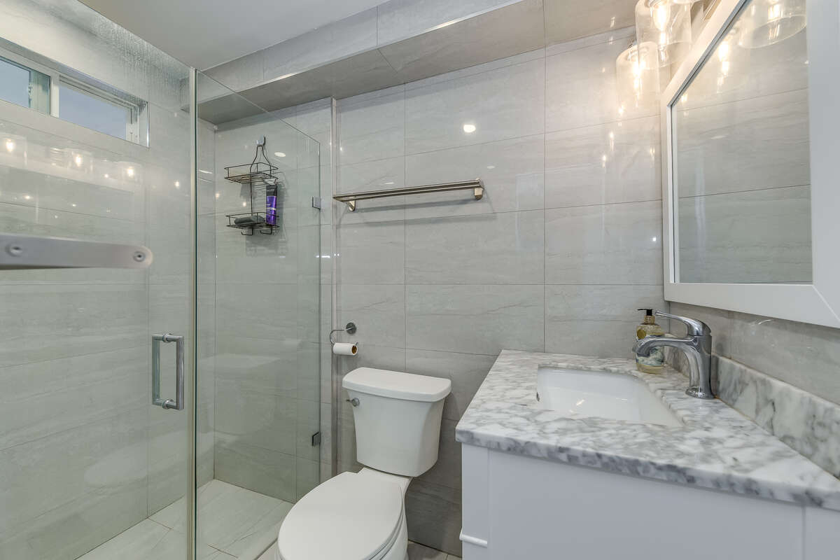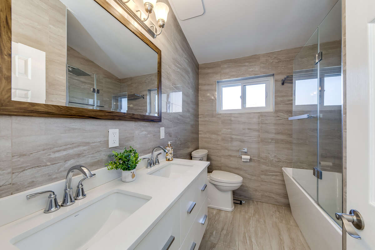 Upstairs, the primary bedroom offers vaulted ceilings with fully renovated custom-built wardrobes and bedrooms. The spa-like inspired bath includes twin floating vanities with a fully tiled shower and surrounds. The lower level provides a guest bedroom with hardwood flooring and fully tiled bathroom and surrounds, finished basement for recreation, office or gym, plus an extra room for storage or wine cellar and laundry with washer and dryer.