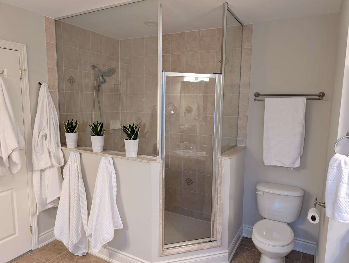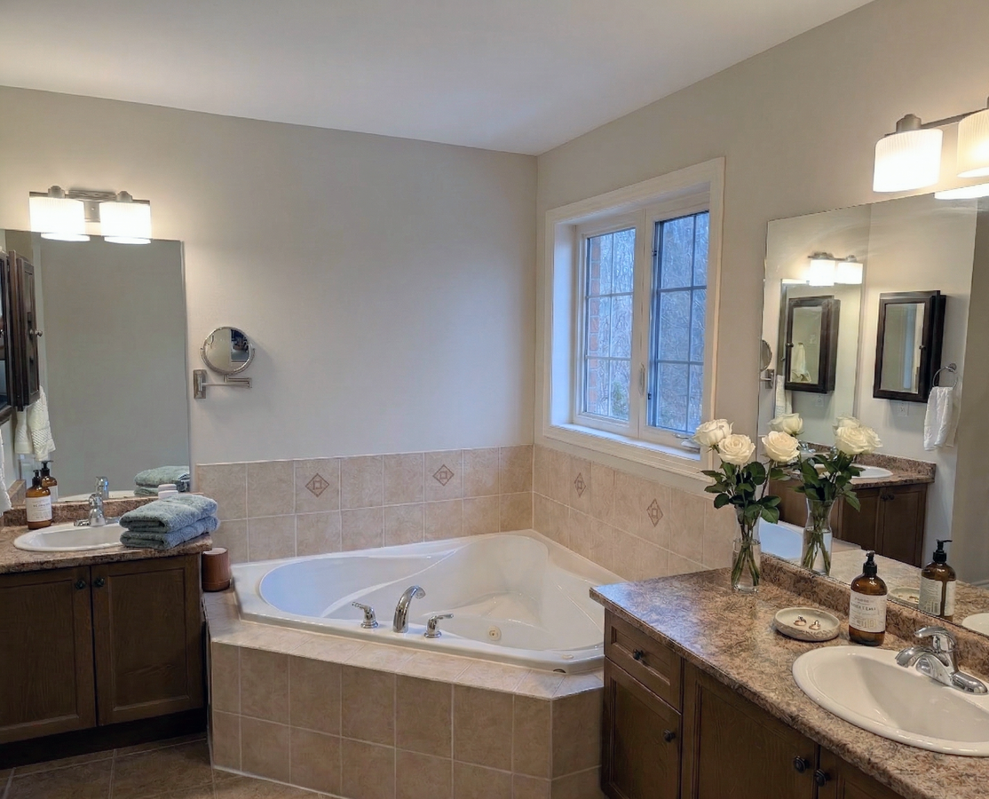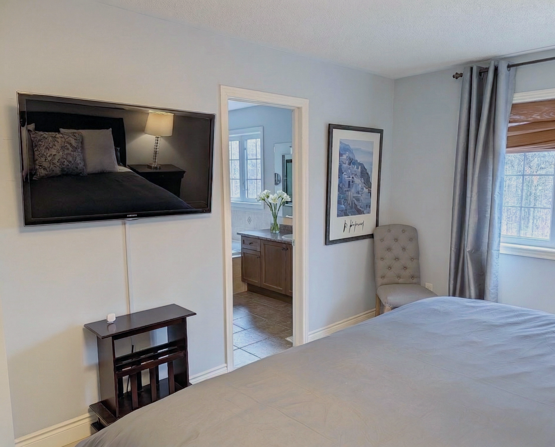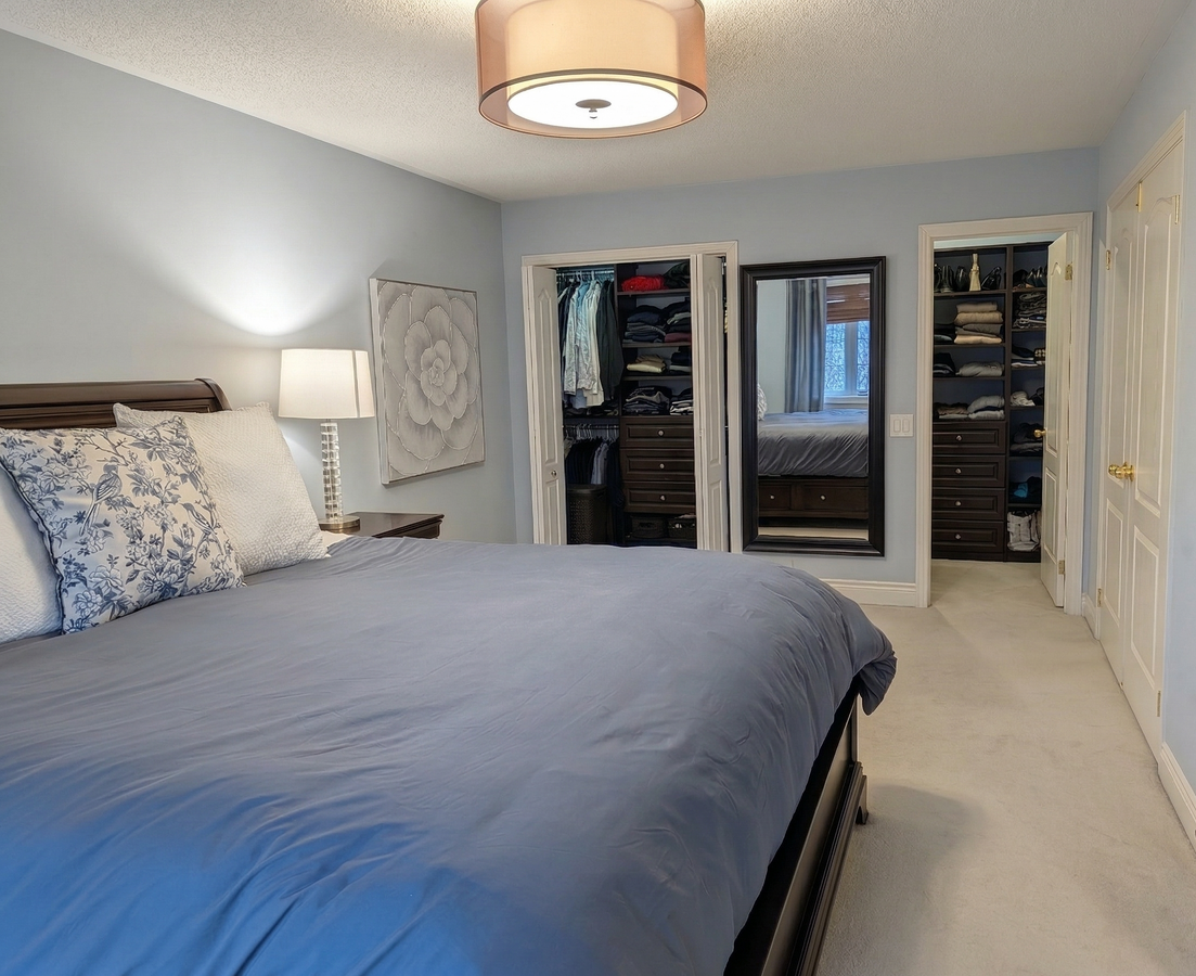 The upper level offers a large Primary Suite with a 5-piece ensuite, Jacuzzi tub, glass shower his/her vanities and his/her closets with custom closet organizers. Three additional generous bedrooms include a second private ensuite—ideal for guests or extended family.