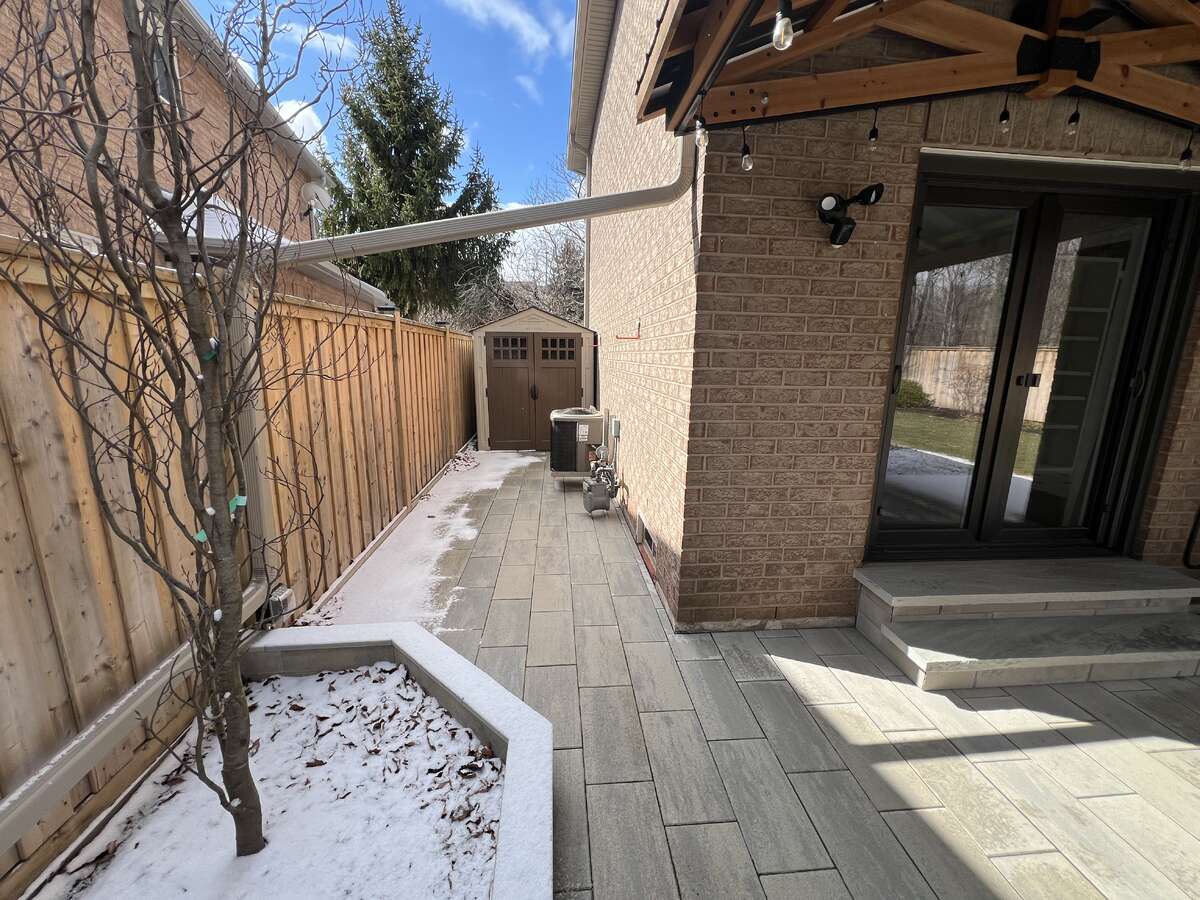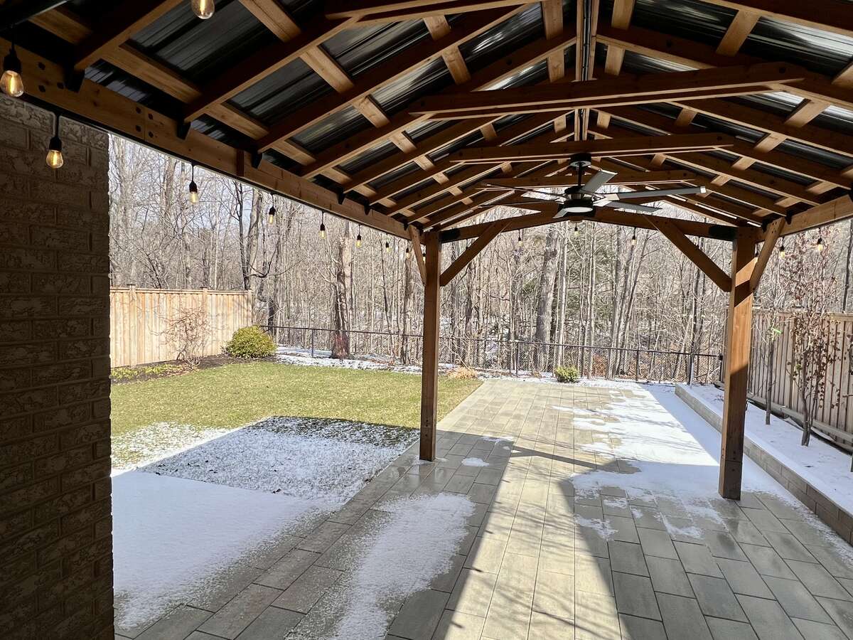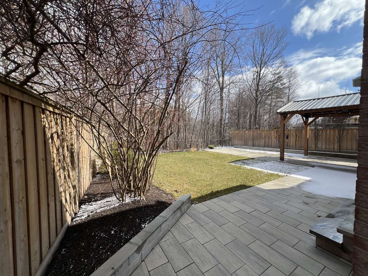 Beautifully landscaped backyard (2023) featuring new interlock paving, gazebo, and fencing (2019) — all backing onto a quiet, dense ravine with trails