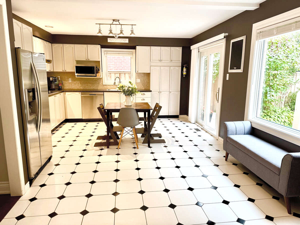 Large patio doors from both kitchen and dining areas allow seamless indoor-outdoor flow to the backyard