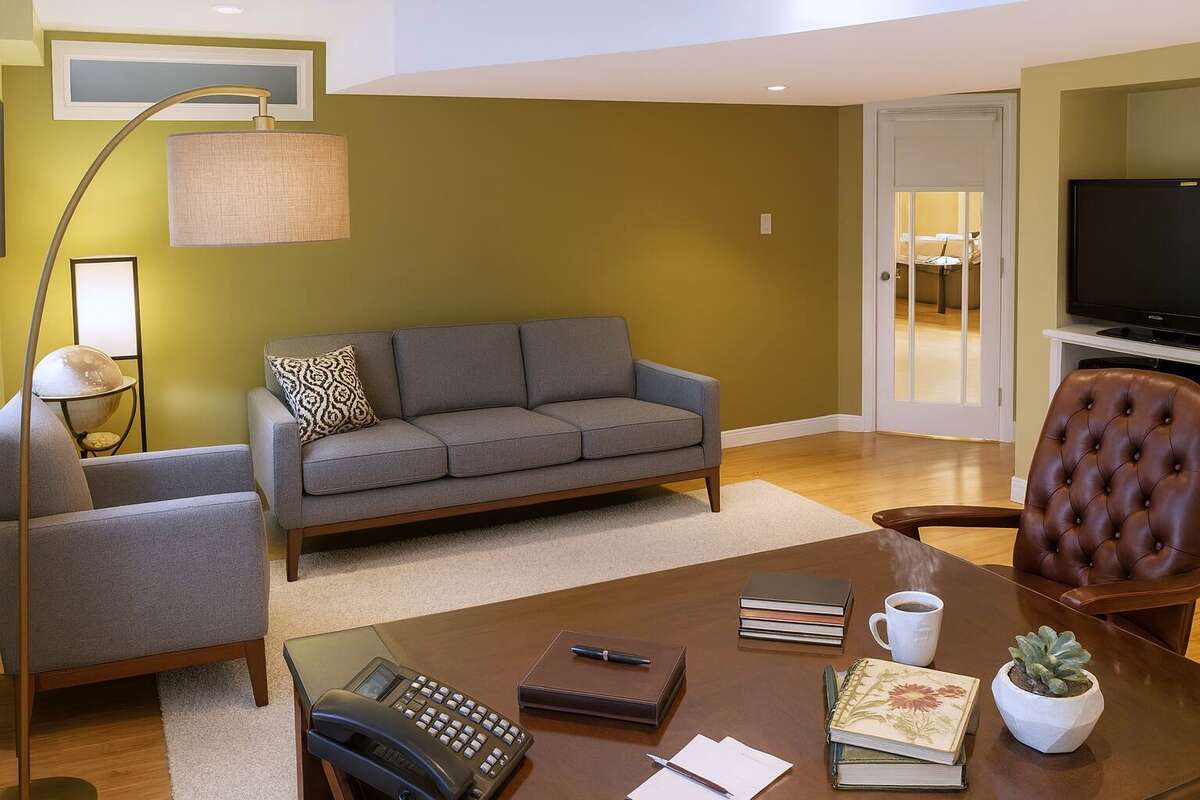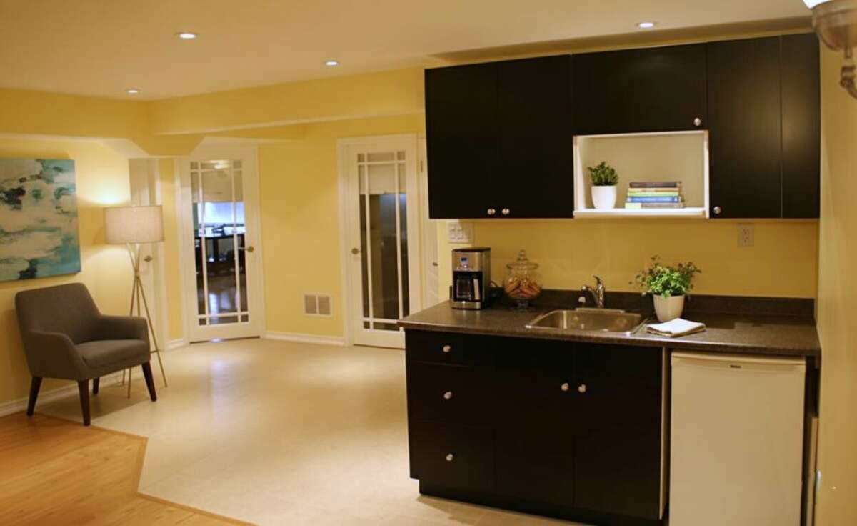 The "Quiet Zone" Escape the world in the cozy but bright basement with built-ins and features designed to optimize natural light coming through large south-facing windows. Engineered for silence and privacy, this "home within a home" features soundproofing insulation and solid plywood sub-floors to mitigate noise along with a kitchenette and full bathroom. Use it as a quiet workspace, study space, in-law suite, media den or a combination of all.