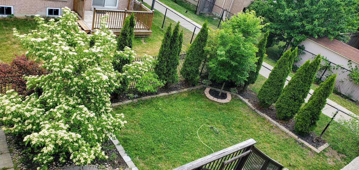 Outdoor Living Step out to your private backyard sanctuary. Professionally landscaped with mature native trees and perennials that bloom through the spring, summer and fall, this space offers a natural privacy screen and a low-maintenance composite deck—perfect for summer BBQs; as well as a backyard shed for additional storage.
