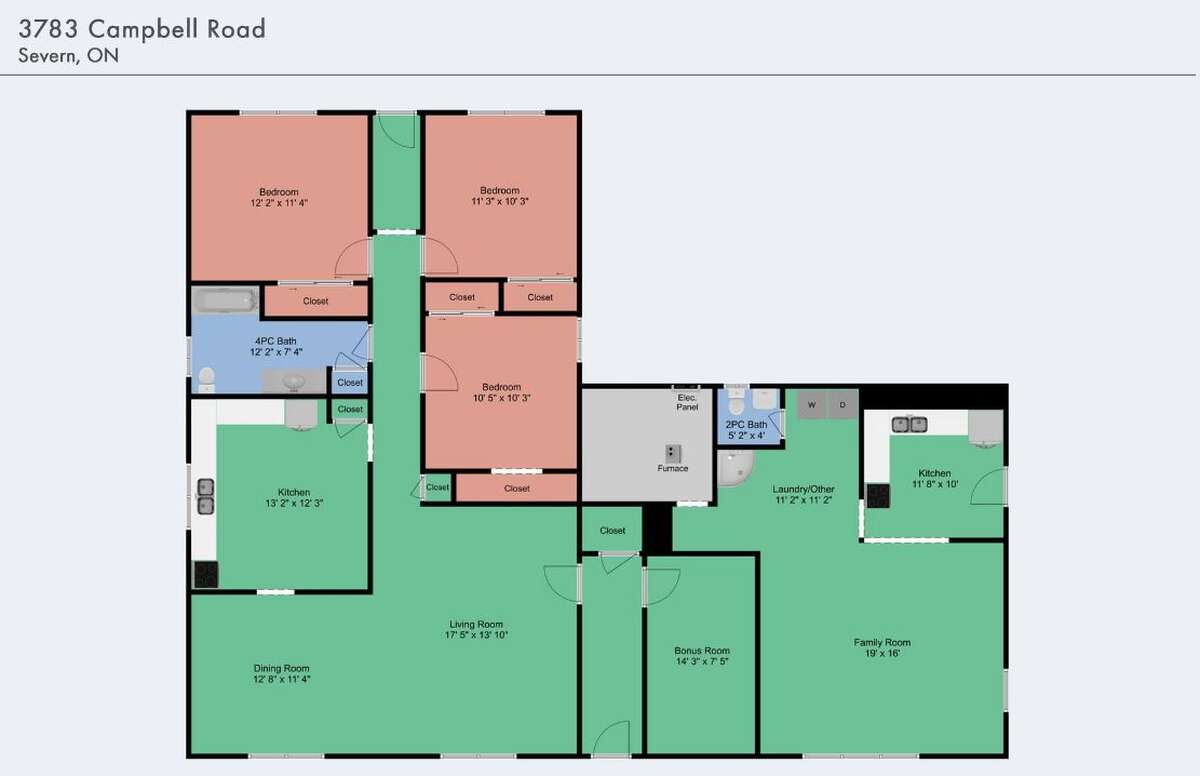 Welcome to 3783 Campbell Road, a rare opportunity to own a high-visibility, C4-zoned property in Severn, just minutes from Orillia and the gateway to cottage country. This brick-built 4-bedroom, 2-bathroom bungalow offers approximately 2,000 sq. ft. of living space on a generous 0.25-acre lot (100' × 265'), with both front and back road access and direct exposure to thousands of travelers daily along Highway 11. Perfect for families, investors, or entrepreneurs looking for a unique live/work opportunity in a high-exposure location.