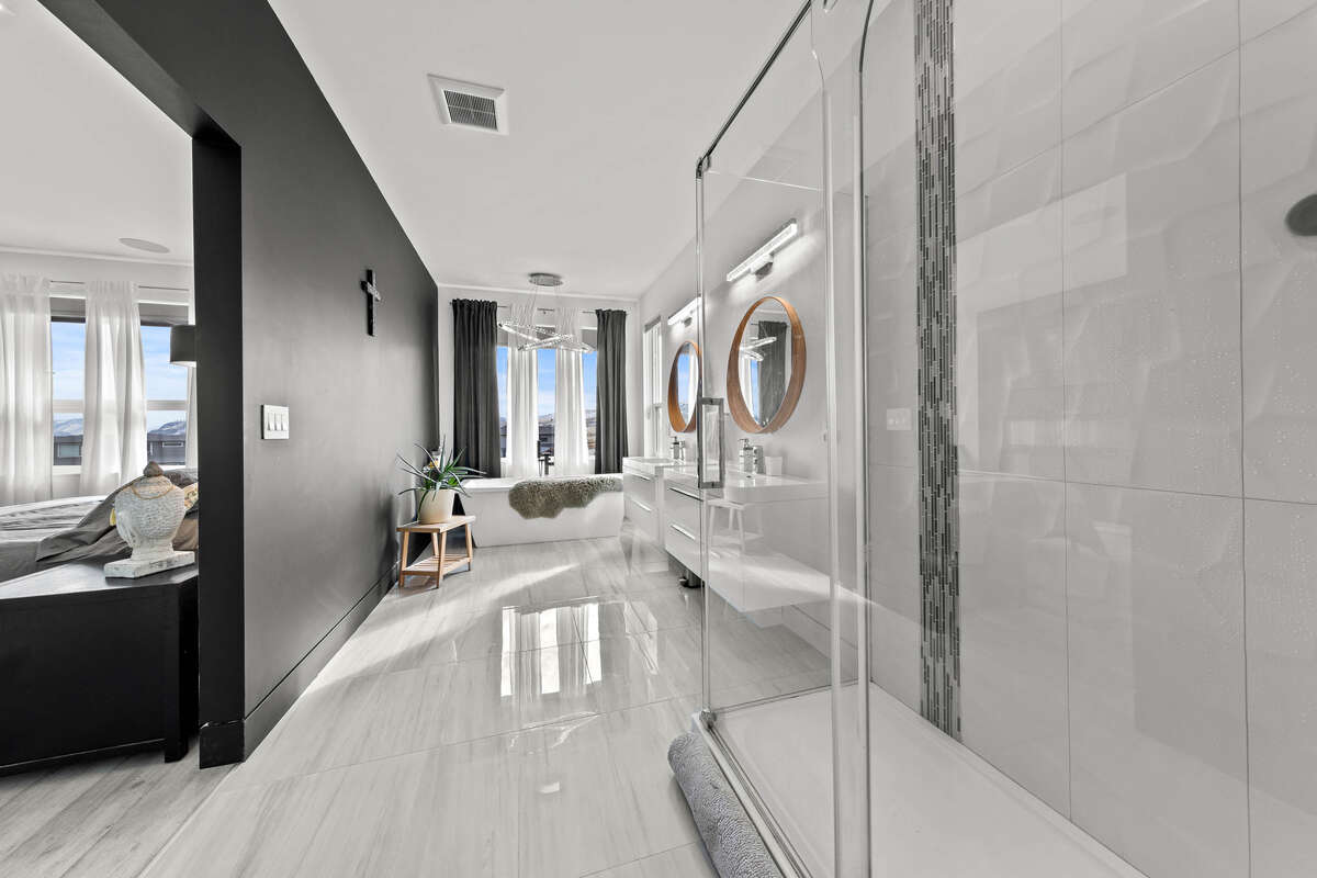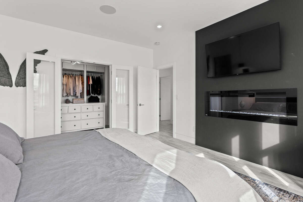 The upper level offers a luxurious primary suite with a cozy fireplace, walk-in closet, and spa-like ensuite with floating vanities, a soaker tub, and a walk-in shower. Two additional spacious bedrooms, a full bathroom, and a conveniently located laundry room complete the floor.