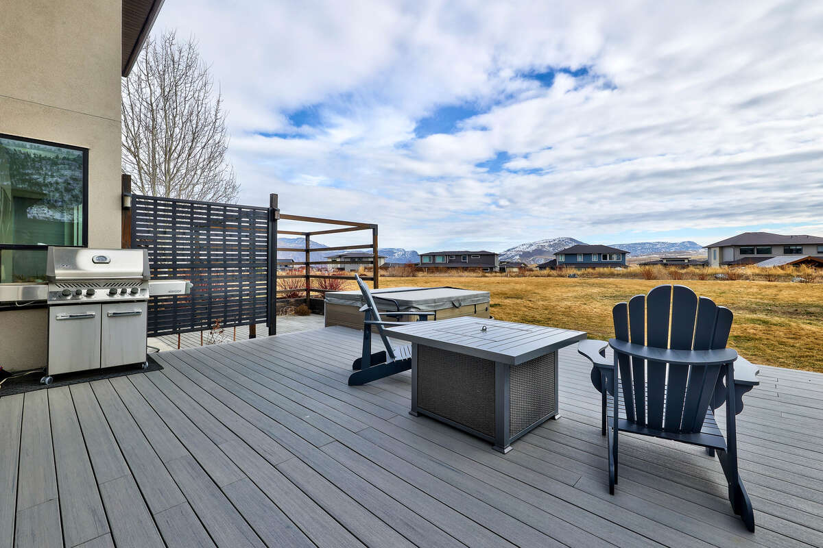 The outdoor space is equally impressive, with a newly installed composite patio and deck offering expansive views, a smart underground irrigation system, and mature landscaping with raspberries, roses, and hydrangeas.